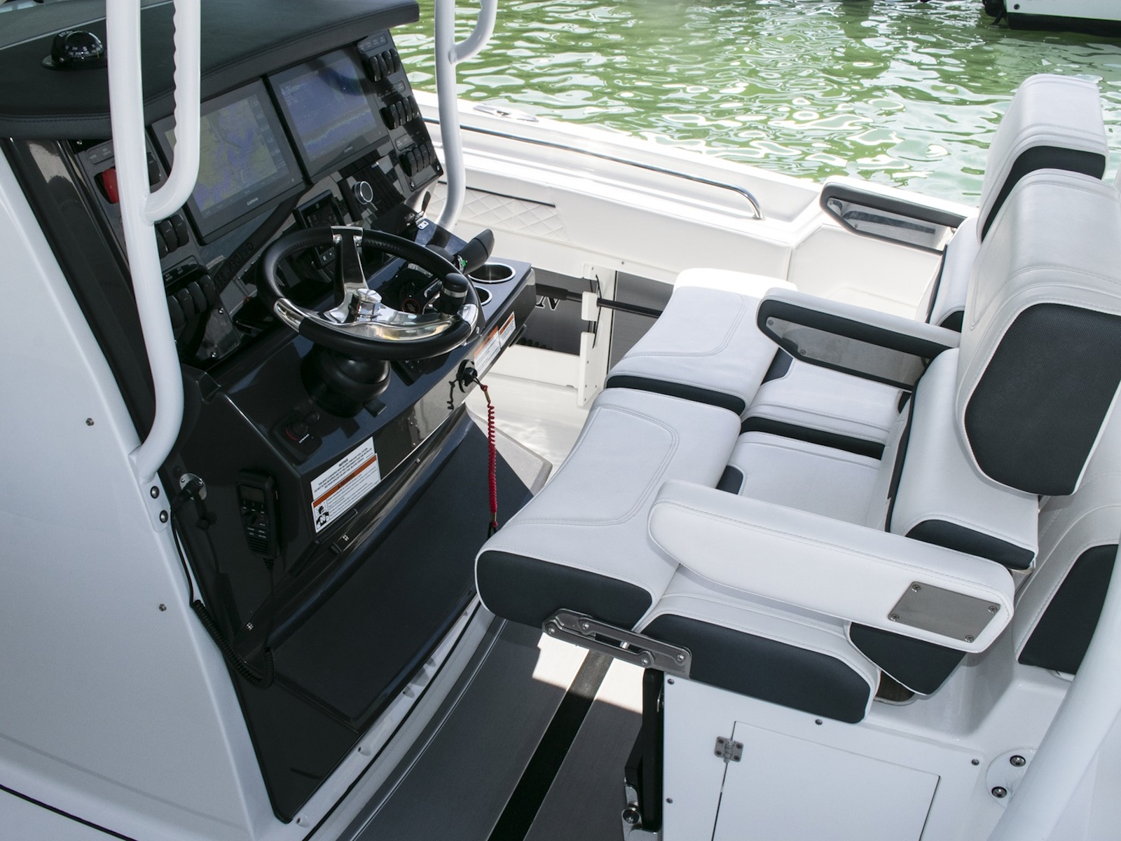 Featuring a 10’0” beam, and LOA with engines of 32’8”, the 302CC has an open, and well-designed layout making it the perfect choice for offshore fishing, recreational activities or destination boating. With an extensive choice of Mercury engines, and featuring a double stepped hull designed by Michael Peters Yacht Design, the 302CC offers one of the smoothest and most efficient rides in its class.
