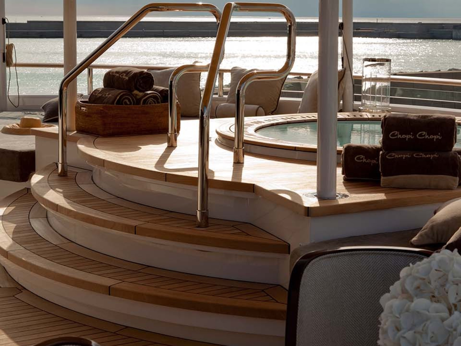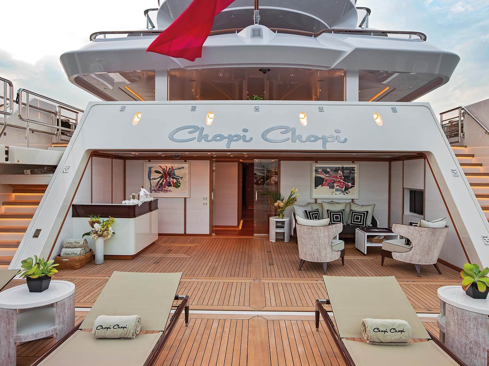 A perfect balance of classic and contemporary style, elegance and refinement, with the unmistakable, original touch added by the use of precious materials. Chopi Chopi is a bespoke 80-metre steel and aluminium megayacht. Designed to the owner´s vision, she is conceived as an immensely spacious family home, an airy ambience where everything revolves around on-board wellbeing. The result is a beautiful harmony of classic and contemporary style. The sense of elegant refinement is set off with strategically positioned original artworks.