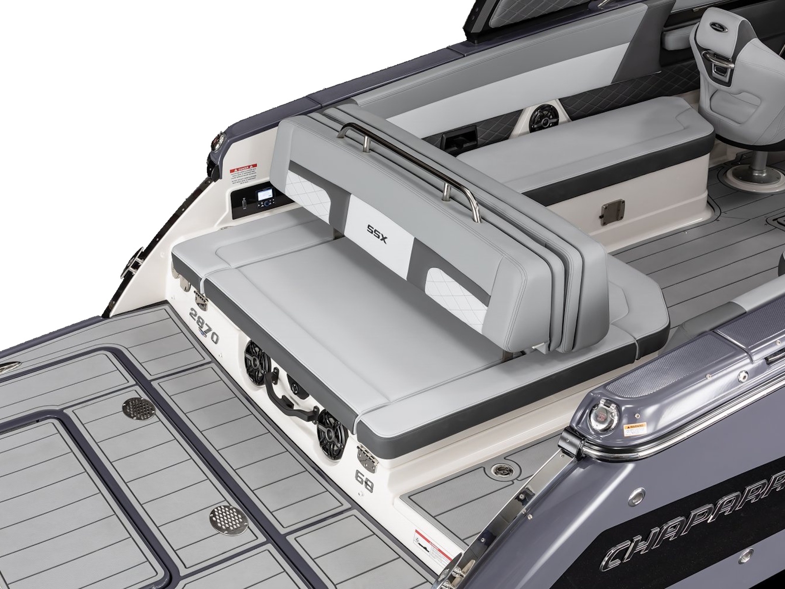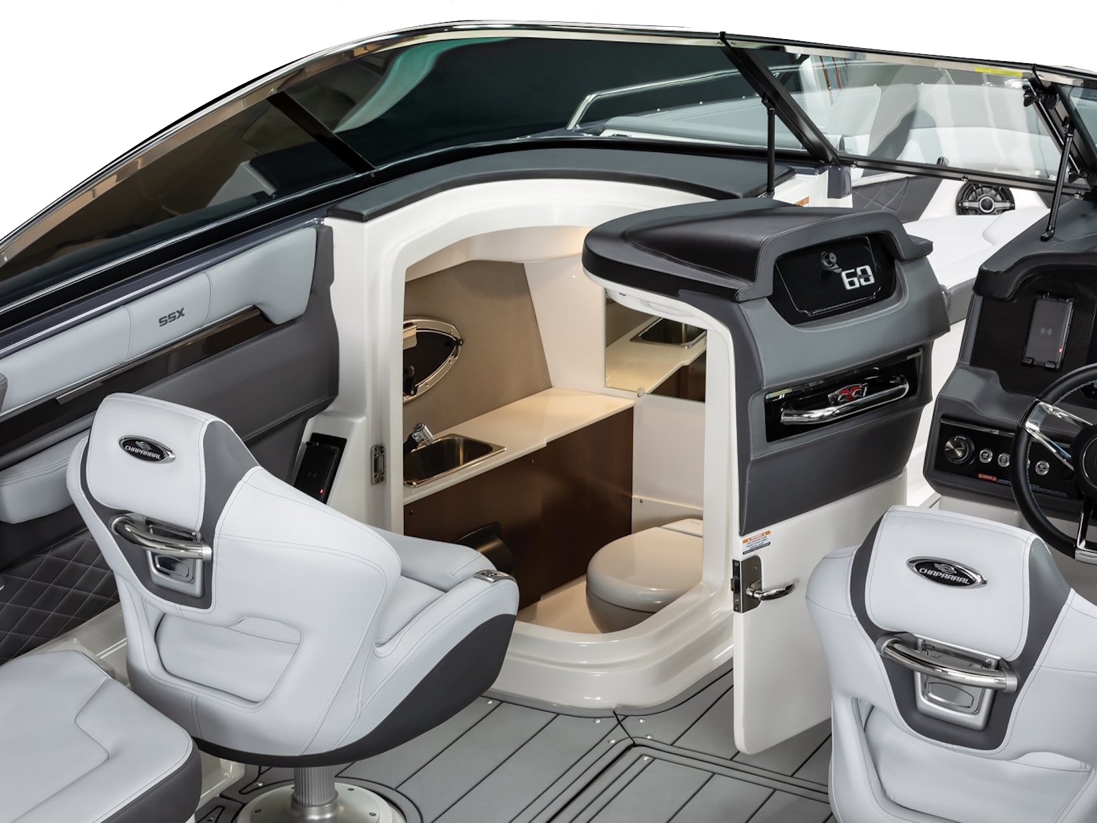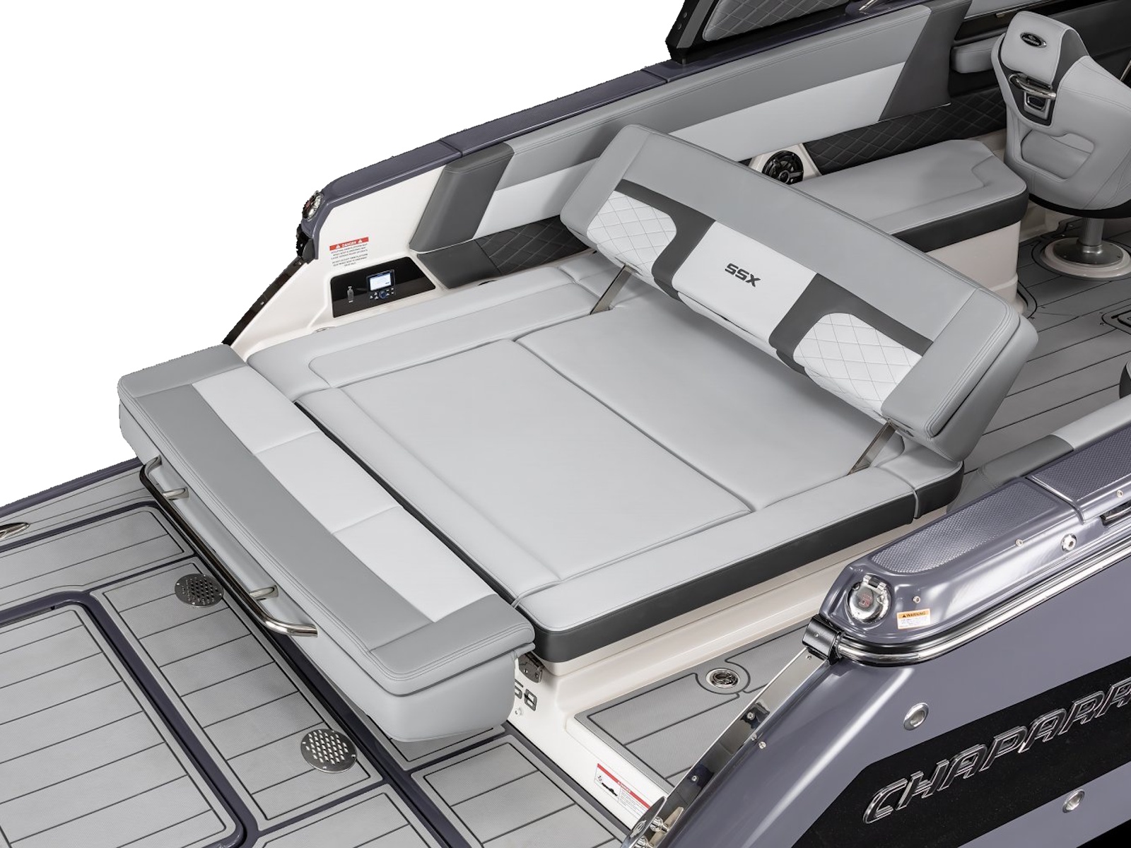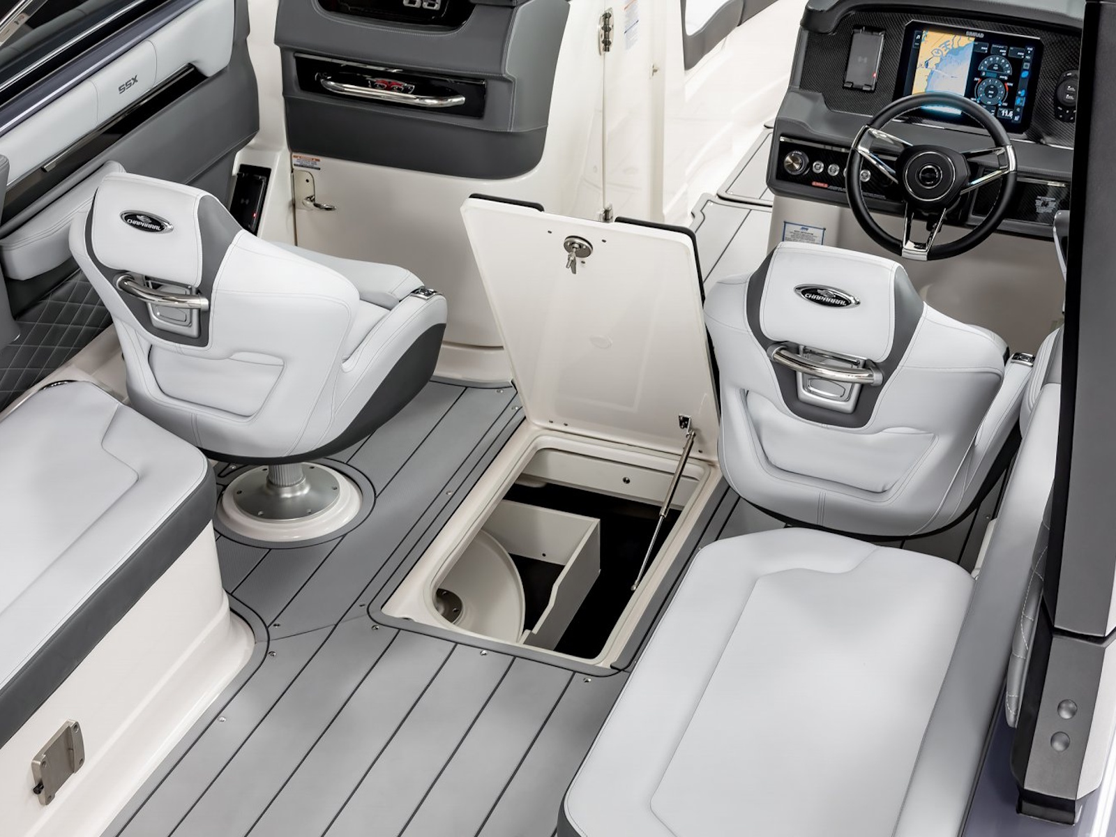 What sets the SSX 8 apart from the competition is the perfect balance of design and performance that Chaparral has achieved with this boat. With a responsive throttle and extended V-Plane hull, the SSX 8 glides effortlessly across the water while relaxing on premium silicone upholstery. With a furnished head, built-in coolers, and the patented Infinity Power Step, a day of boating becomes hassle-free.