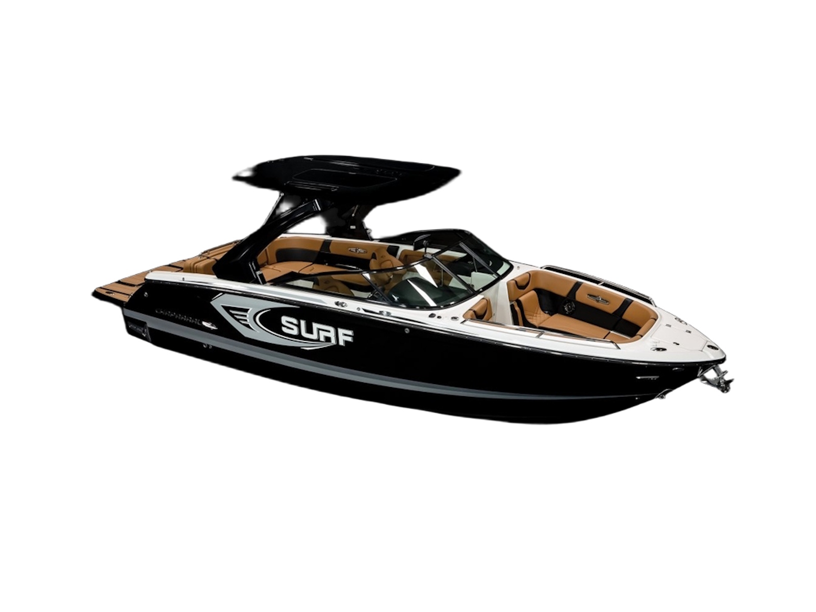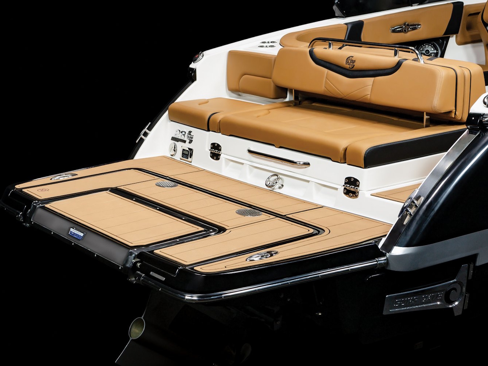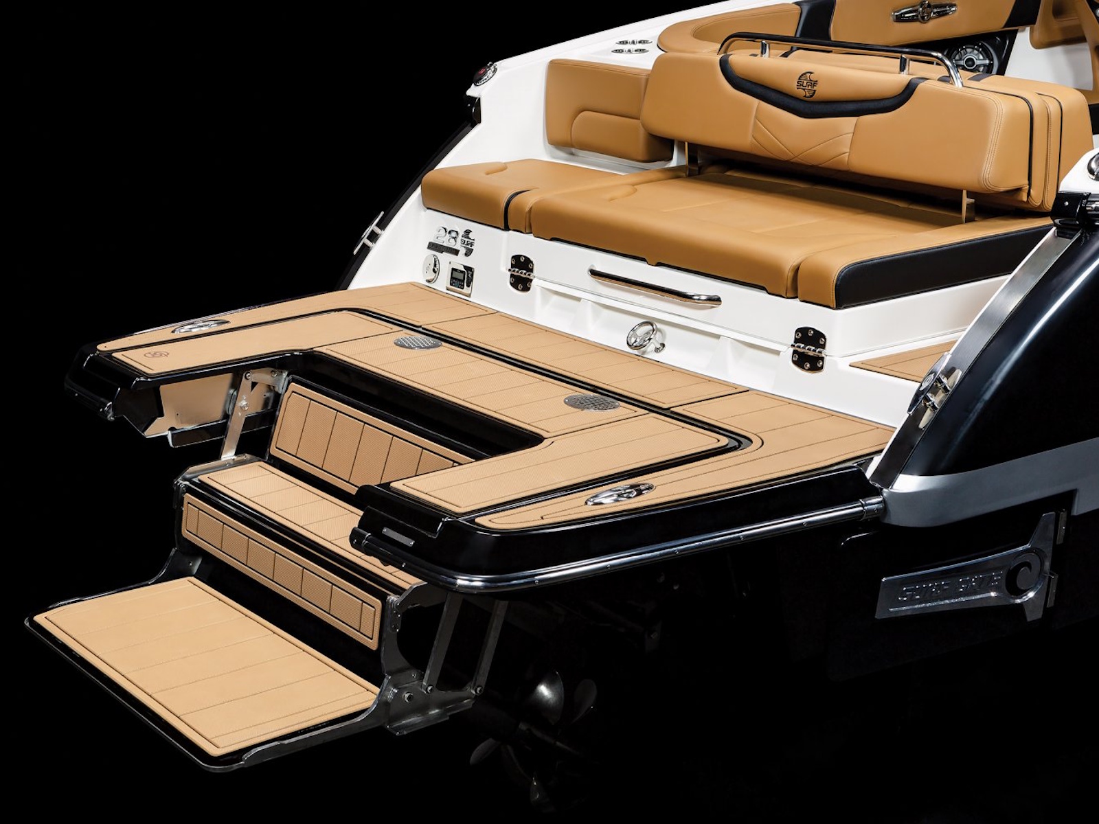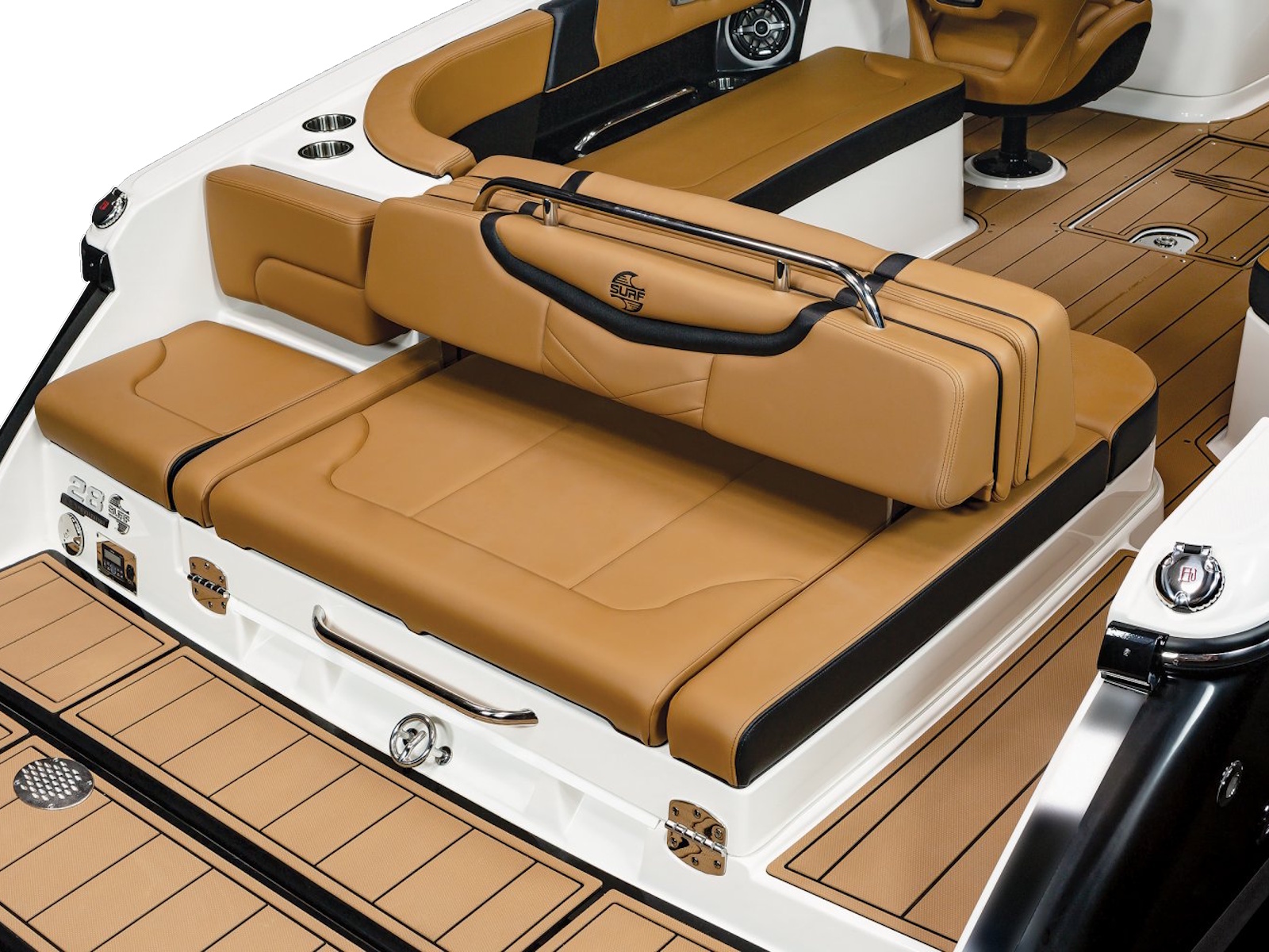 The 28 Surf is available with our most popular package ever - the Black Edition. The Black Edition package elevates the entire boating experience and all starts with premium Black Gelcoated Hullsides and Hullbottom paired with black metal finishes around the windshield. Moving to the interior, the new soft Silicone Cayenne interior with black accents will surely turn heads.