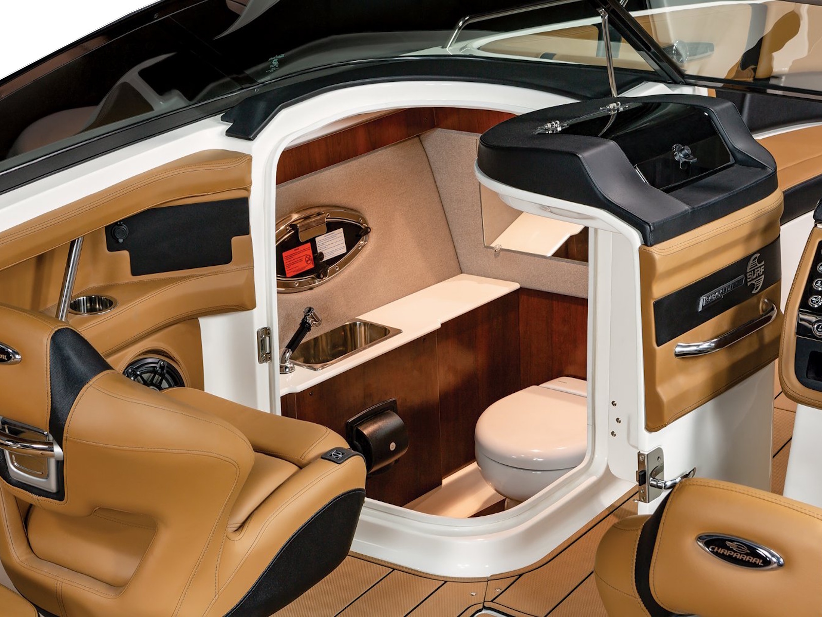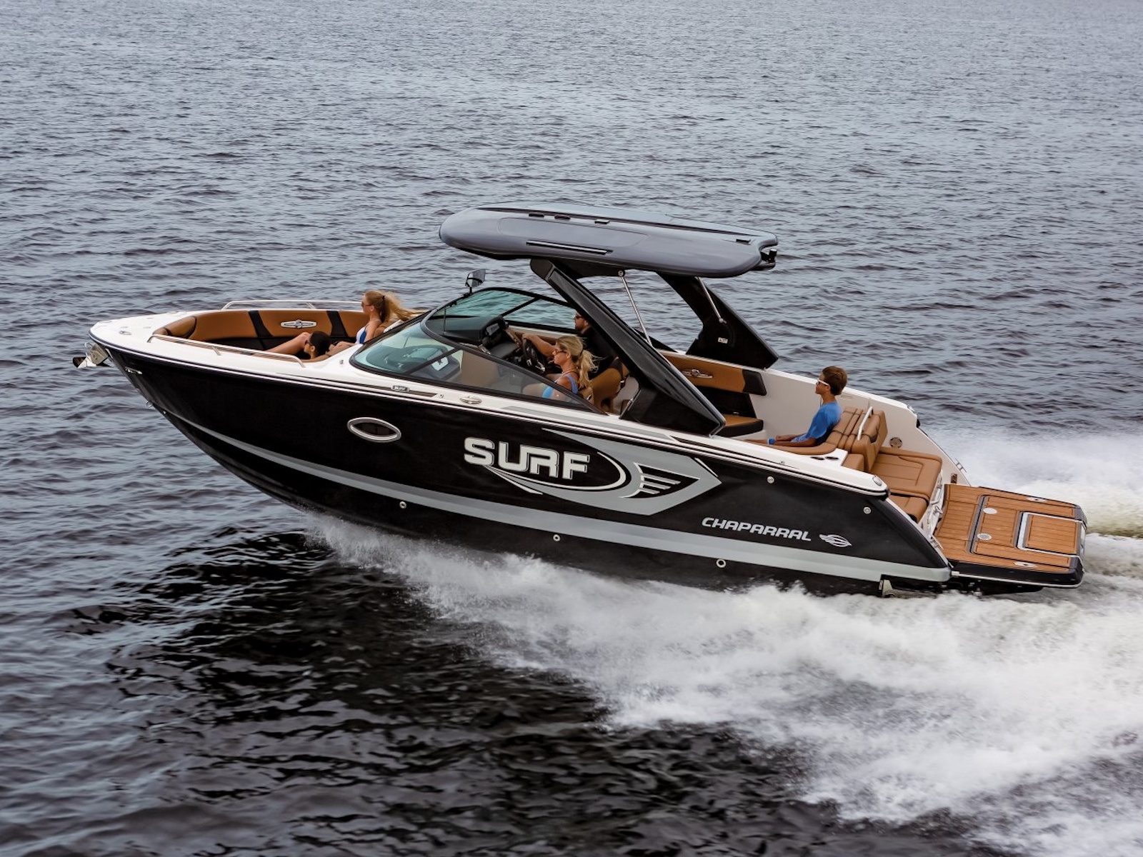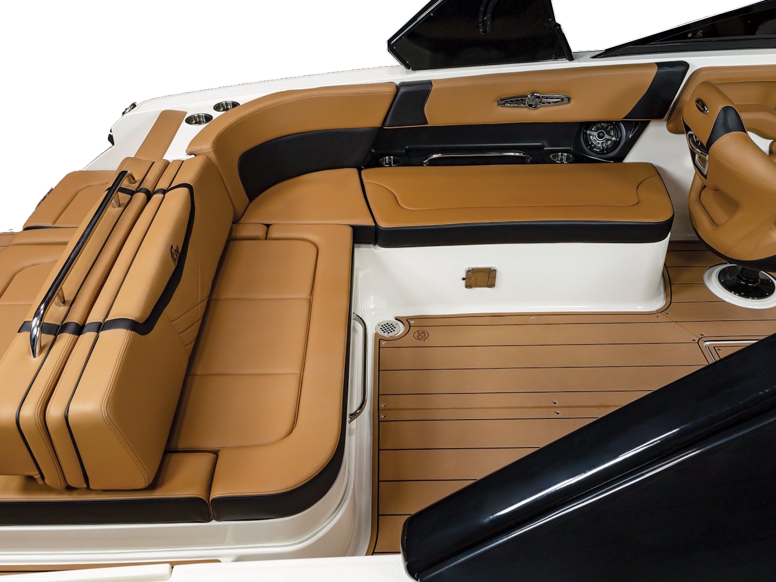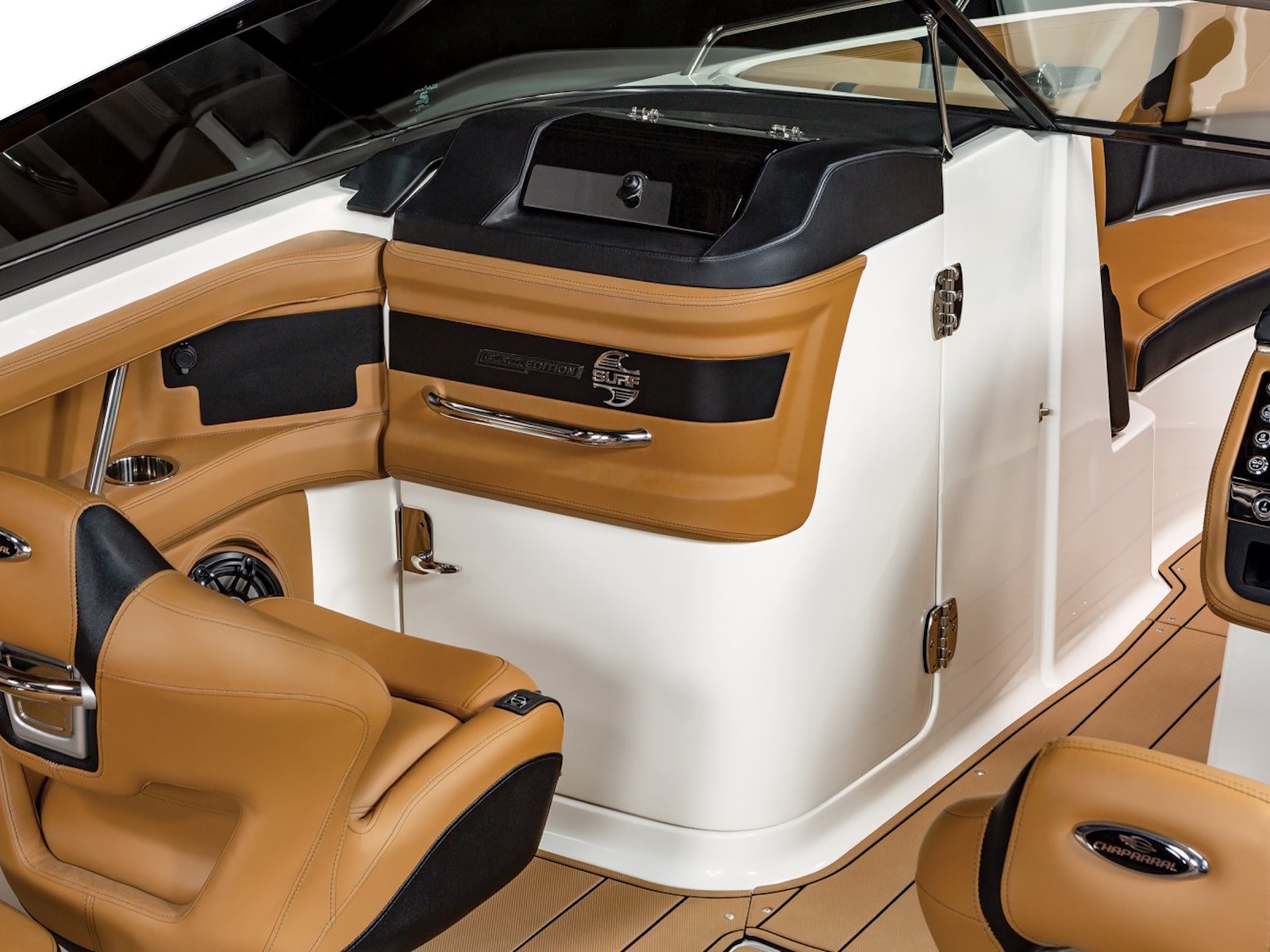 The 28 Surf is available with our most popular package ever - the Black Edition. The Black Edition package elevates the entire boating experience and all starts with premium Black Gelcoated Hullsides and Hullbottom paired with black metal finishes around the windshield. Moving to the interior, the new soft Silicone Cayenne interior with black accents will surely turn heads.