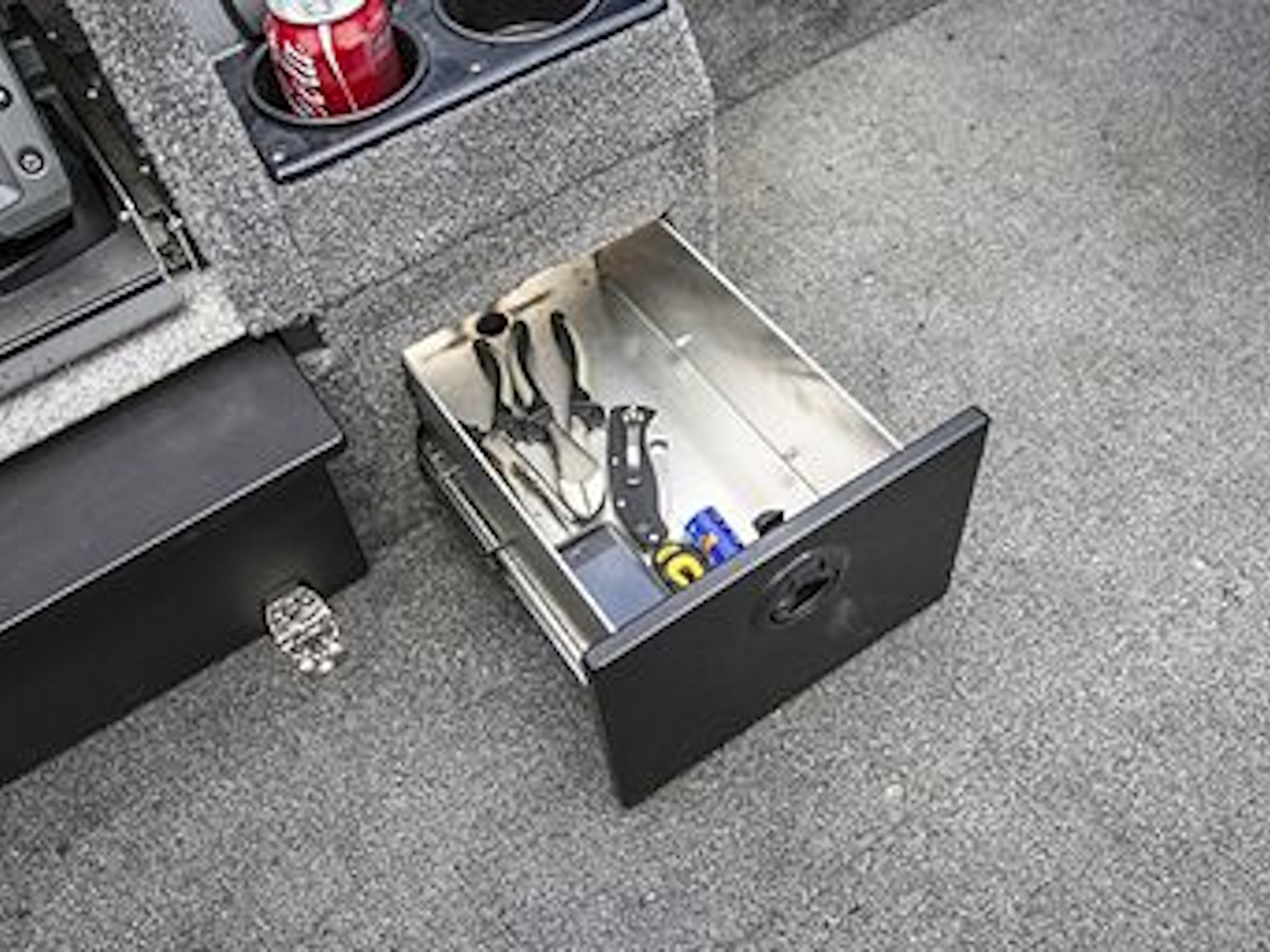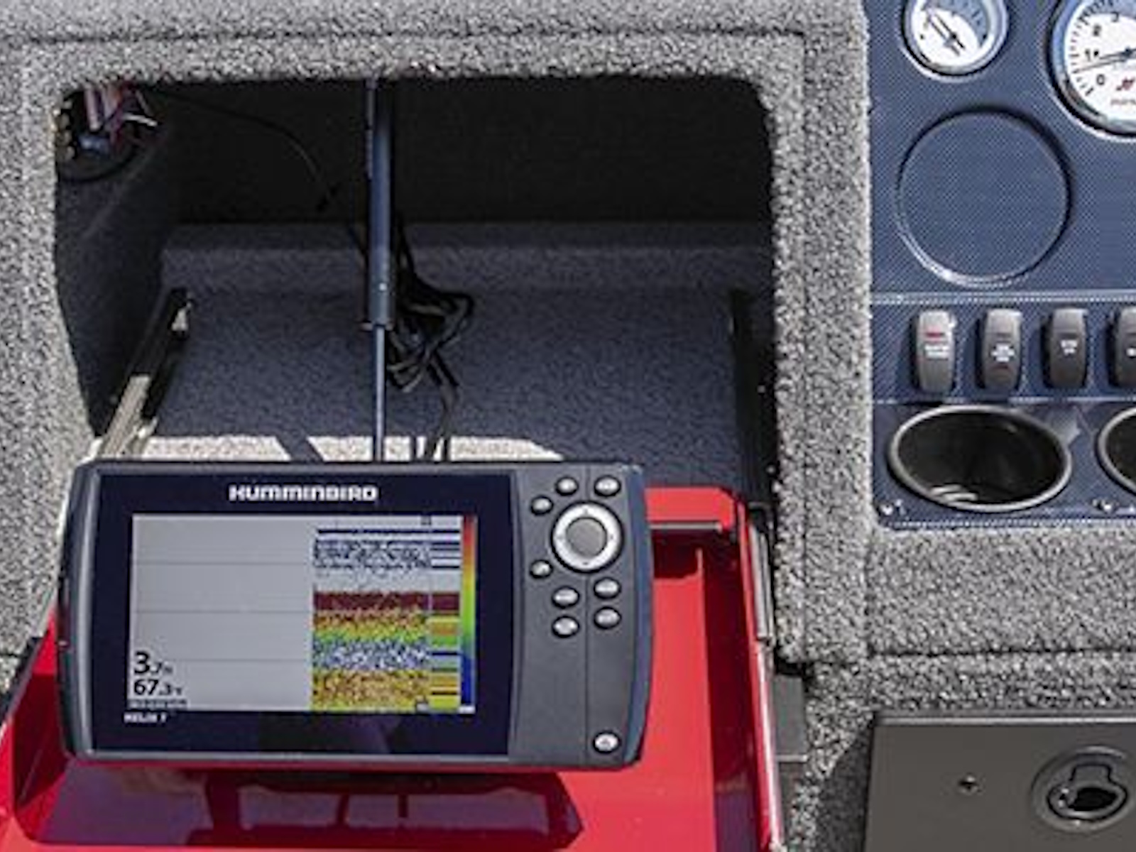 • The durable, intuitive command console puts an electronics tray, drink holders and tackle storage all within the driver’s reach.