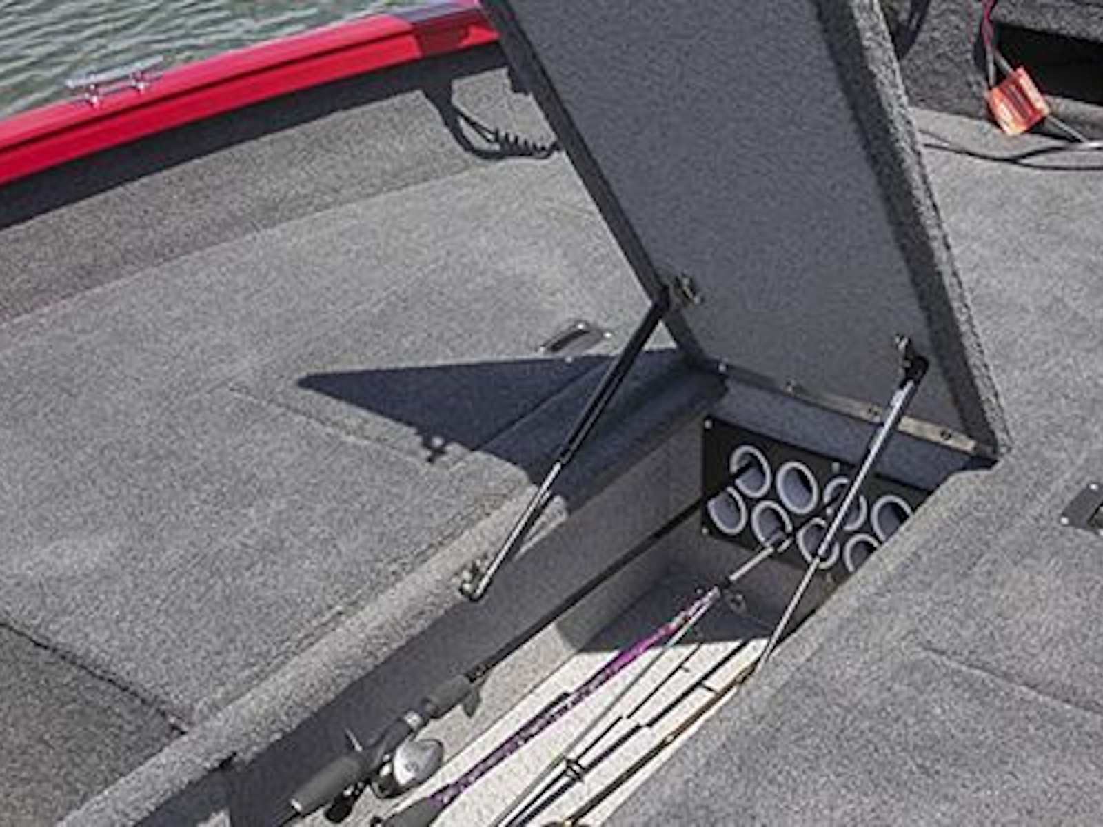 • Starboard rod storage holds 8’ rods, while topside rod straps hold additional rods.
