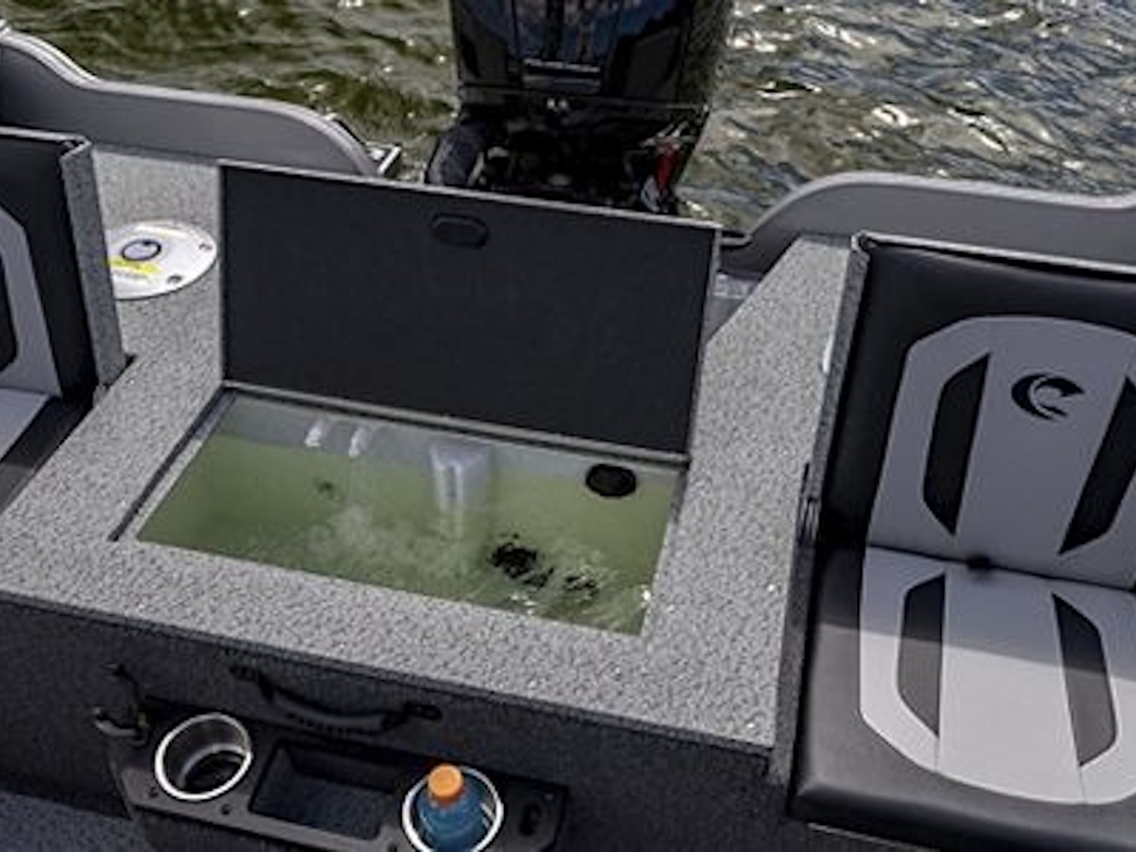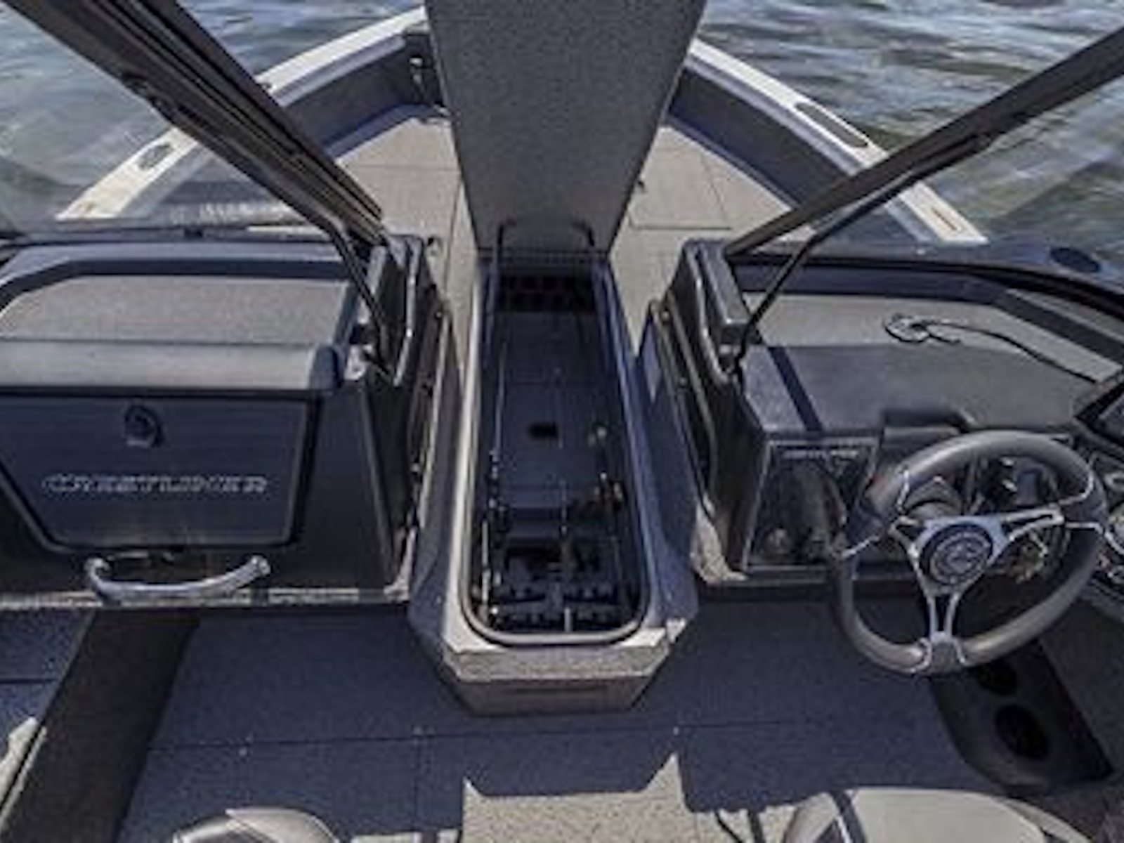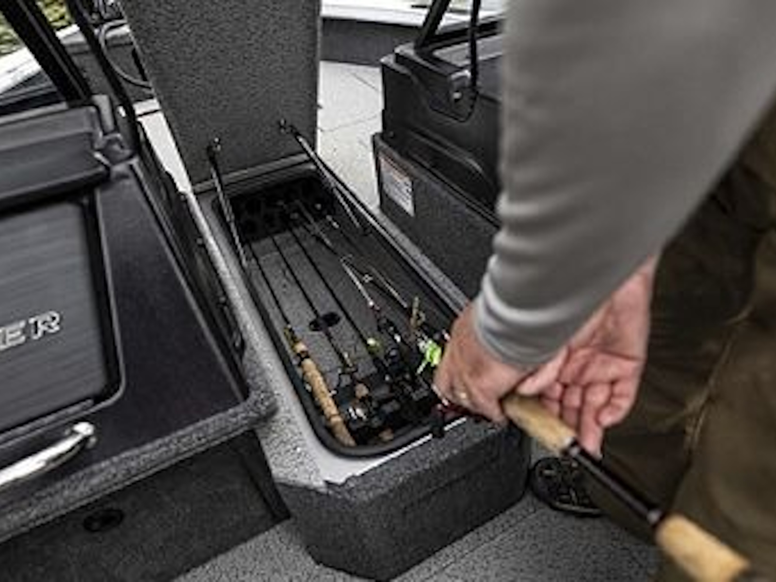 - Trolling motor battery & charger storage (36V-compatible) under center rod locker