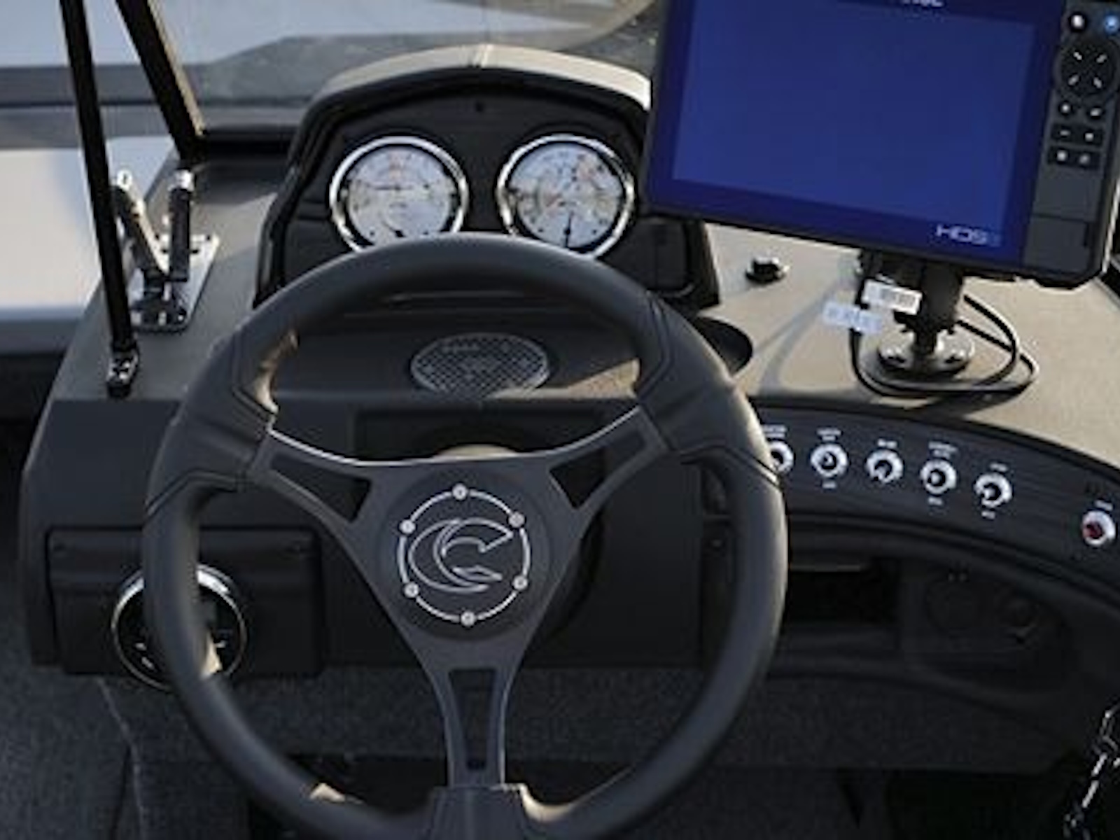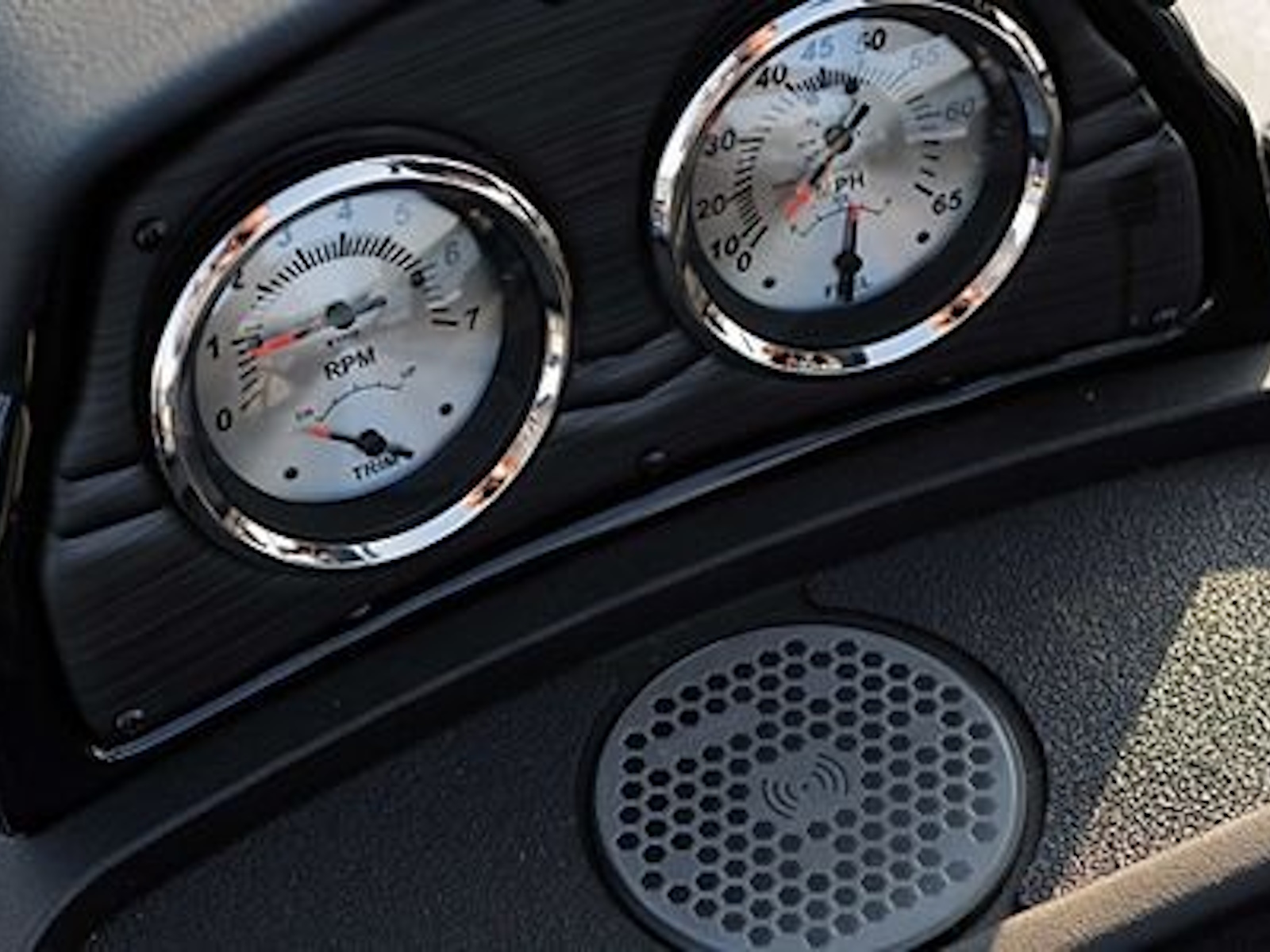 - A sleek console features chrome gauges, lighted rocker switches, USB-C outlet, throw tray, phone charger, tool holder and plenty of space to mount all size of electronics