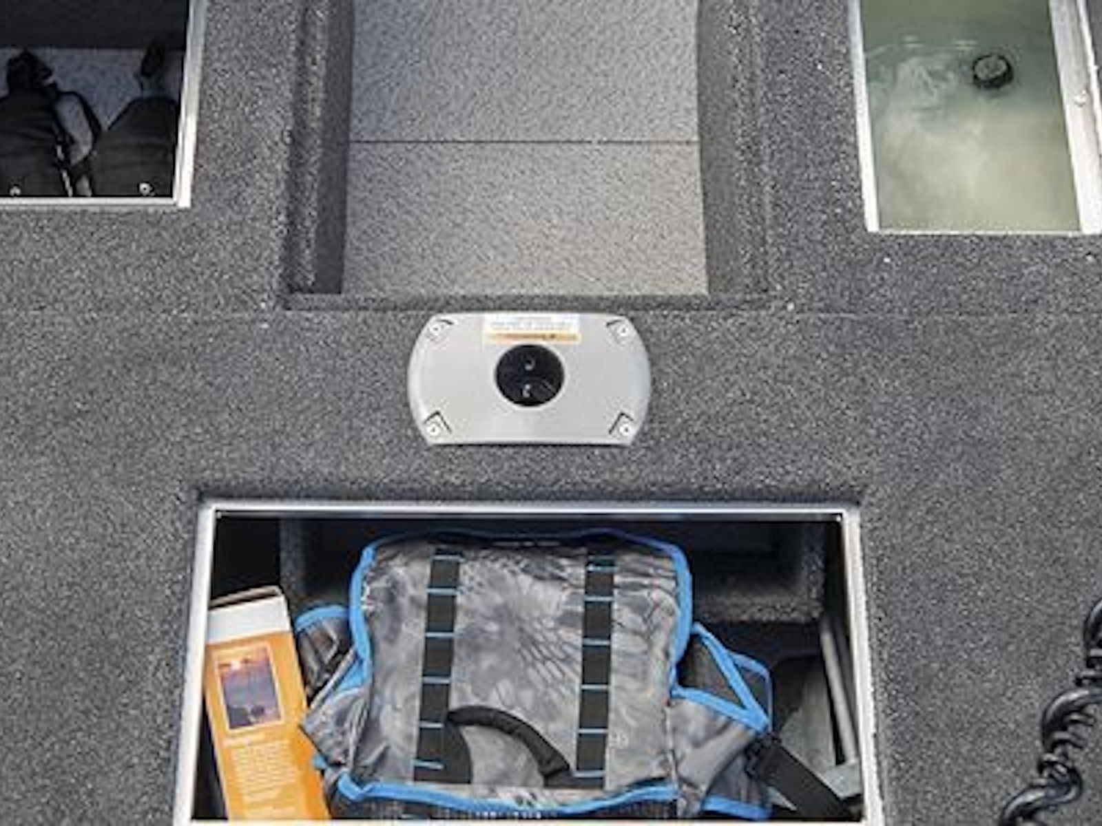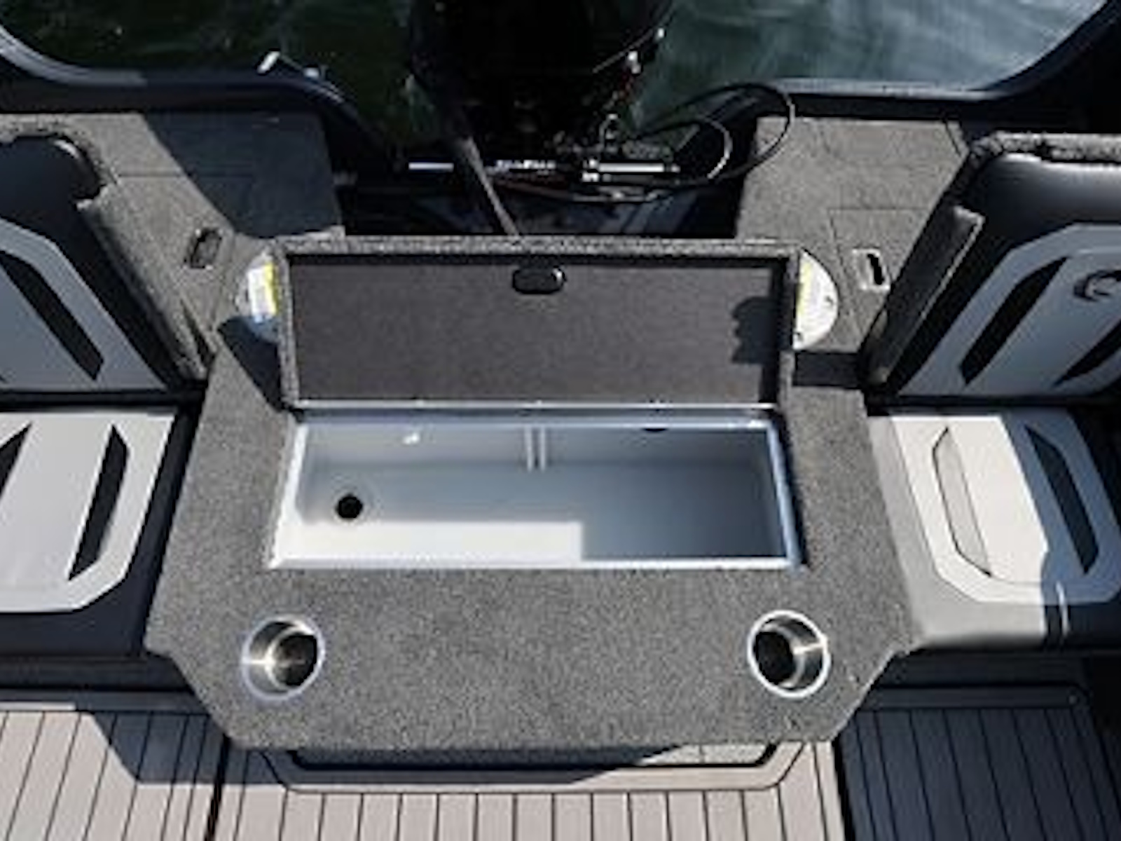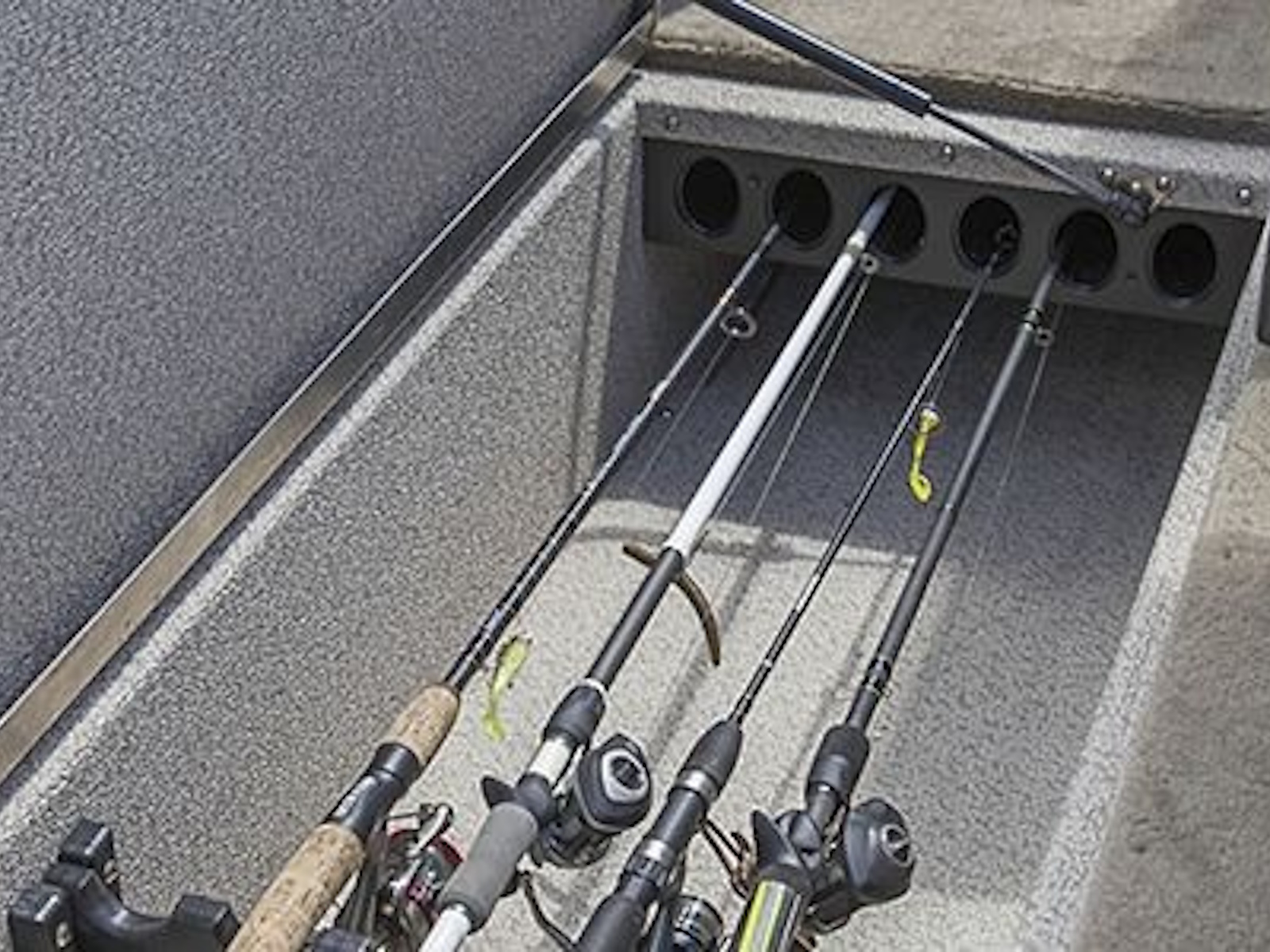 - The high-capacity center in-floor storage locker provides ample space for all your watersports gear, complete with a rod rack tube system that accommodates 8’ rods.