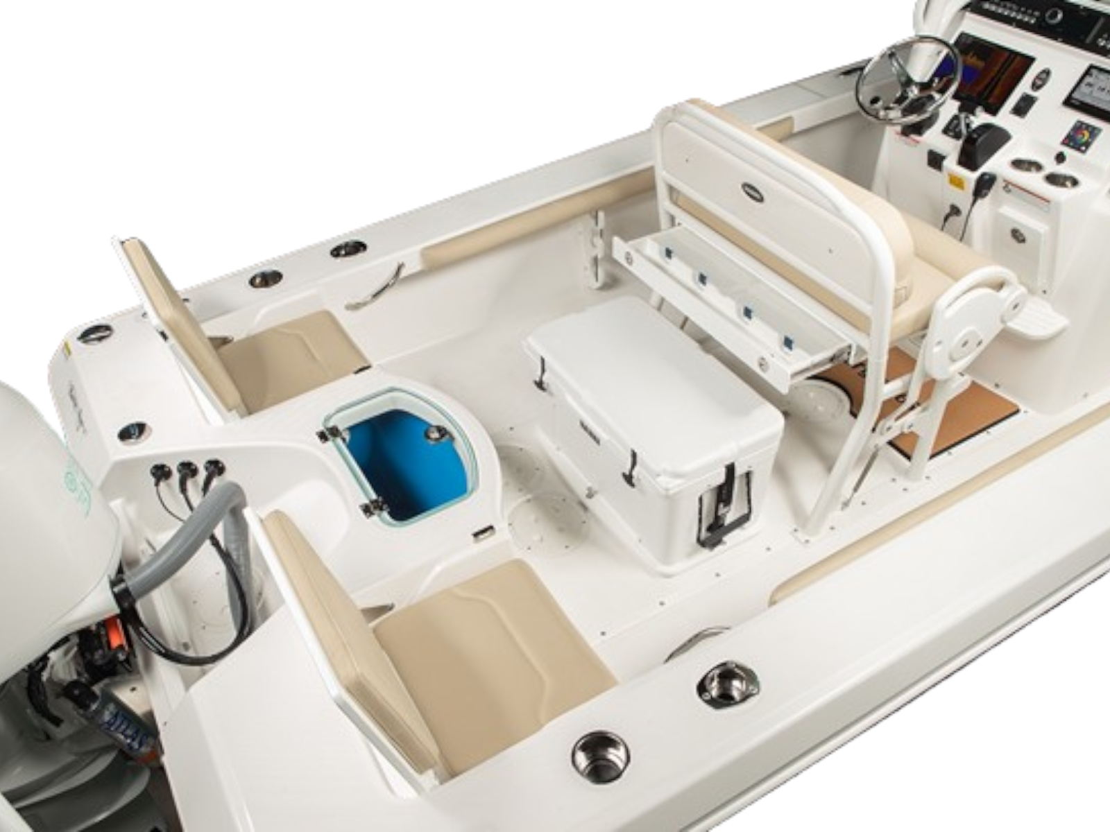 The low-profile, powder-coated bow rails and pop-up cleats combine with the casting platform/bow seating to make cast-netting live bait a breeze! The most comfortable place to sit on any boat while underway is the stern and the 243cc provides two incredible foldaway seats on either side of the livewell. When not in use, fold the seatbacks down to use the huge aft casting deck. So, whether you want to fish the back country or run 30 miles offshore, the 243cc can satisfy your requirements. This boat is guaranteed to spoil you!