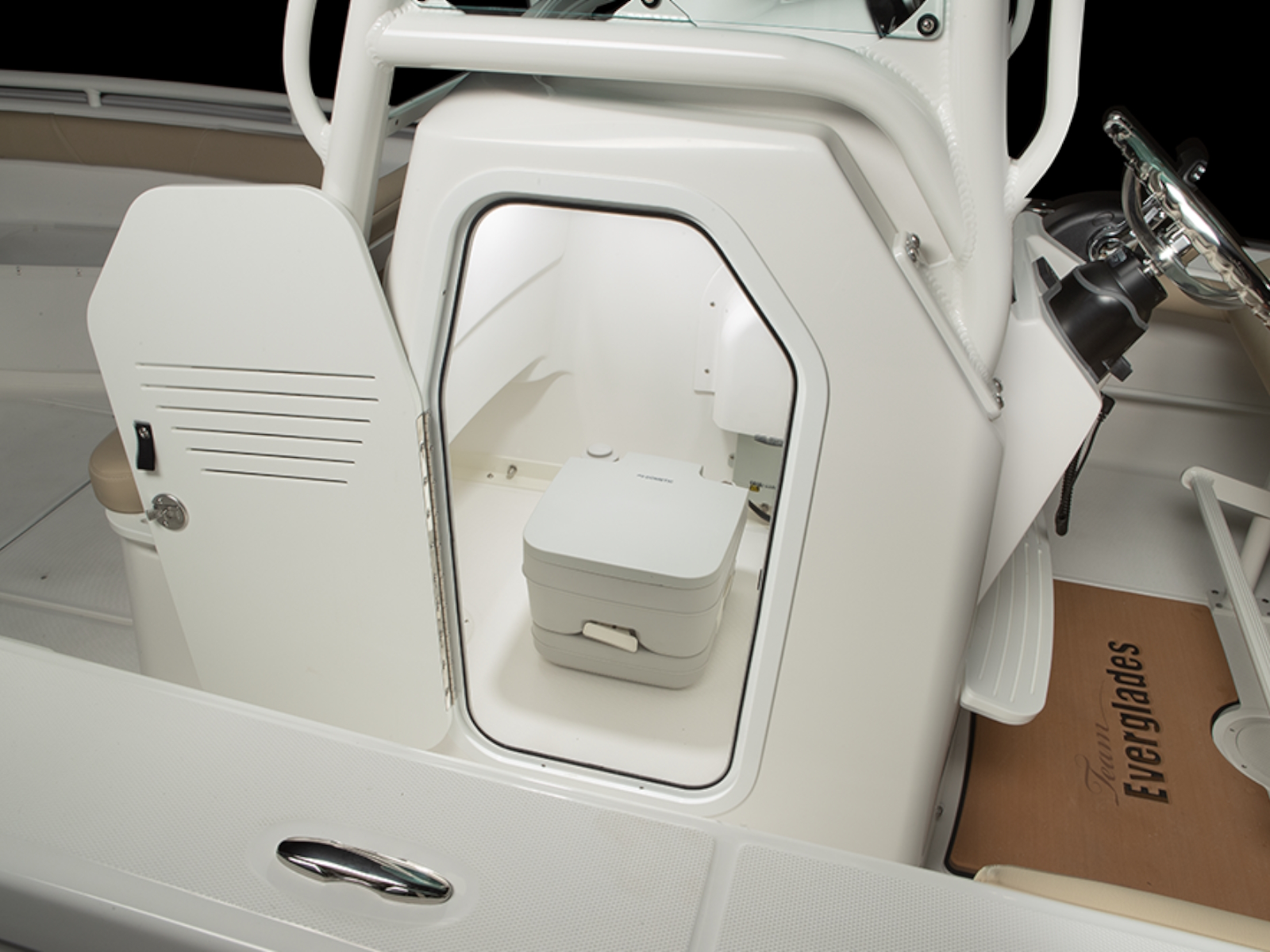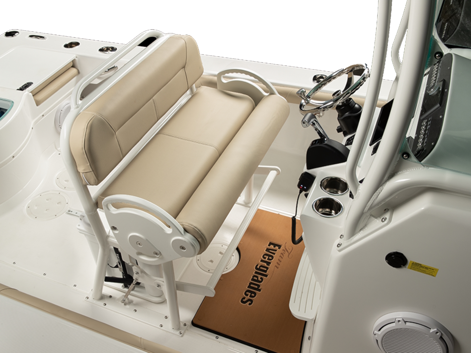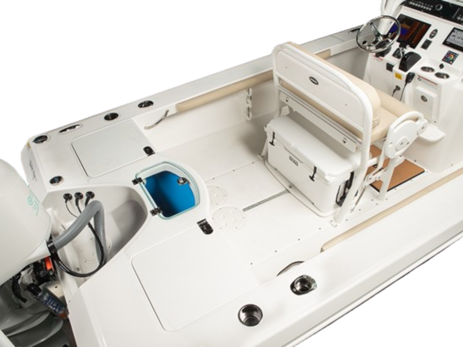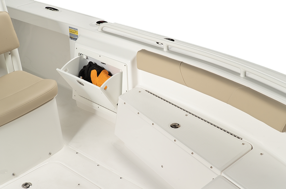 - Molded-in fiberglass footrest at the helm