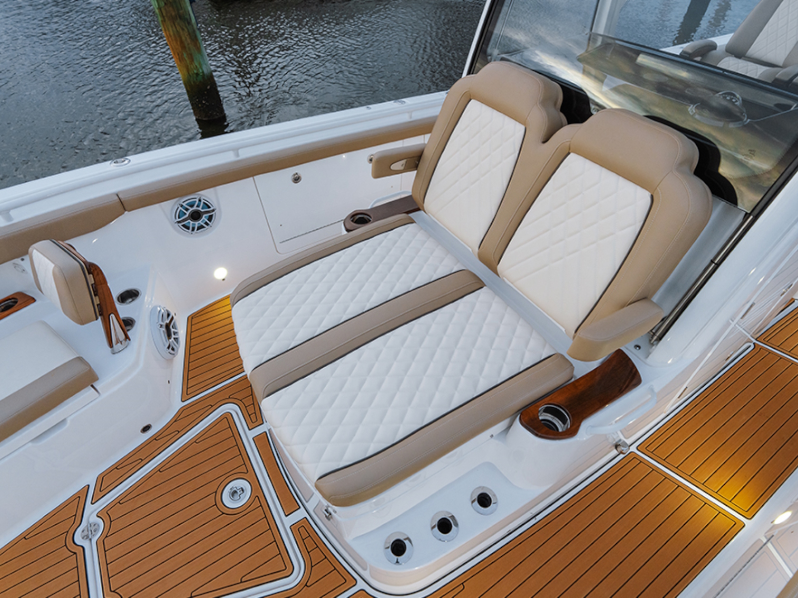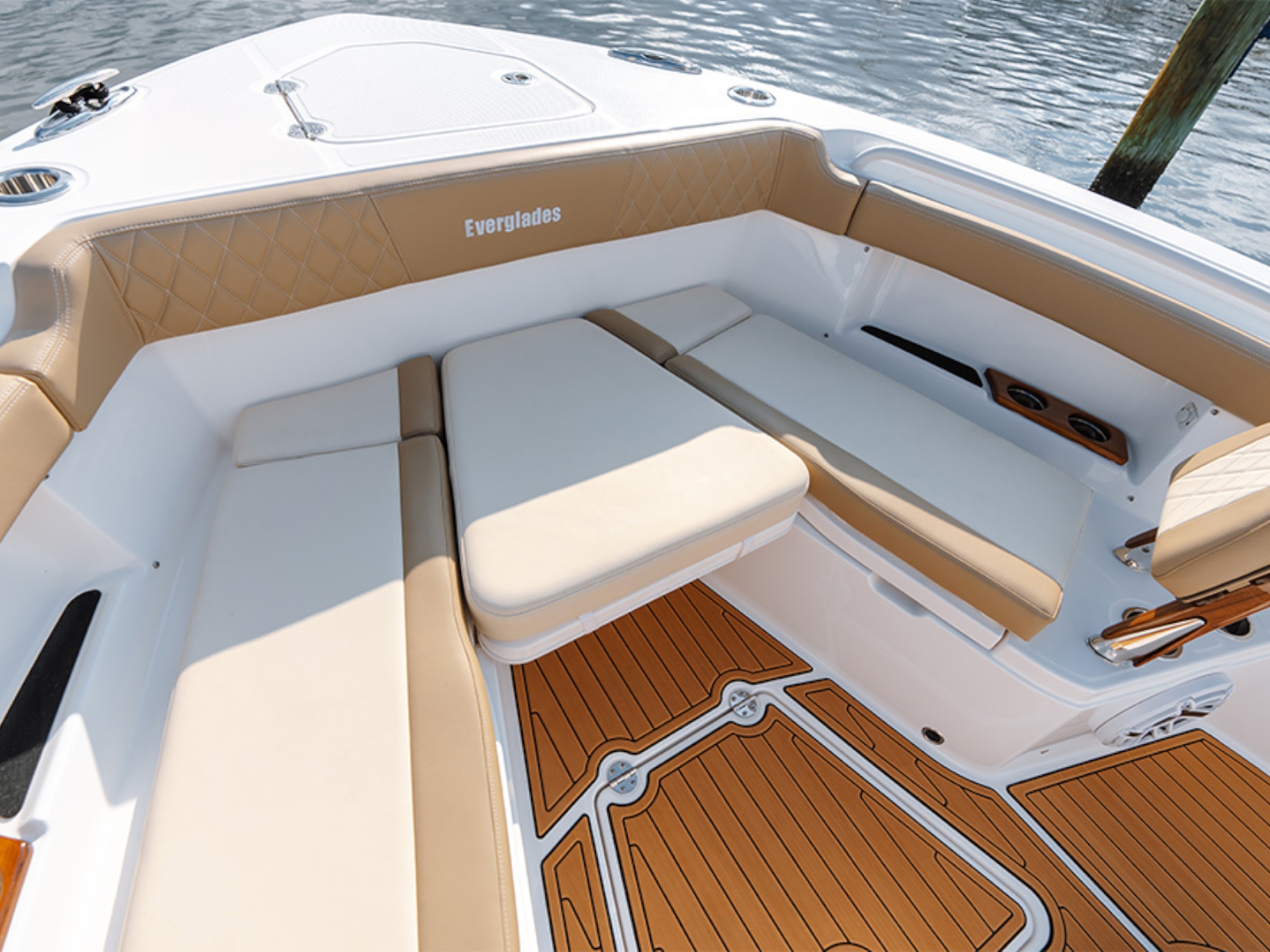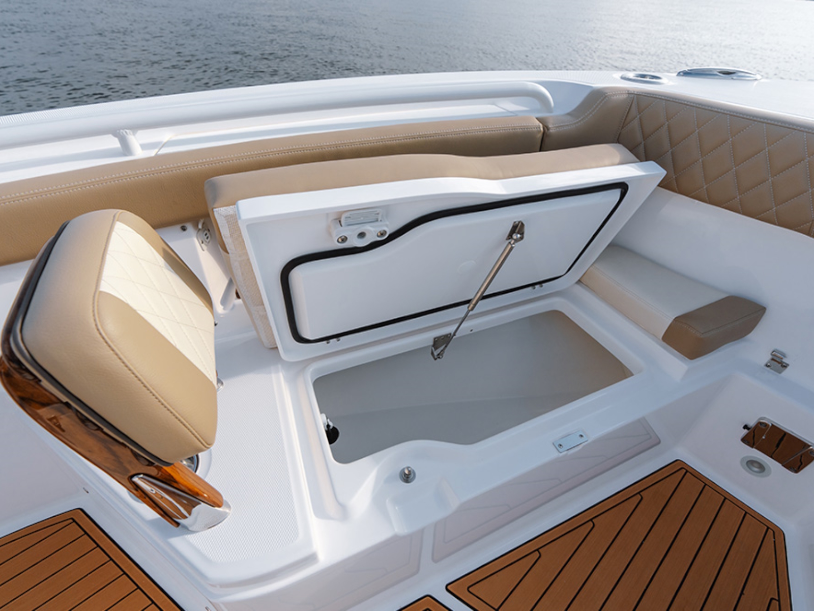 - Cushioned forward console lounge seating with armrests, cup holders (2) & extra large storage compartment with a divider, dedicated fender, rope, and casting platform storage