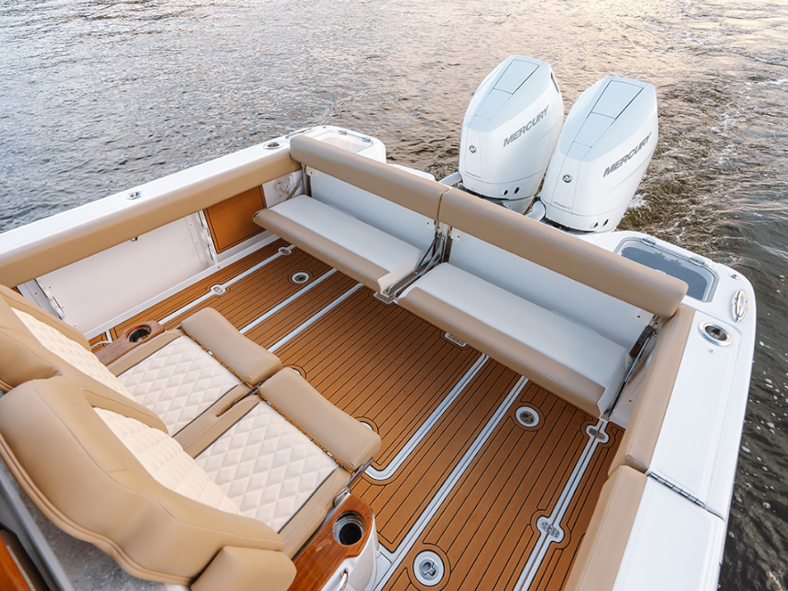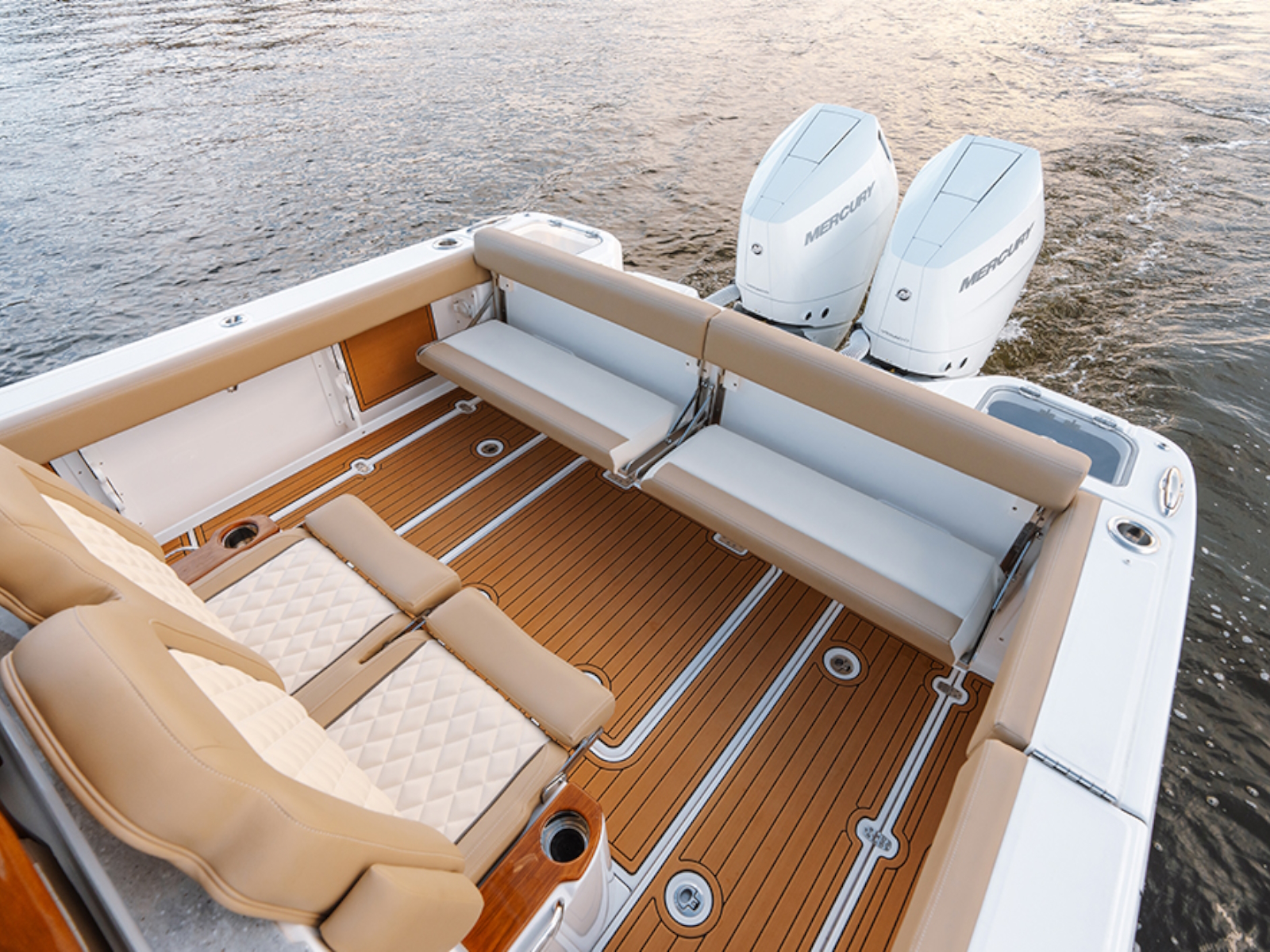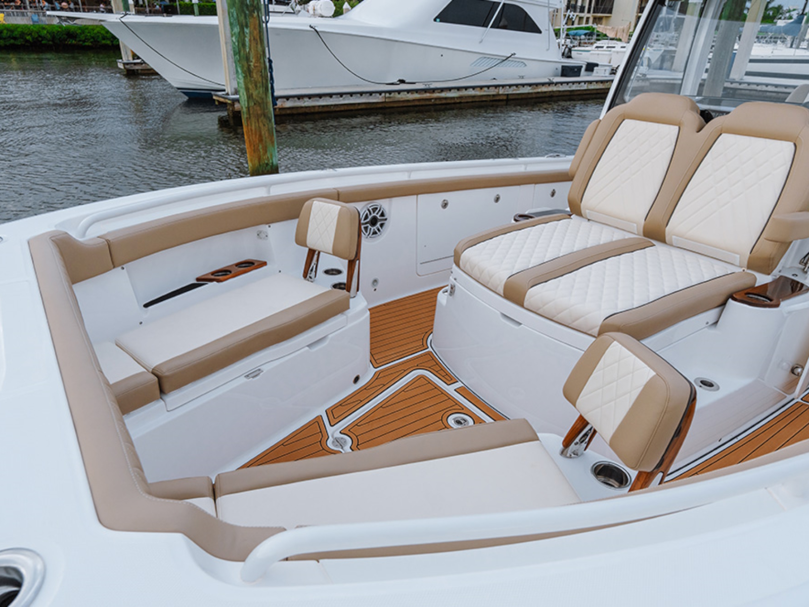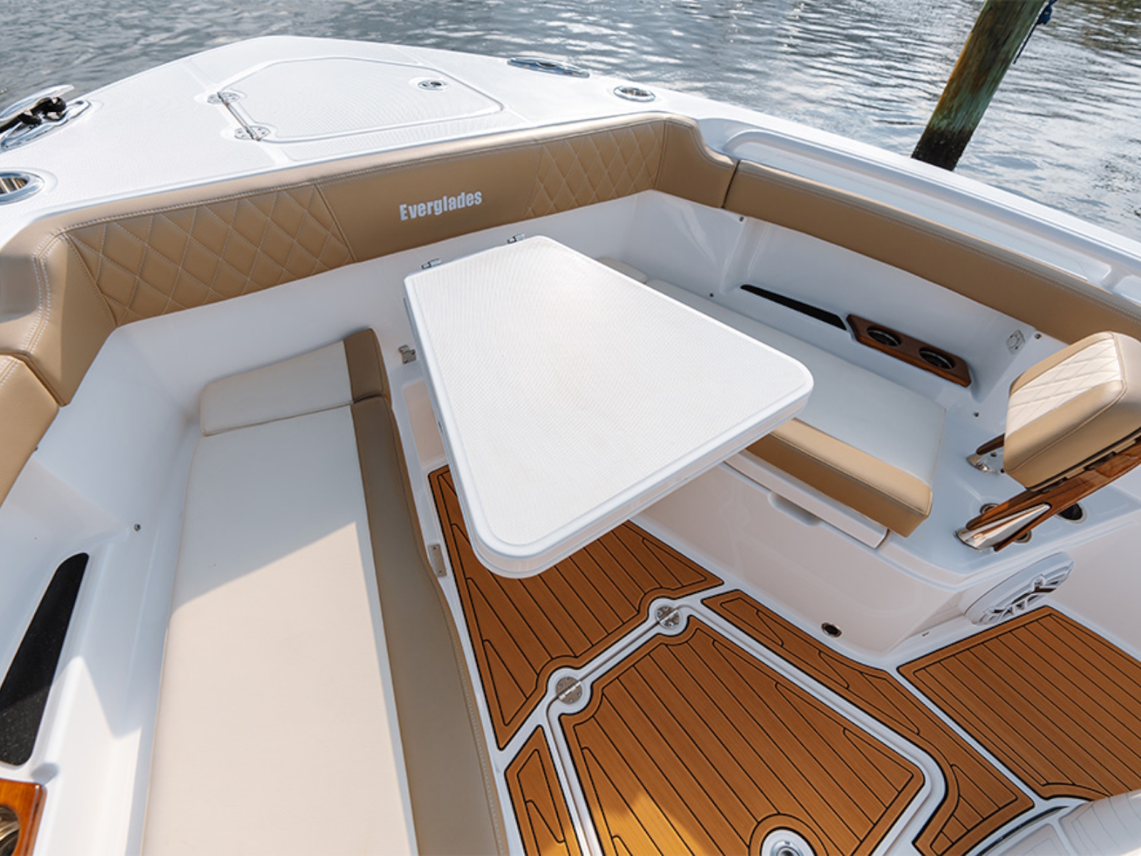 - Cushioned forward console lounge seating with armrests, cup holders (2) & extra large storage compartment with a divider, dedicated fender, rope, and casting platform storage