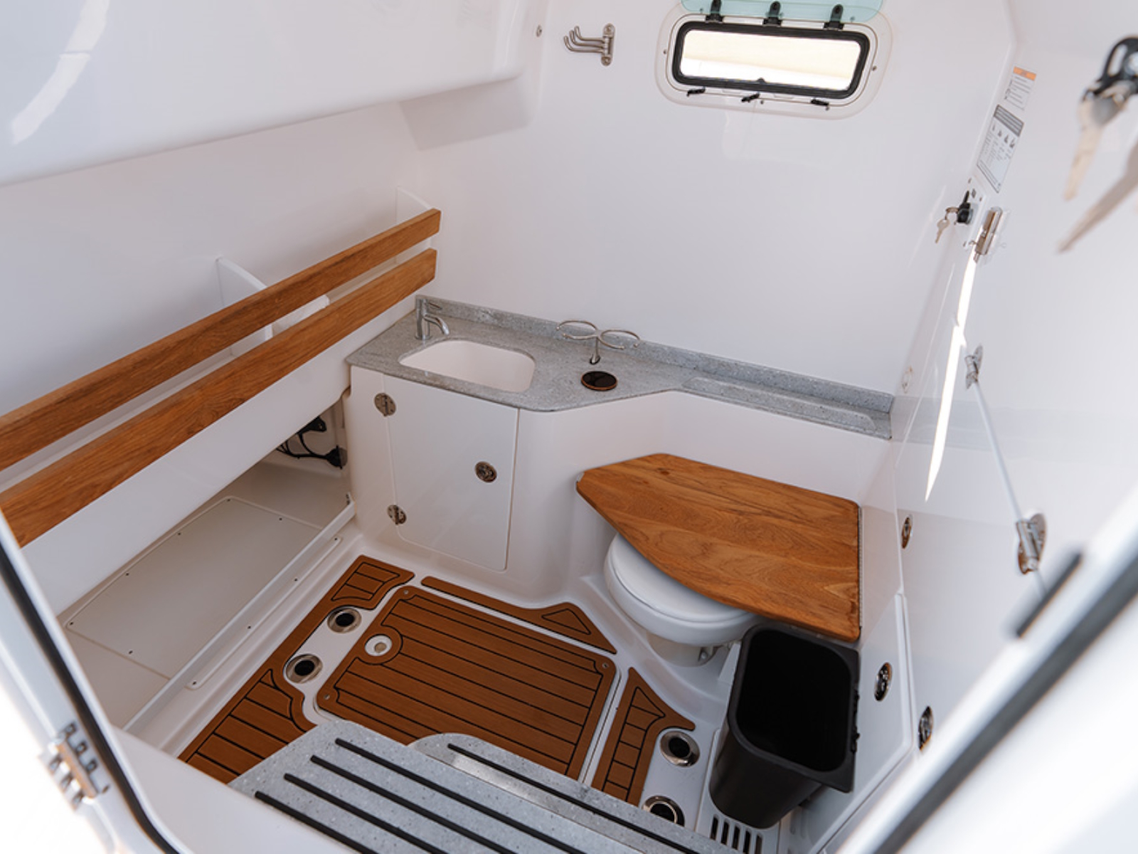 - Head compartment with sink, toilet, teak head cover, holding tank, macerator, lighting, in floor storage with hatch, flooring, retaining rail, teak storage shelf, openingportlight, & lockable door
