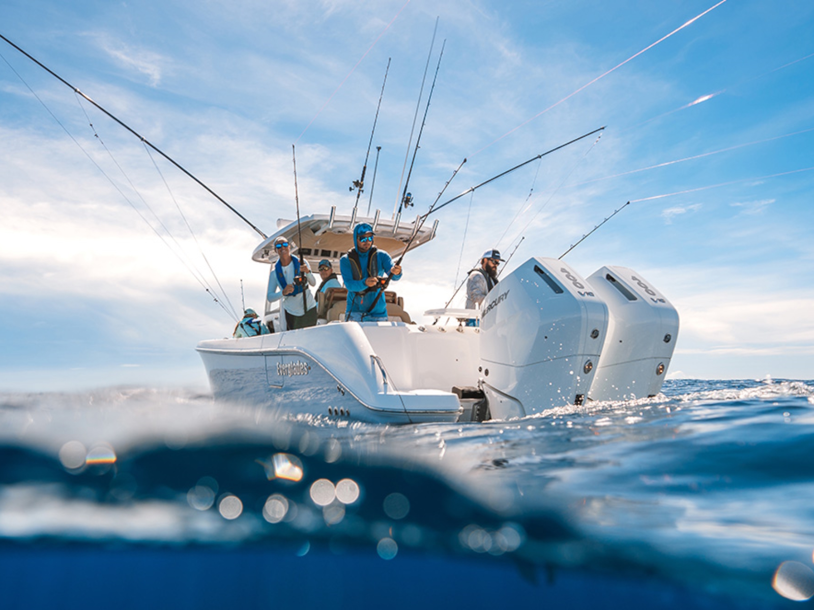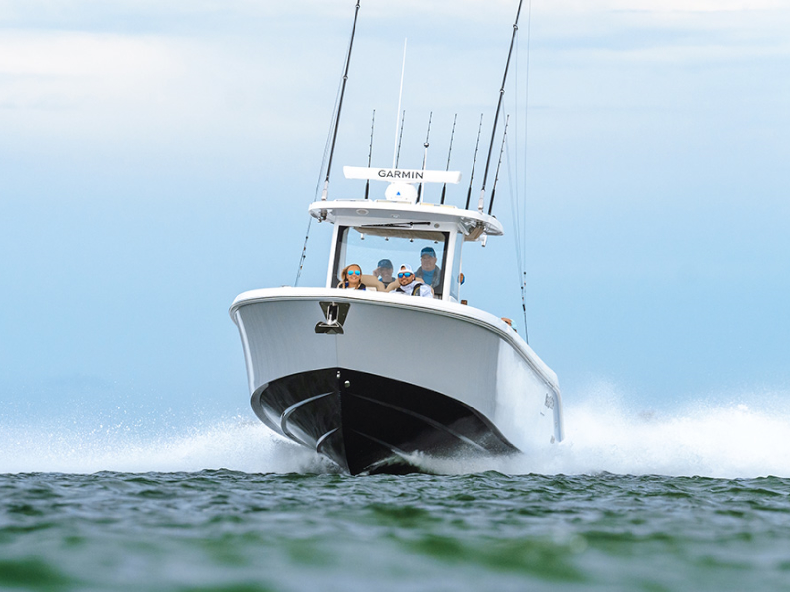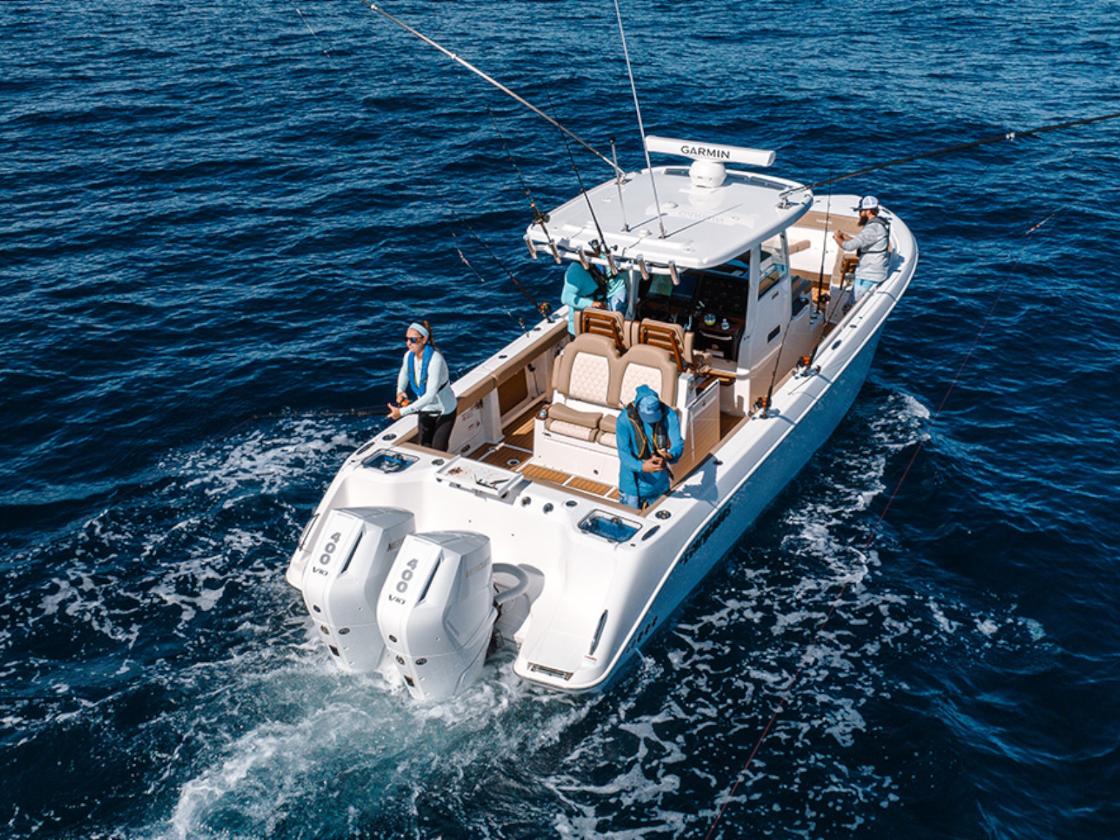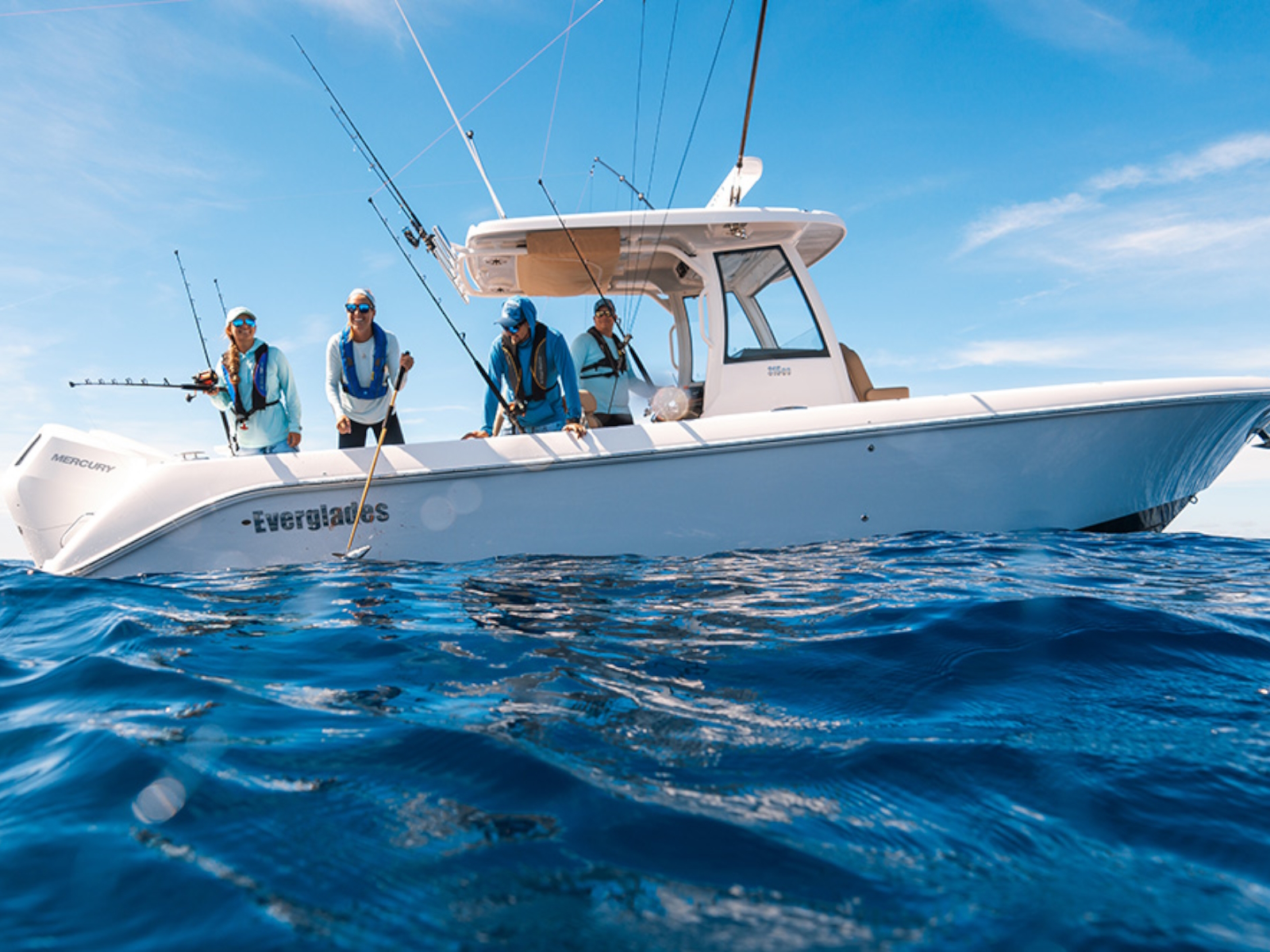- Fiberglass hardtop with molded in handrail & drainage trough, aluminum powder-coated frame with hand holds, overhead LED lights (4), spreader lights (4), electronics access hatch, rod holders (6)
