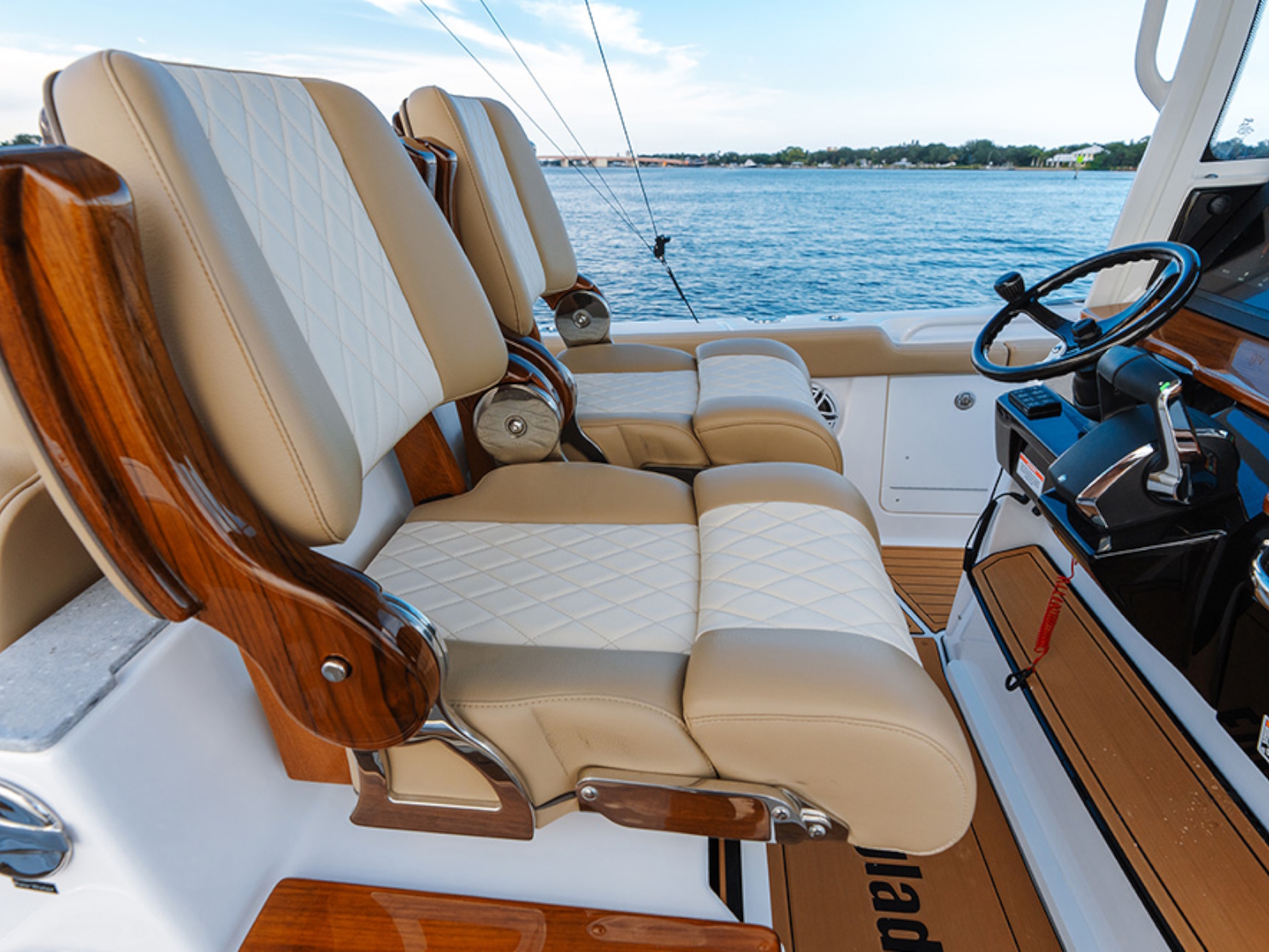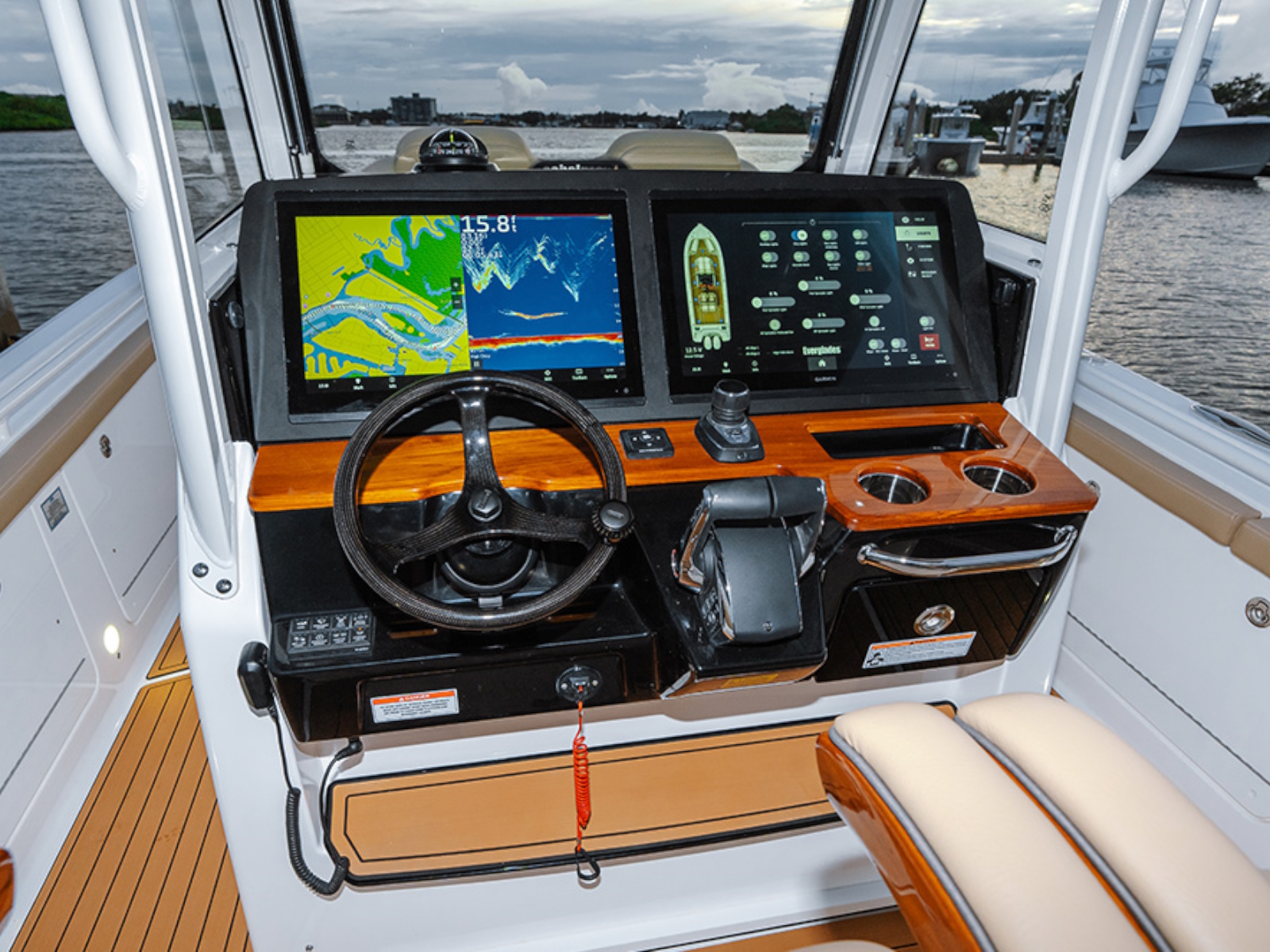- Recessed storage area on helm face, recessed storage area on dash top with inductive cell phone chargers (2)