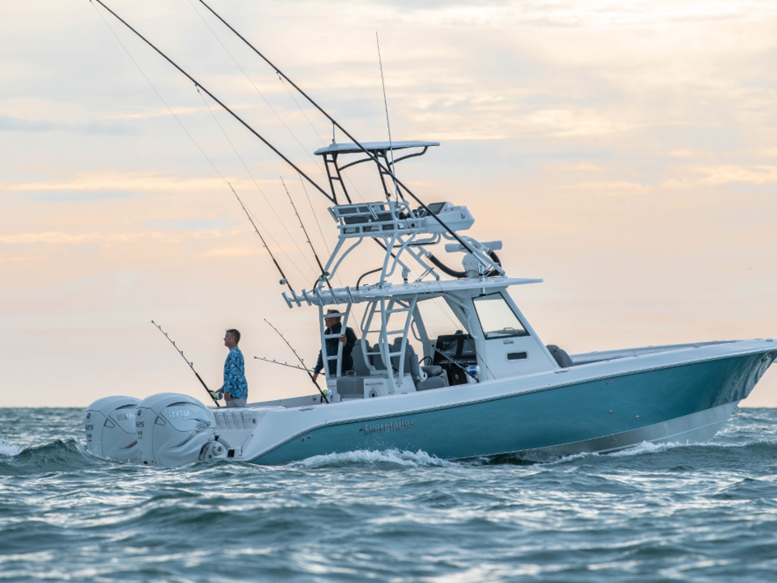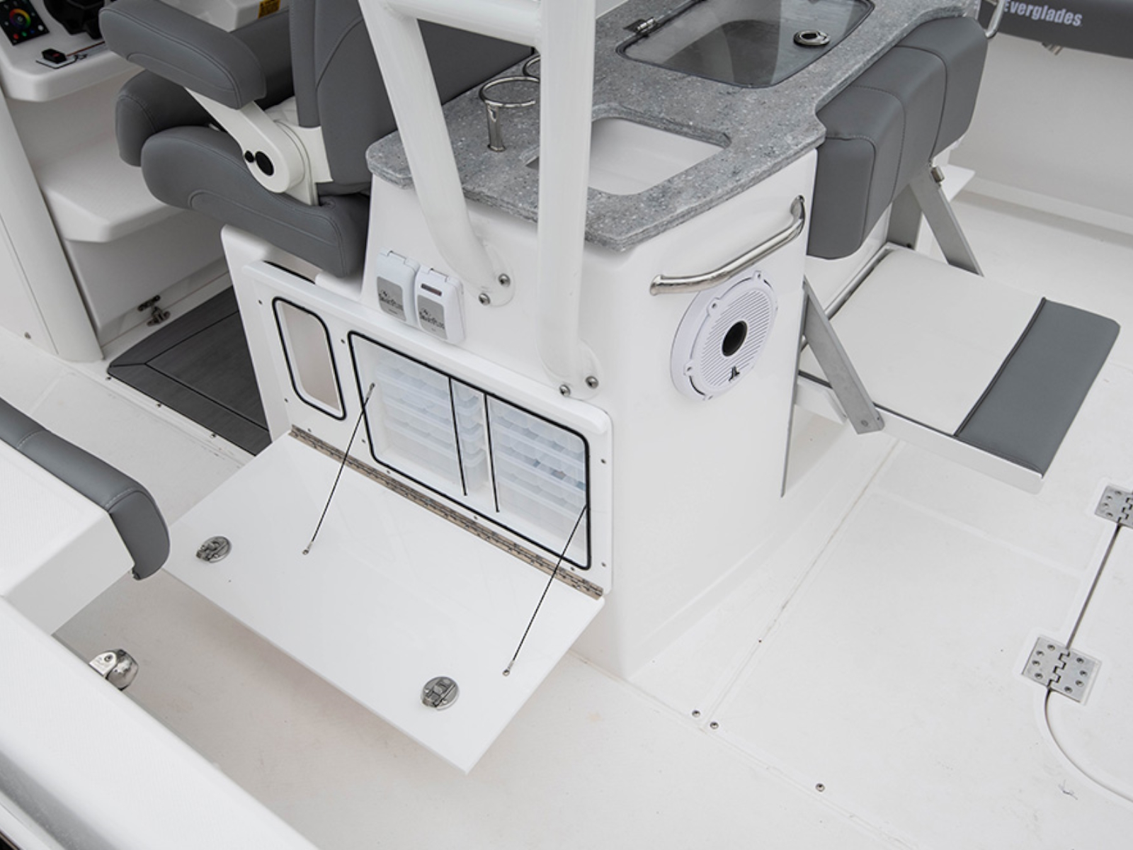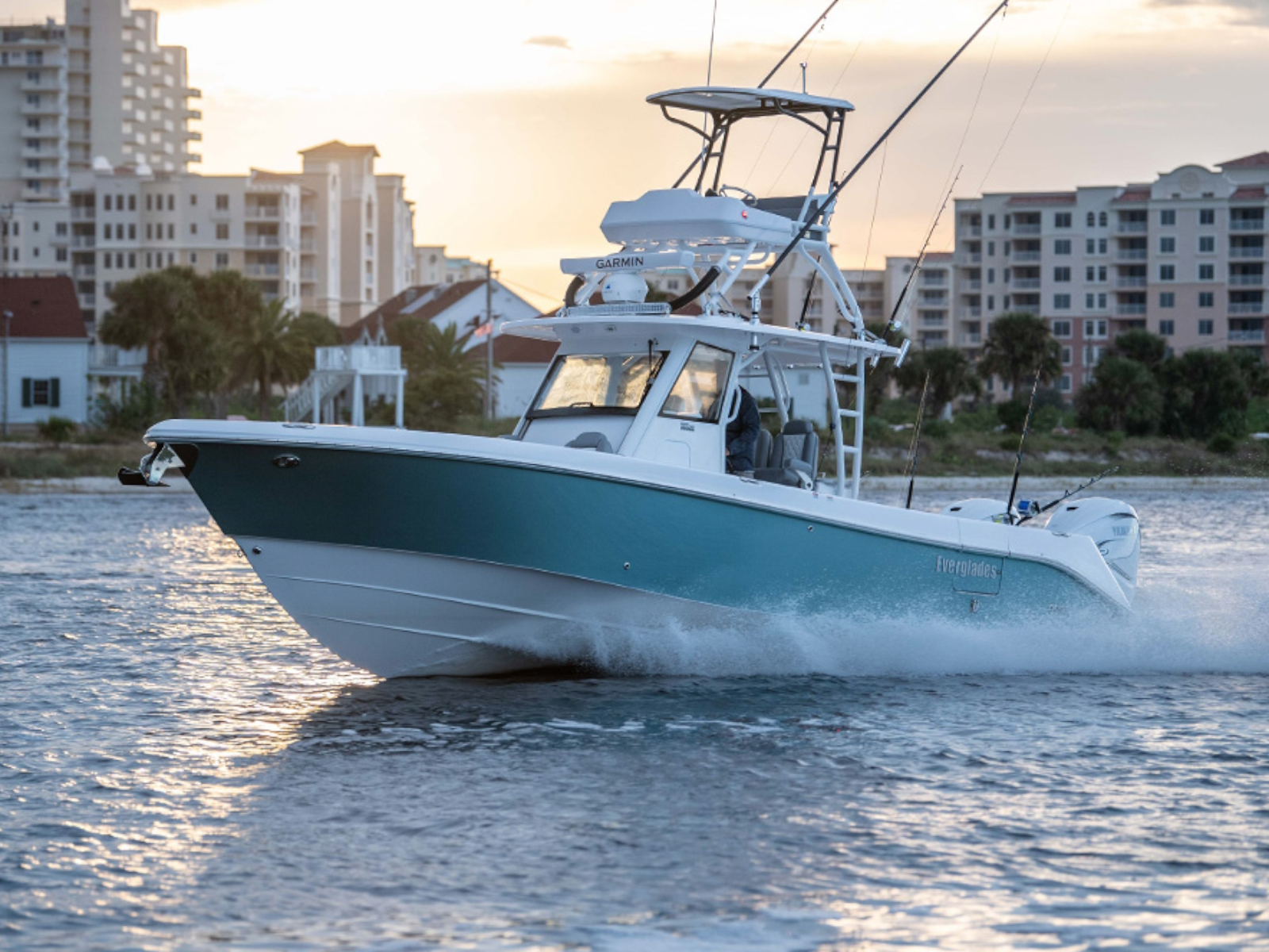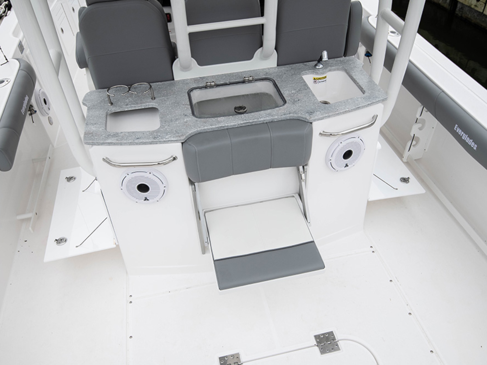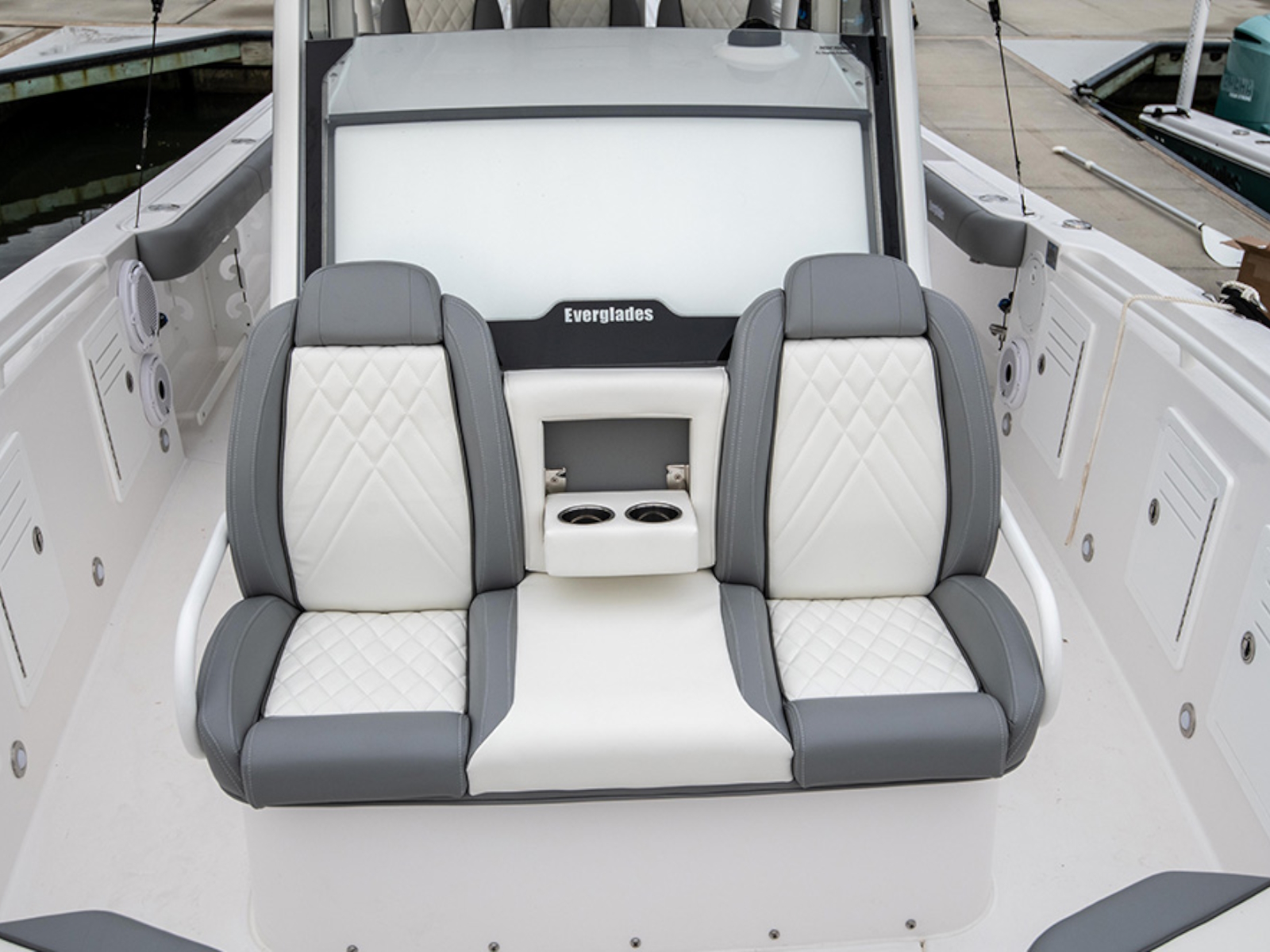 The patented RAMCAP hull design provides a powerful yet quiet and smooth ride no matter where you choose to sit. Captain your vessel from above - featuring the optional full upper station - Everglades' 365cc allows you to take the helm to new heights.
