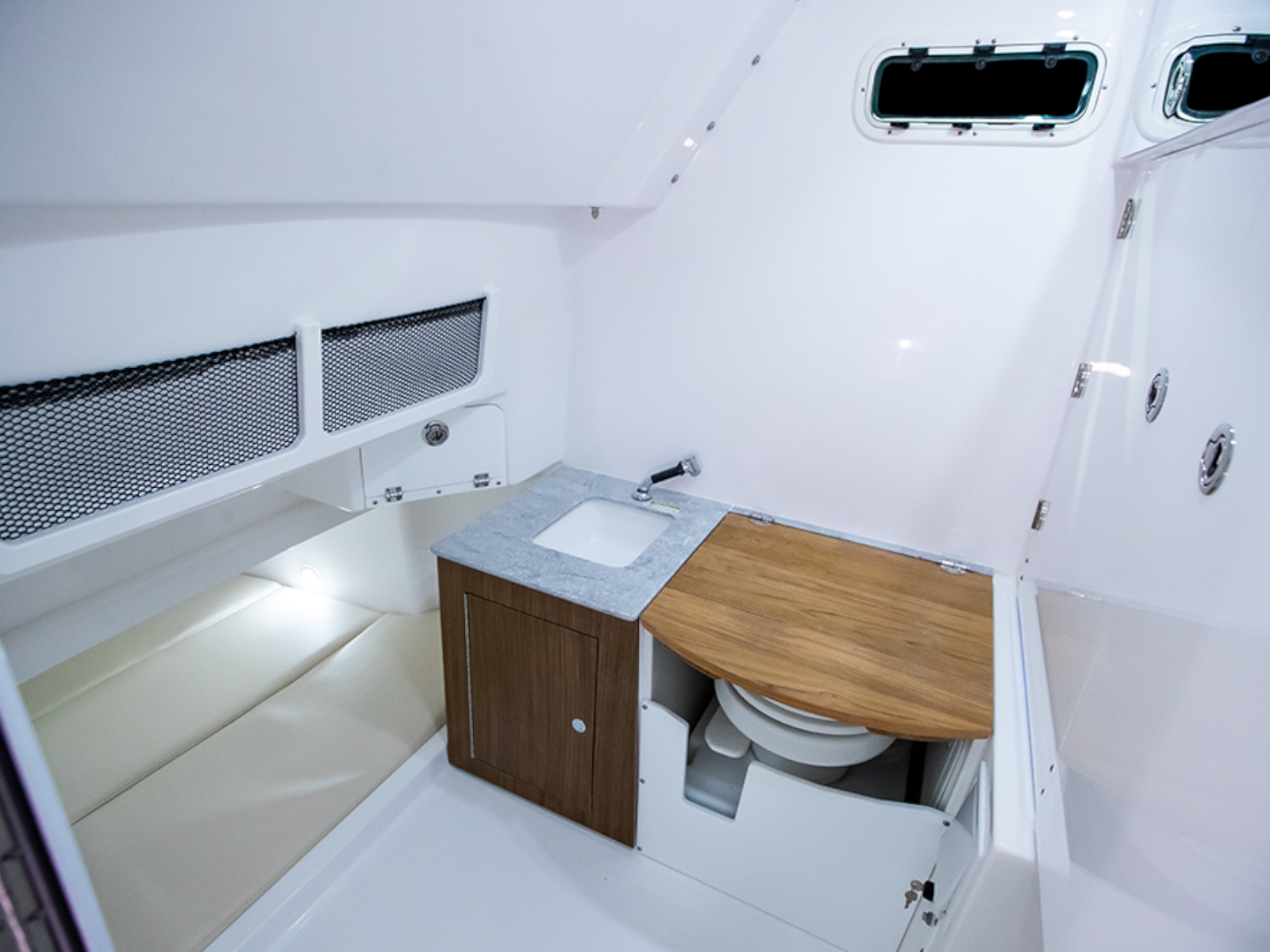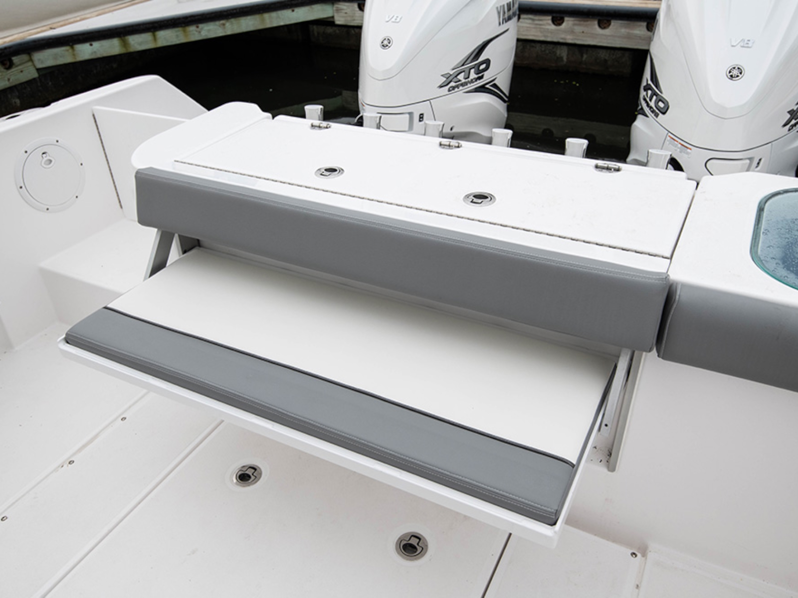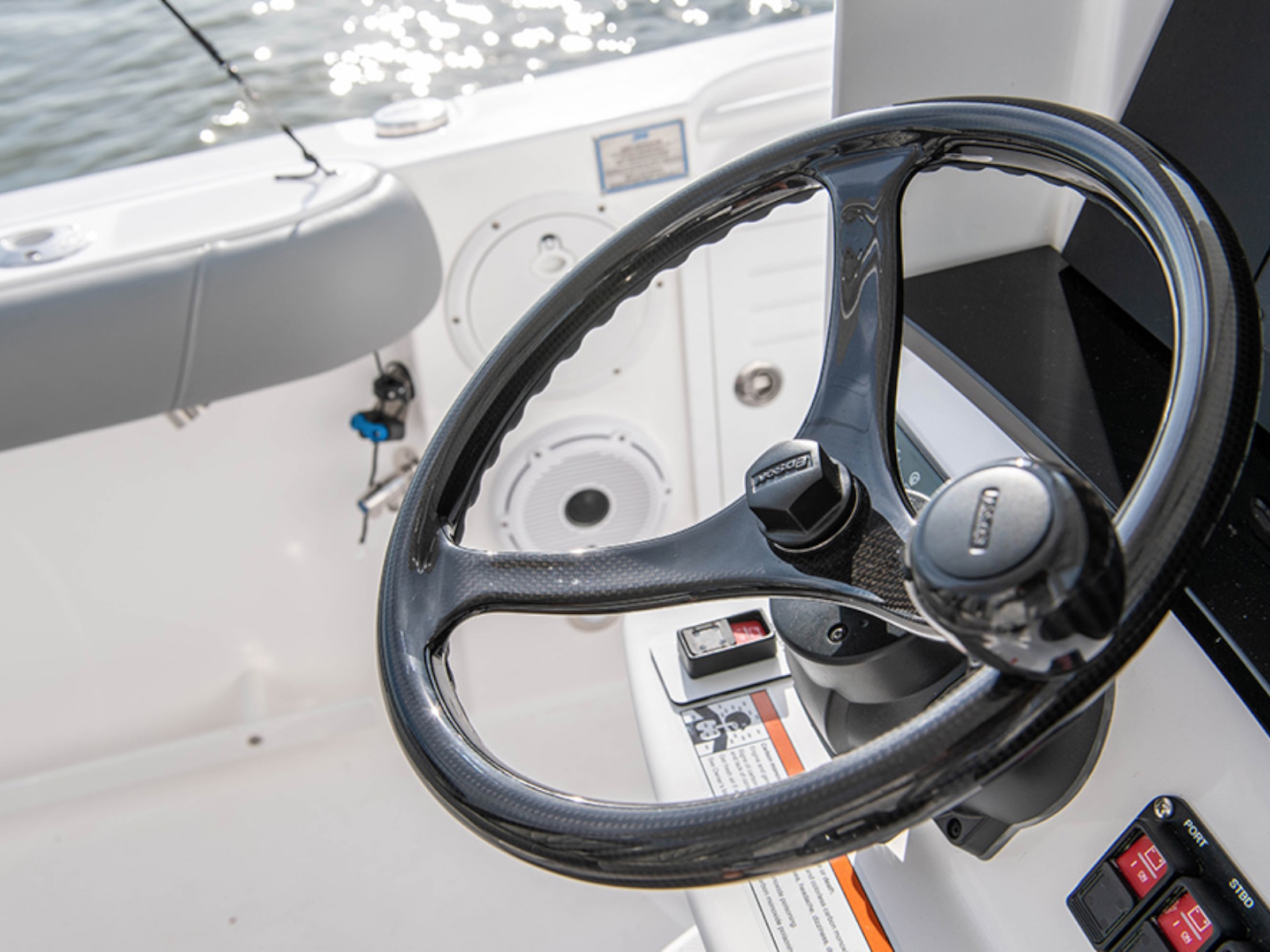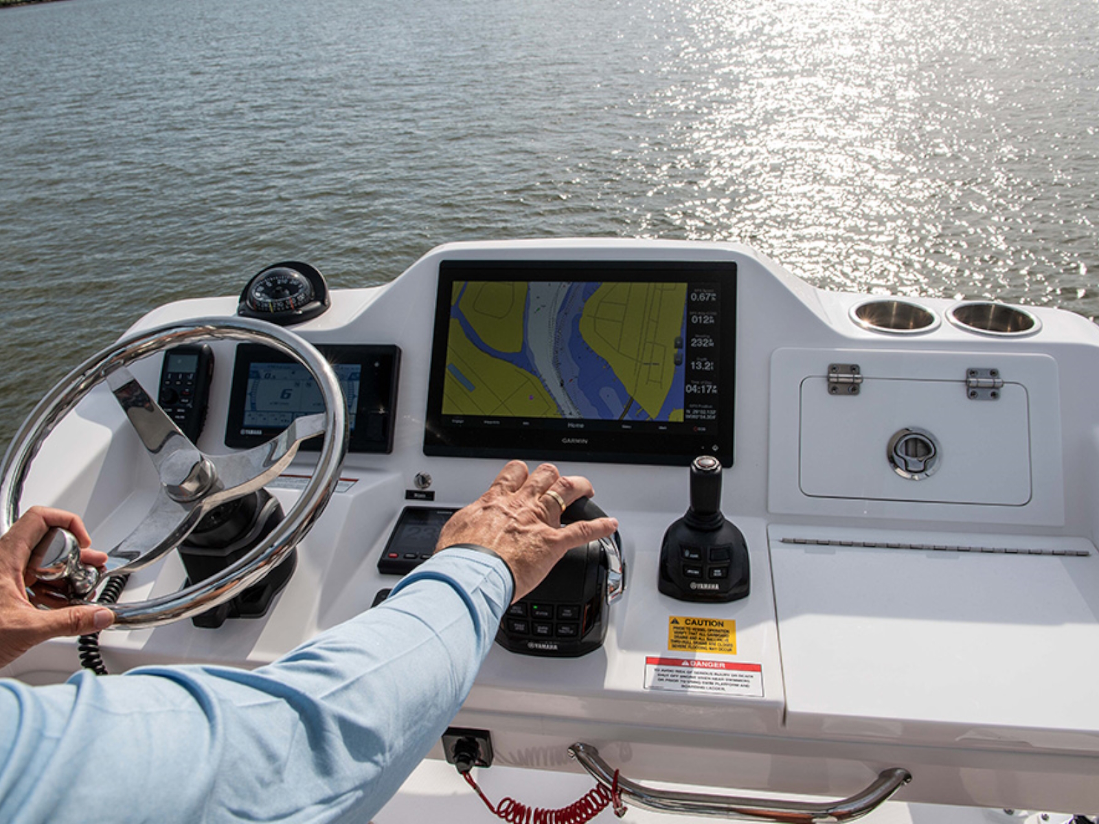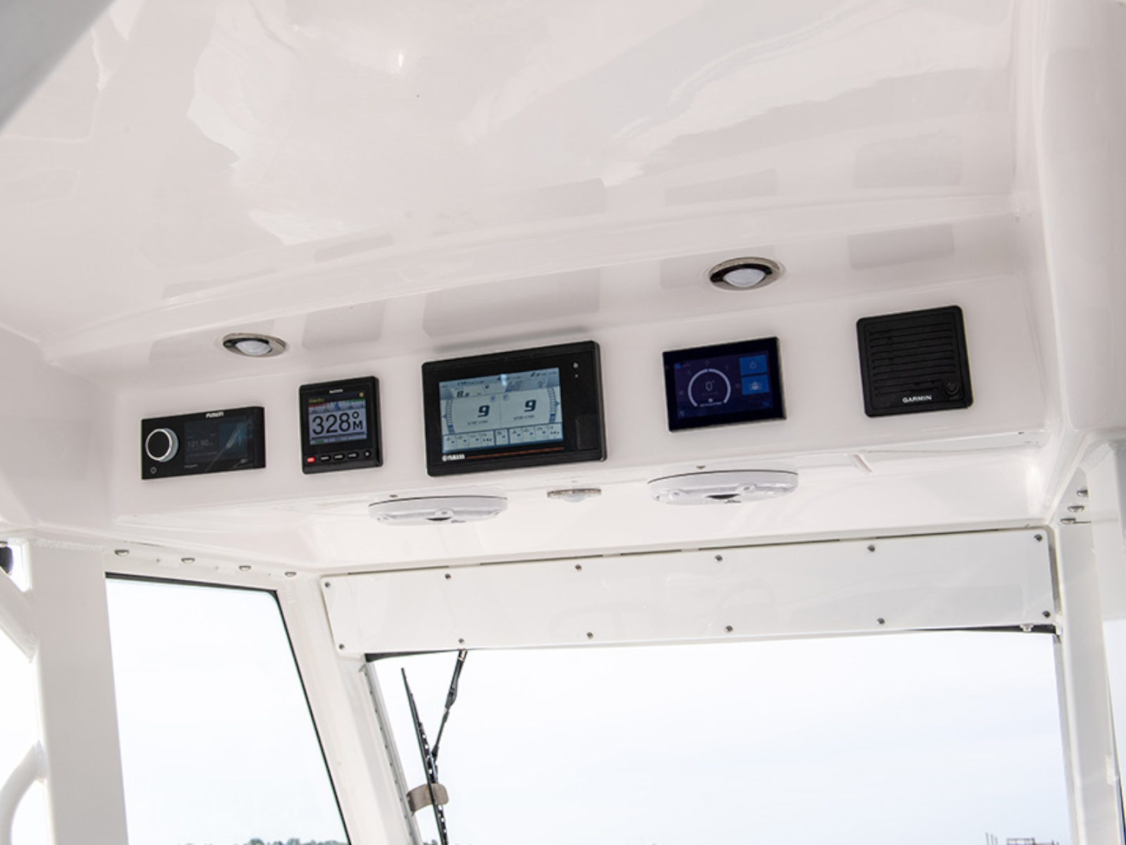 The patented RAMCAP hull design provides a powerful yet quiet and smooth ride no matter where you choose to sit. Captain your vessel from above - featuring the optional full upper station - Everglades' 365cc allows you to take the helm to new heights.