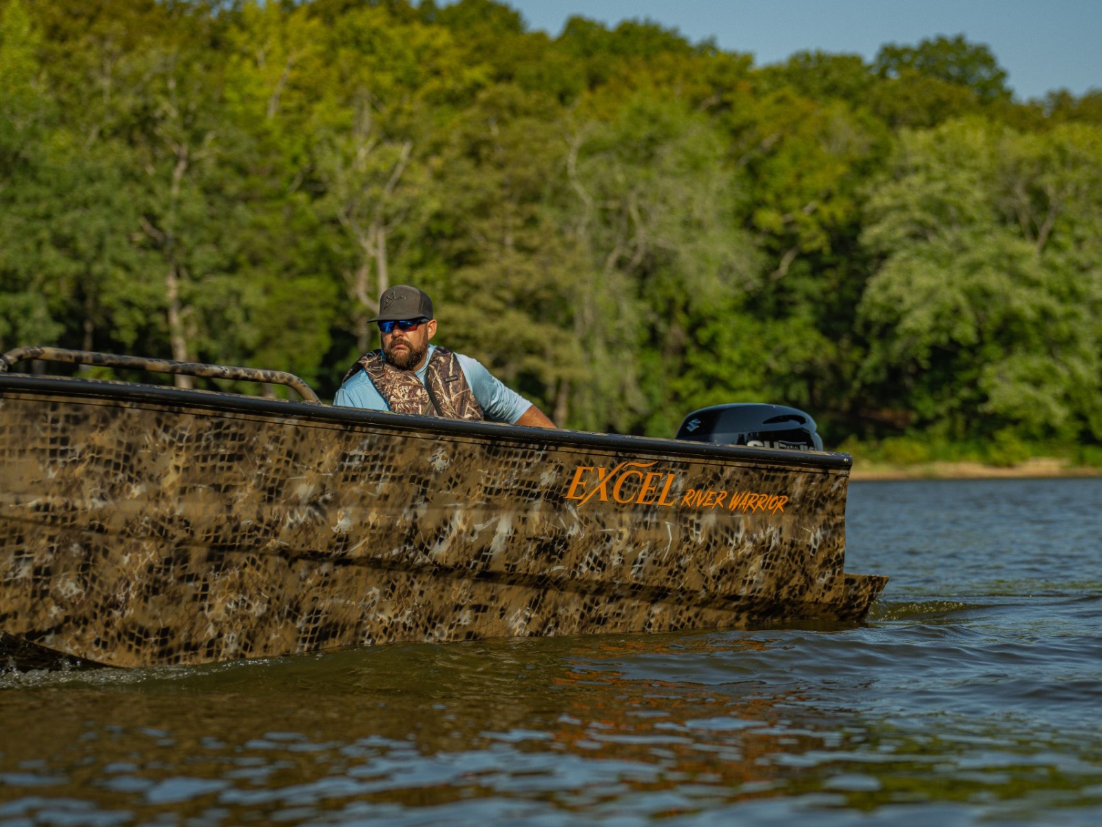 A newly engineered reverse chine and Excel’s innovative lifting strake design has redefined agility and speed. The River Warrior sets a new standard for maneuverability. Rear corner steps ensure easy access. An integrated gun box with two standard rod tubes, welded trolling motor bracket and optional 40-gallon front livewell make the River Warrior a versatile fishing machine.