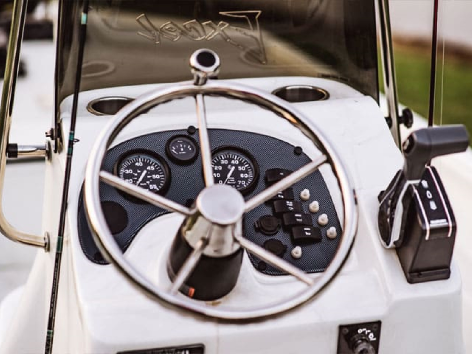 - Fiberglass Console w/ Tinted Windshield, Speedometer, Tach and Fuel Gauges