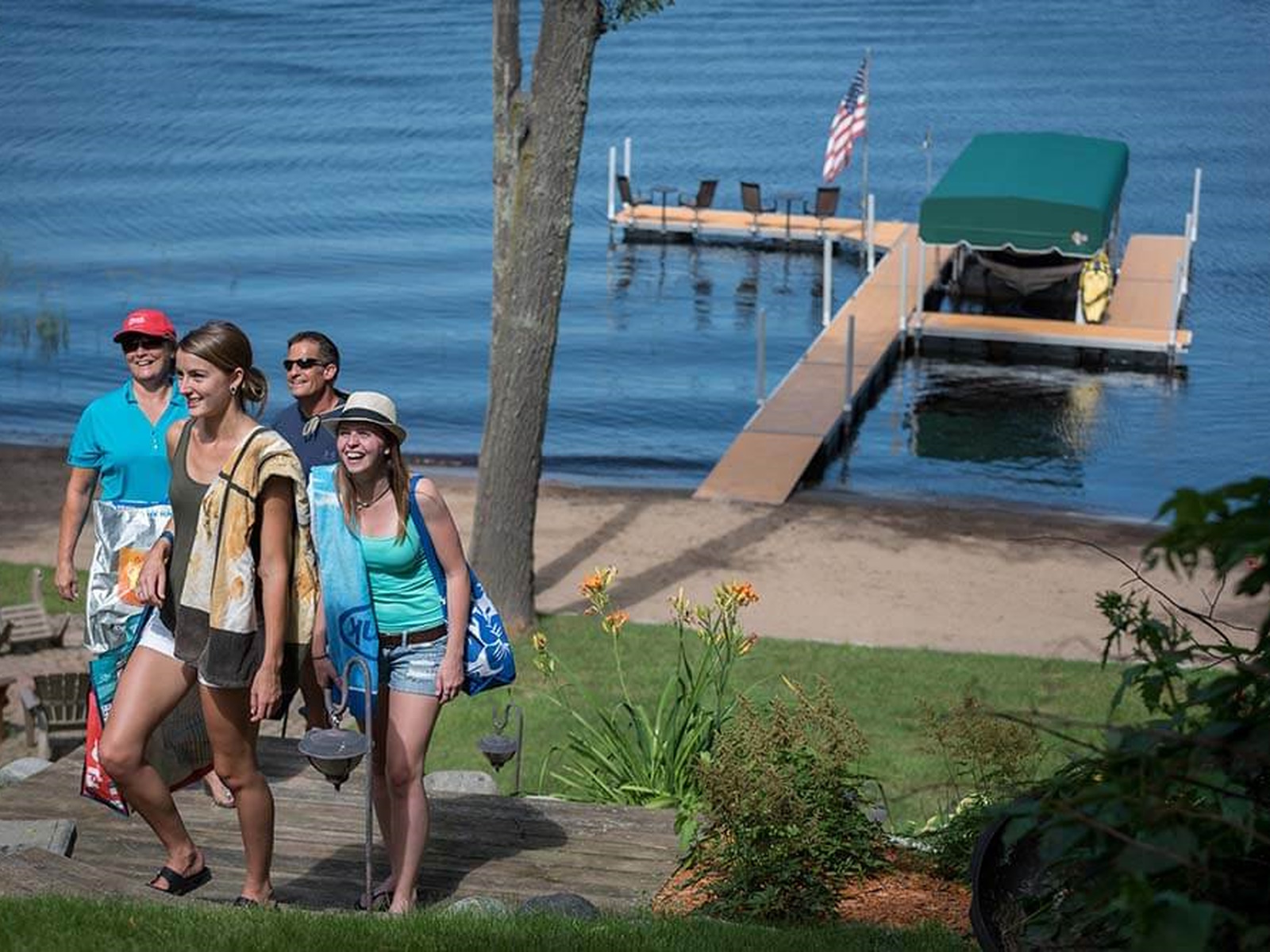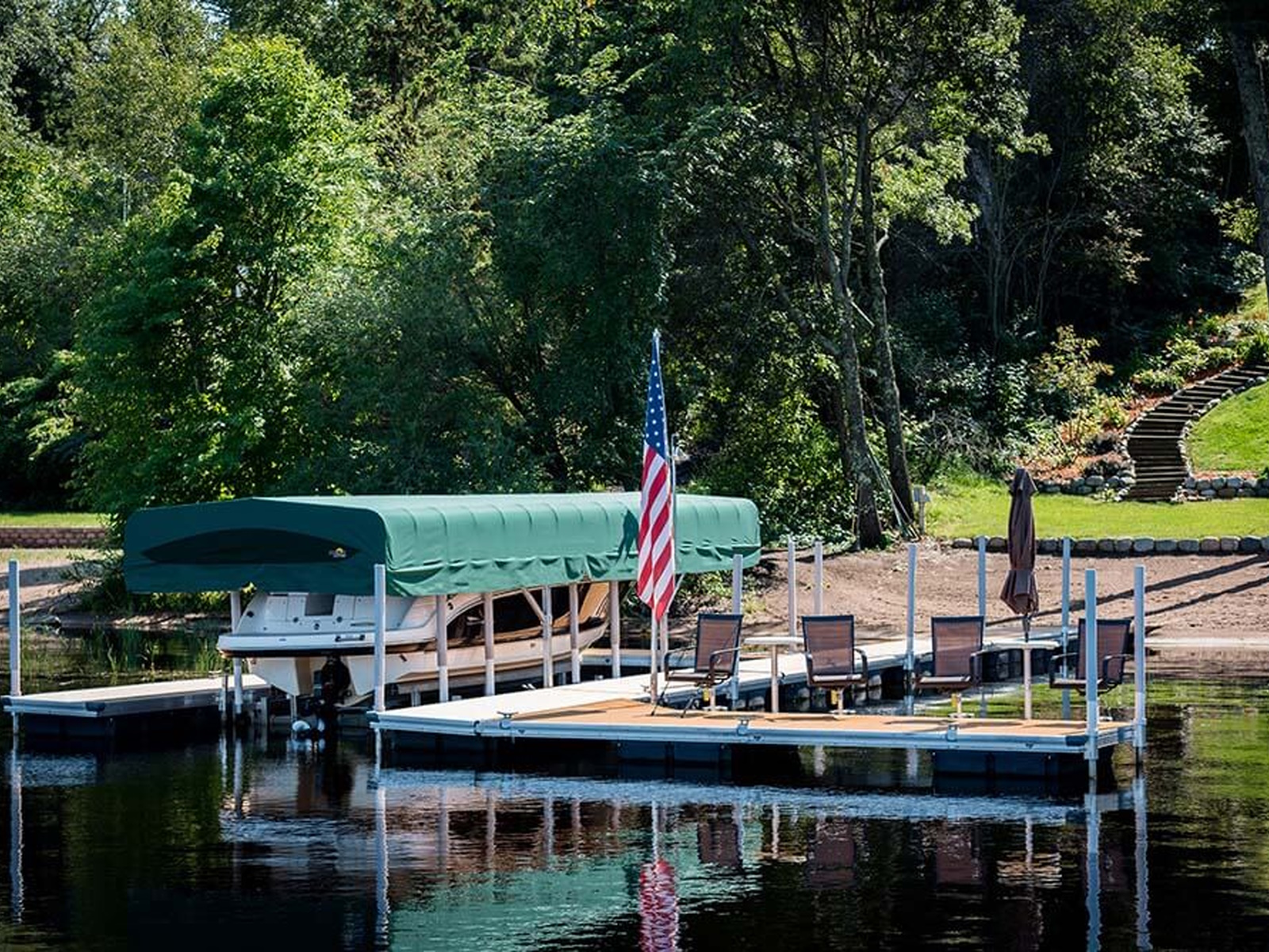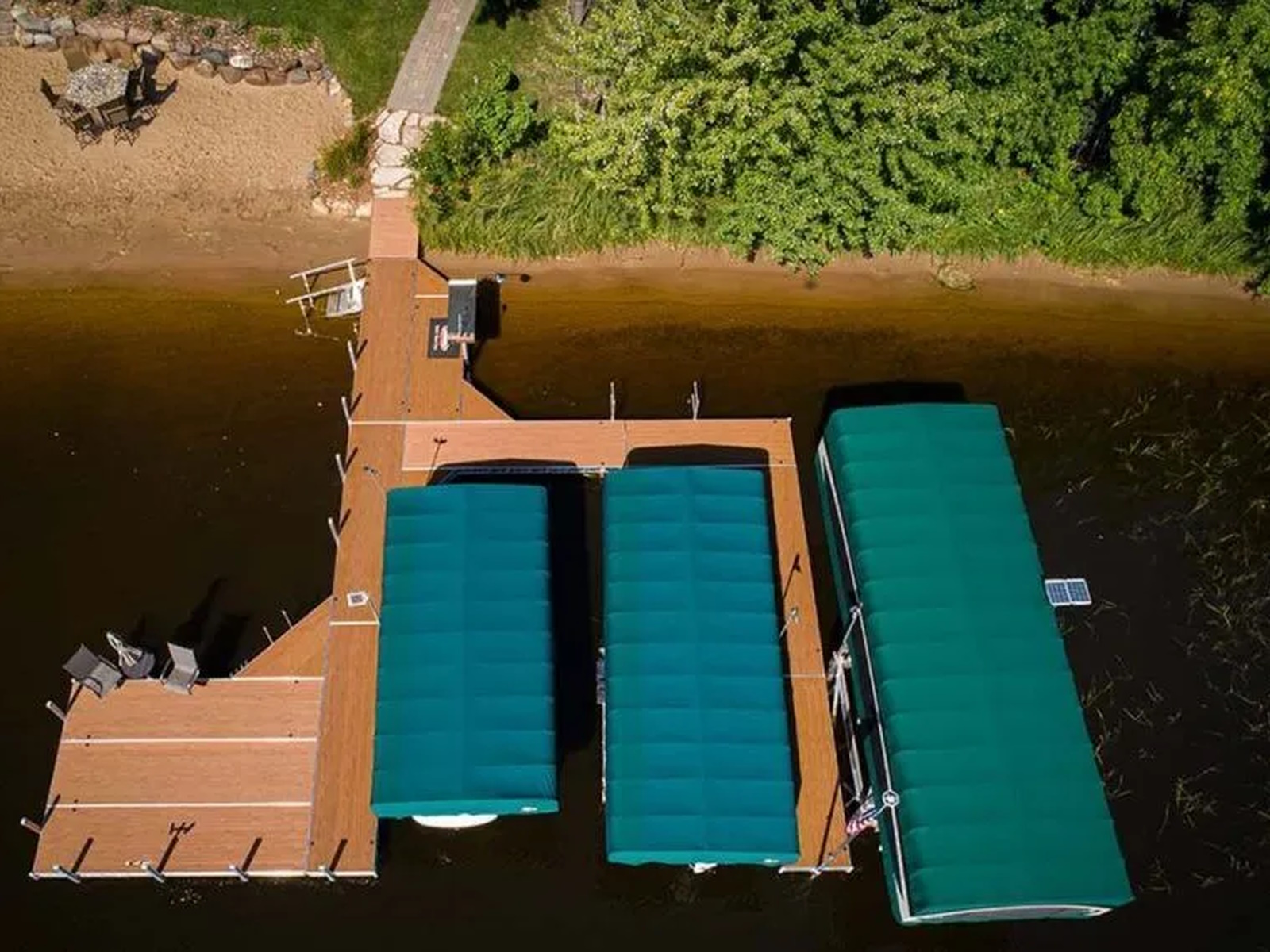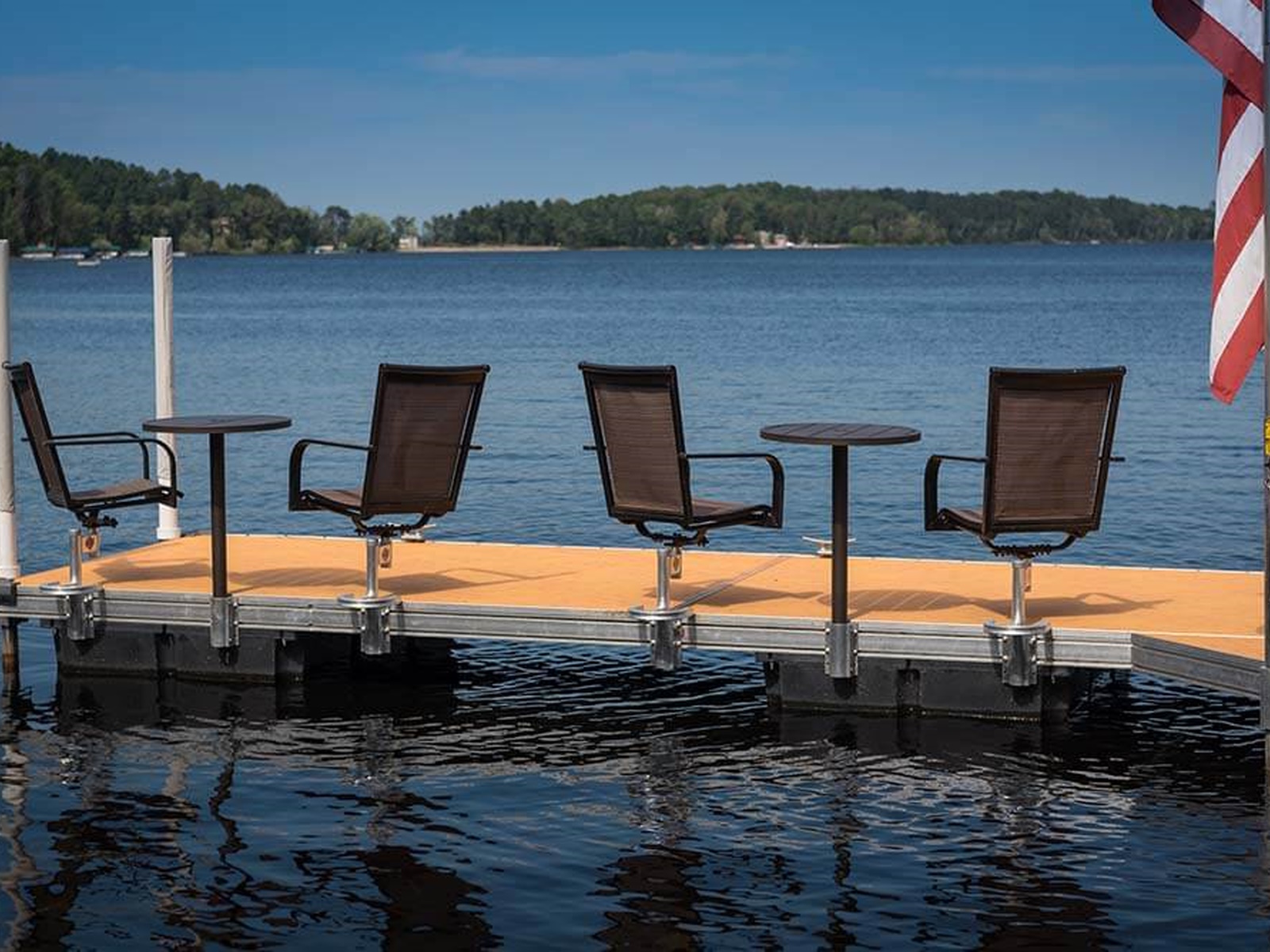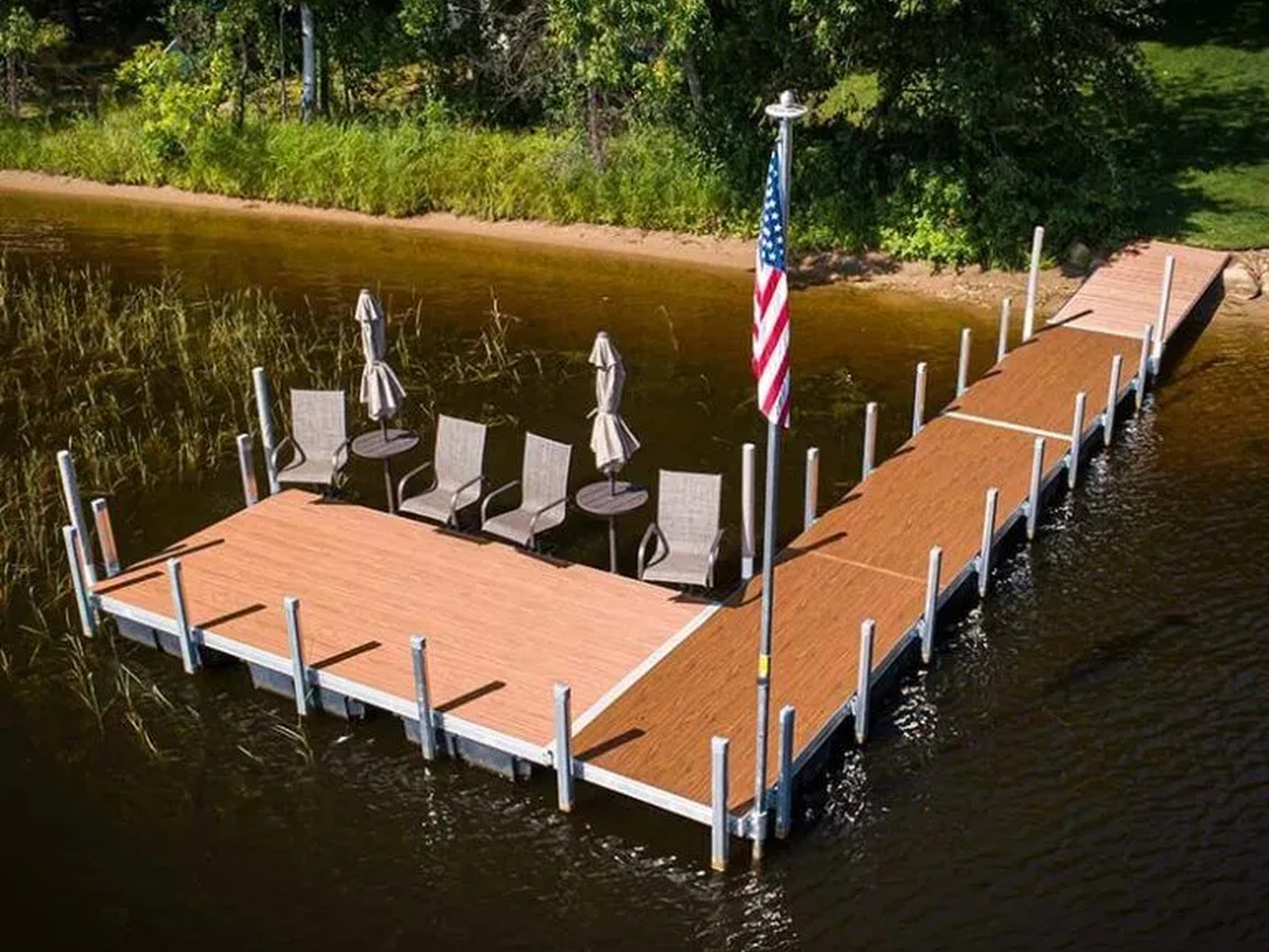 Floating docks do not use a rigid connection to the lake bottom with legs or posts so they will naturally have some give and/or sway as they are walked on. With a straight-out floating dock, stability is improved by maximizing the dock width. It is recommended that 6′ or 8′ docks widths are used for straight dock systems. Sundecks or slips will improve the stability of a floating dock system if they are connected with the hinge connector perpendicular to the narrow side of the main walkway.
