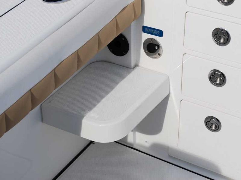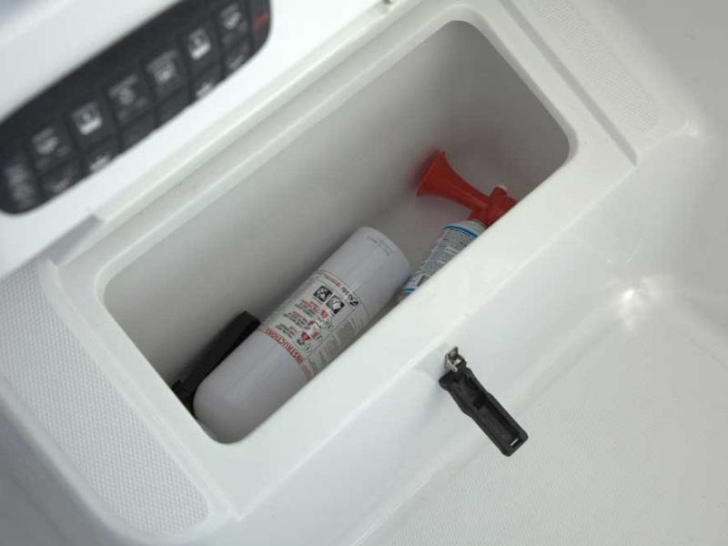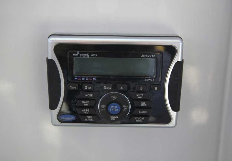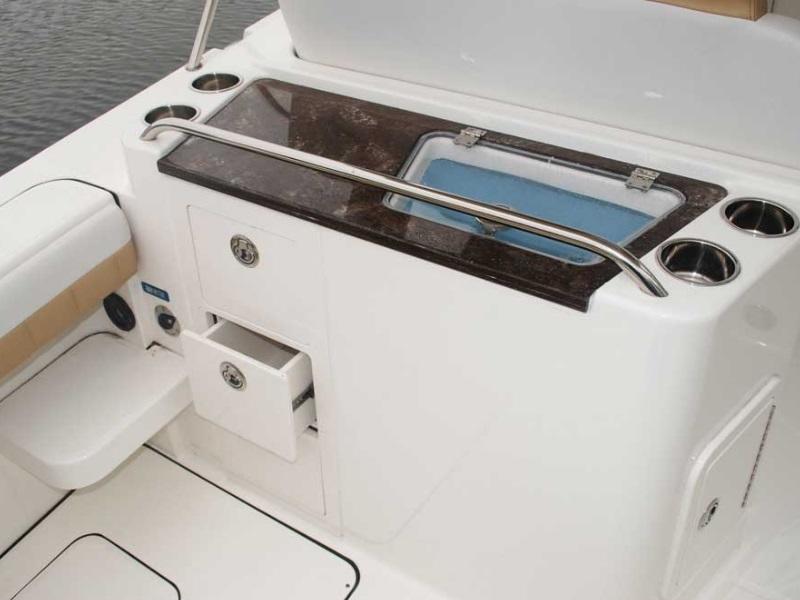 - Fiberglass entertainment center/wet bar with 20-gallon overboard draining livewell, 4 stainless steel cup holders, and 4 dry storage drawers