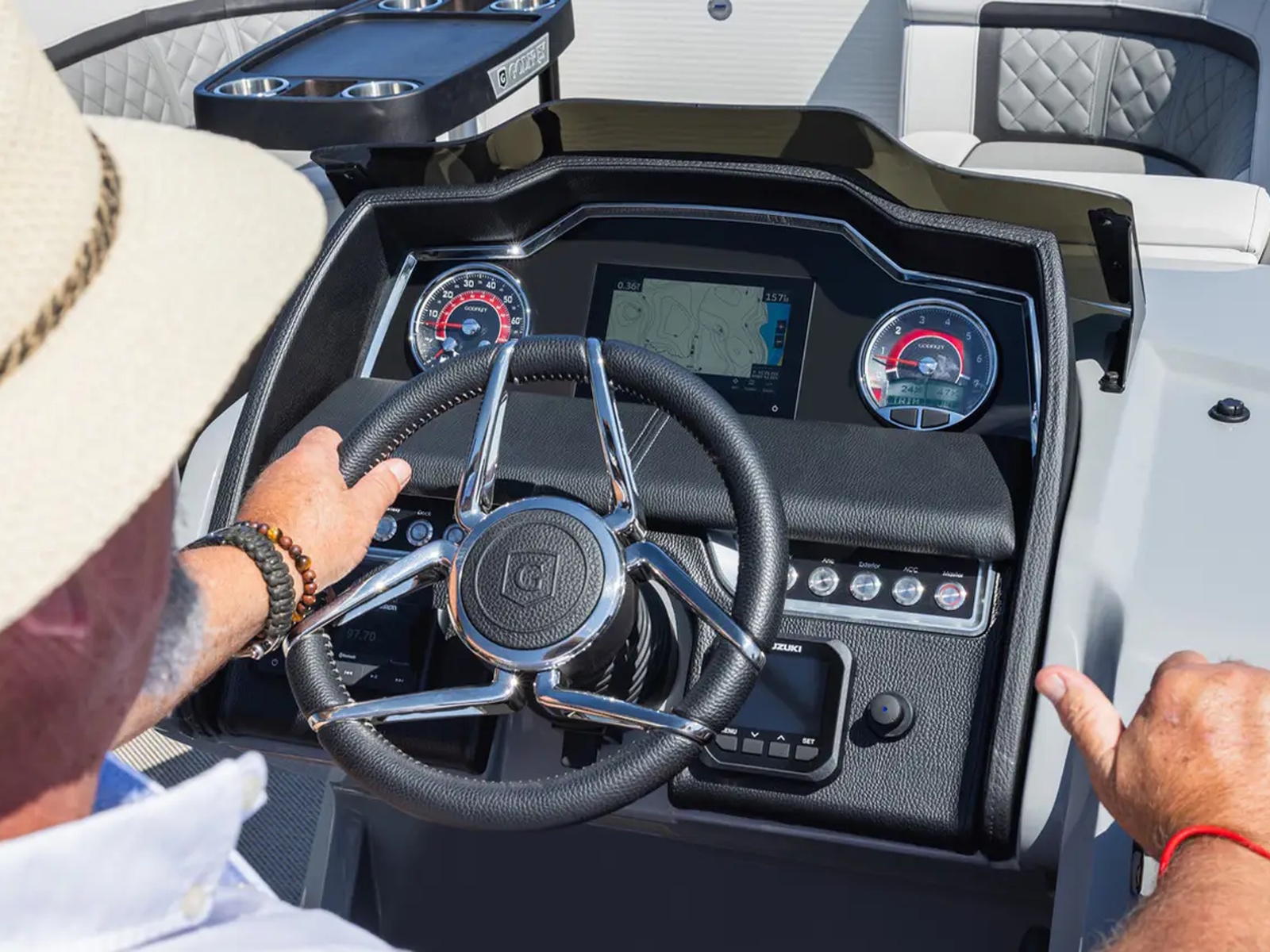 - The AquaPatio helm features a 7" multifunction display, elevated platform, tilt steering, stainless steel cup holders, digital gauges, and RGB lighting control. These premium components offer intuitive navigation, giving you confident command and a more enjoyable time on the water.