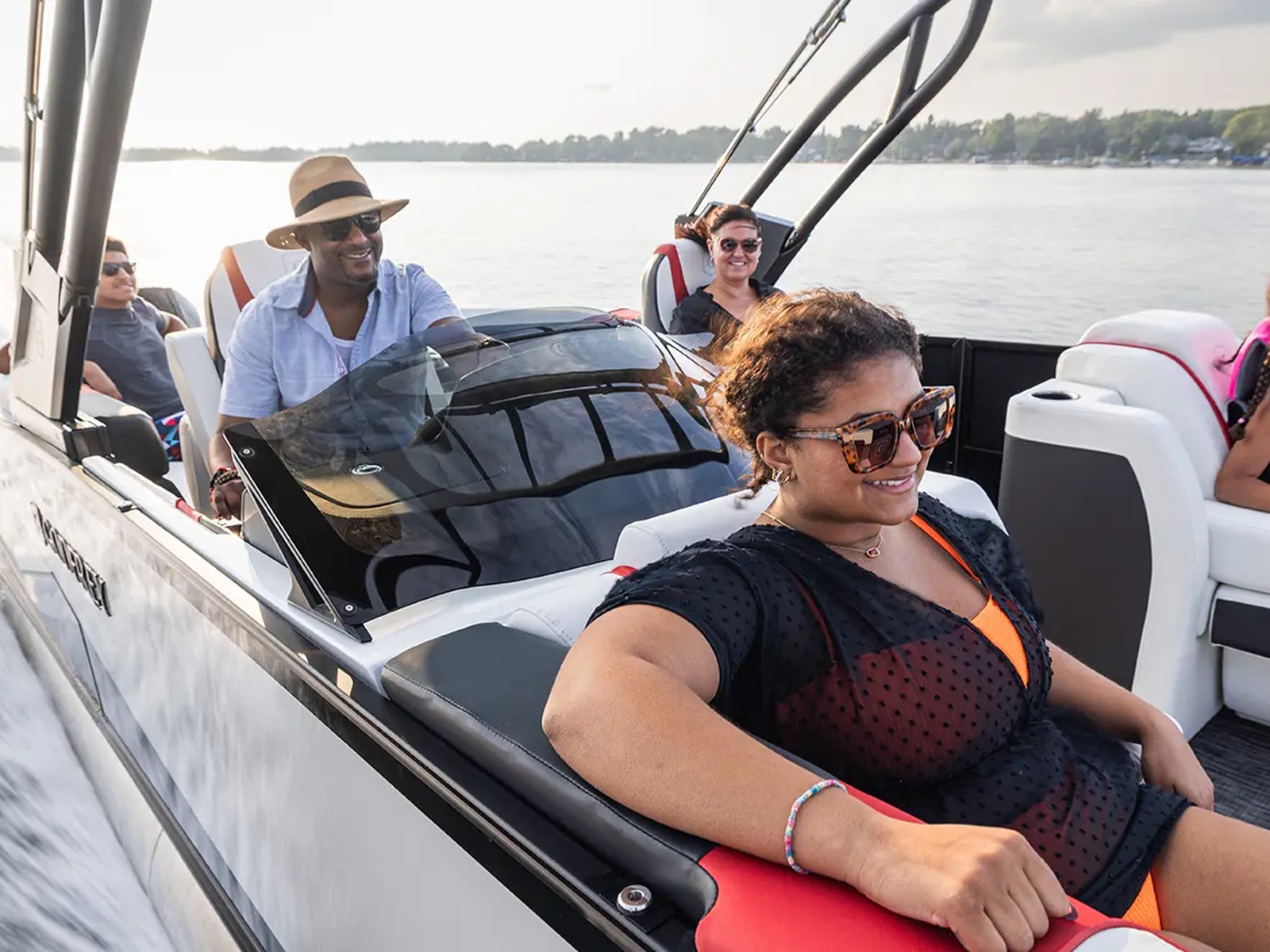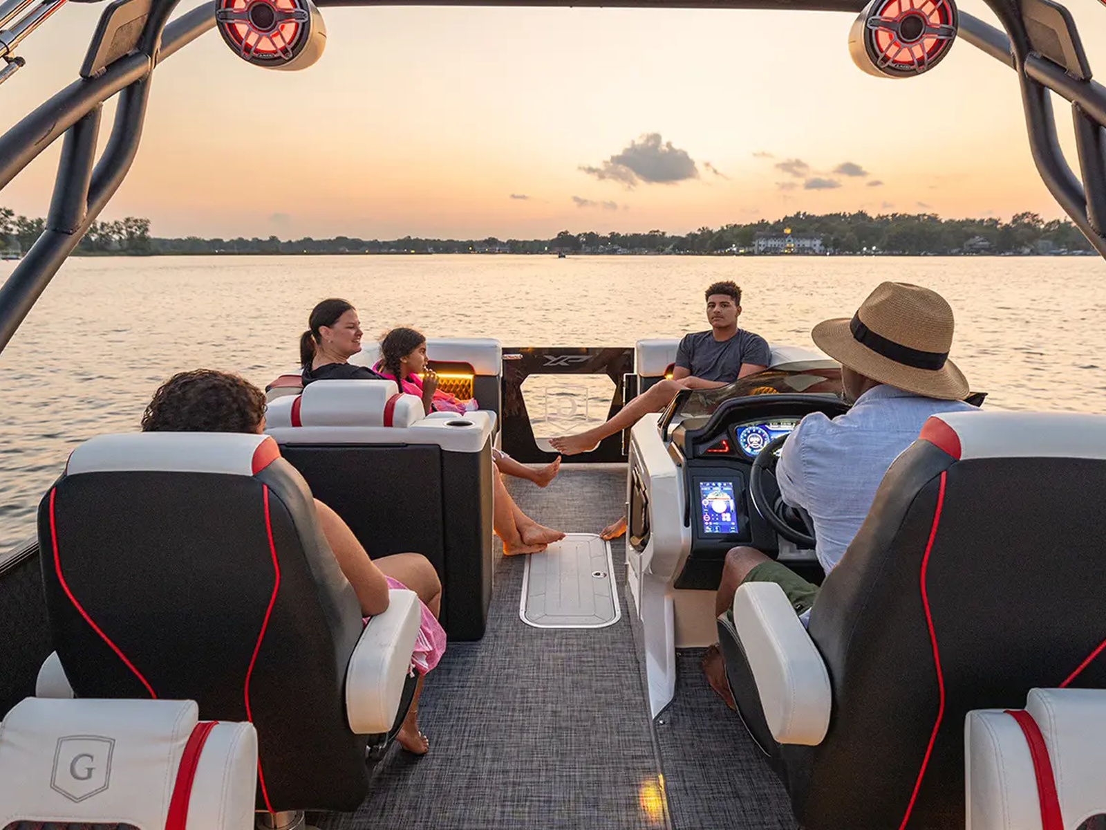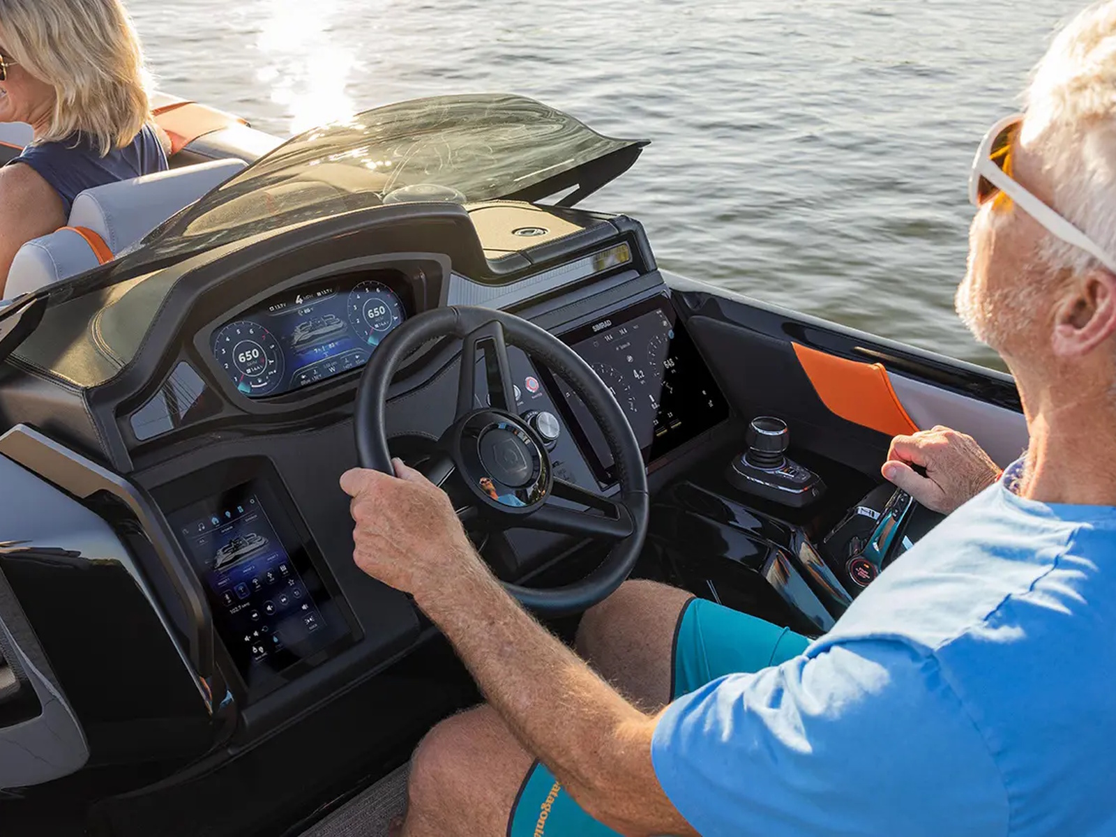 The XP’s helm puts all your boat controls  at your fingertips—12" display, intuitive controls, and a cooled cupholder—so you can effortlessly captain the day.