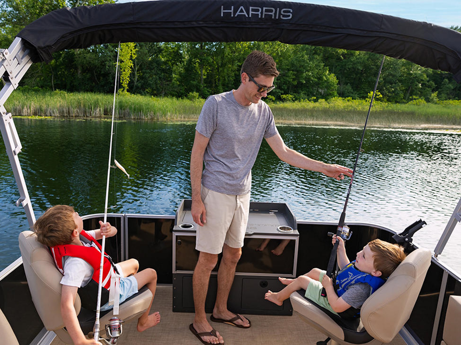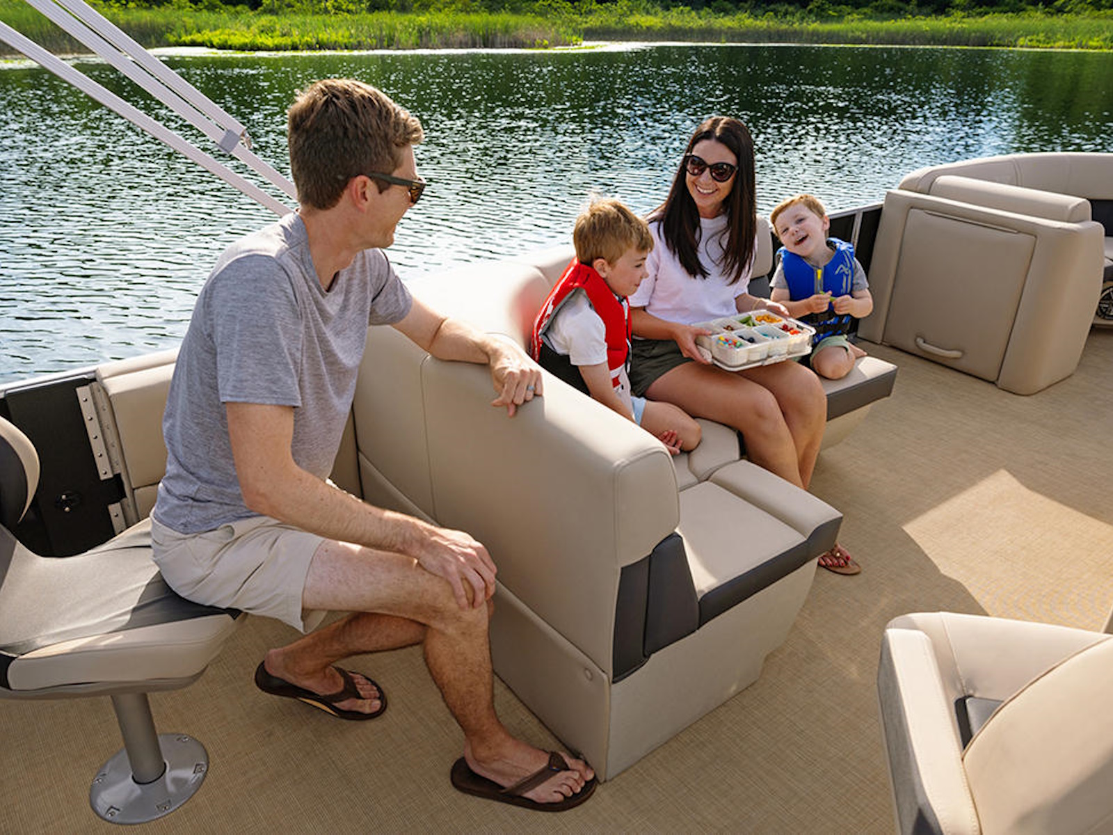 Take to the water on a craft built with value in mind that also includes more than you might expect, including a new 190 (19-foot) length, ultra-soft yet extremely durably vinyl upholstery, a reclining helm chair, and standard charging station. Personalizing your pontoon for watersports or fishing is simple—and optional performance packages give you better control on rough water.