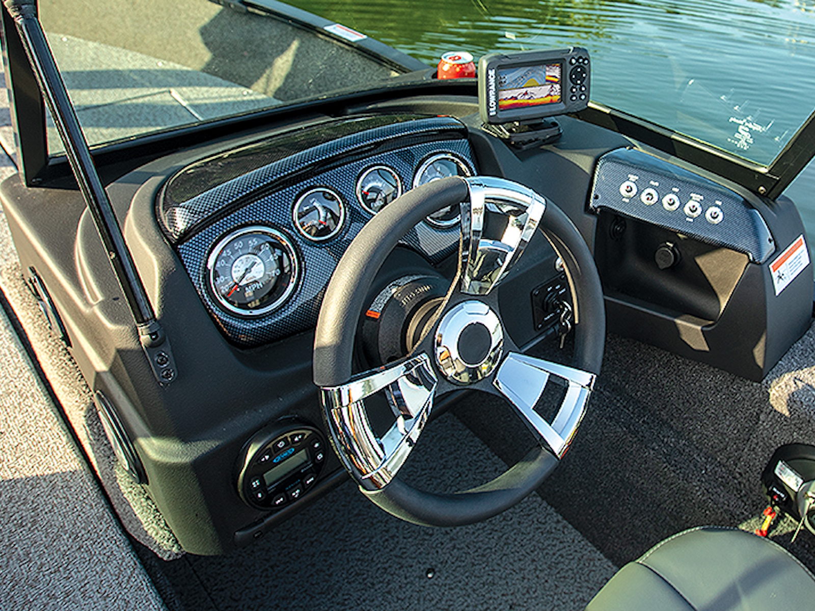 The solid helm of a Lowe Fish and Ski has cool looking accents, 4:1 anti-feedback steering, and a soft grip wheel. Sharp full-size tach, speed, fuel, volt & trim gauges – with room left for other devices.
