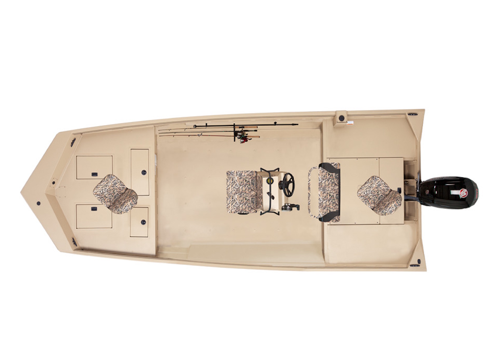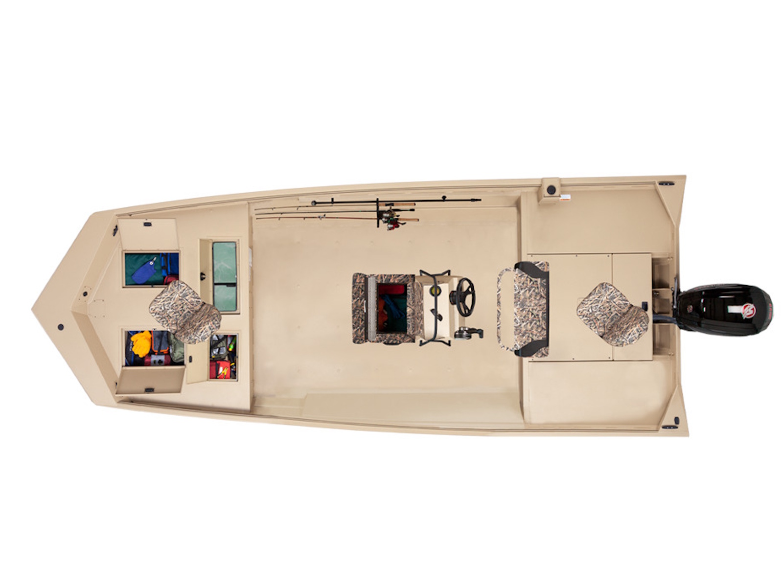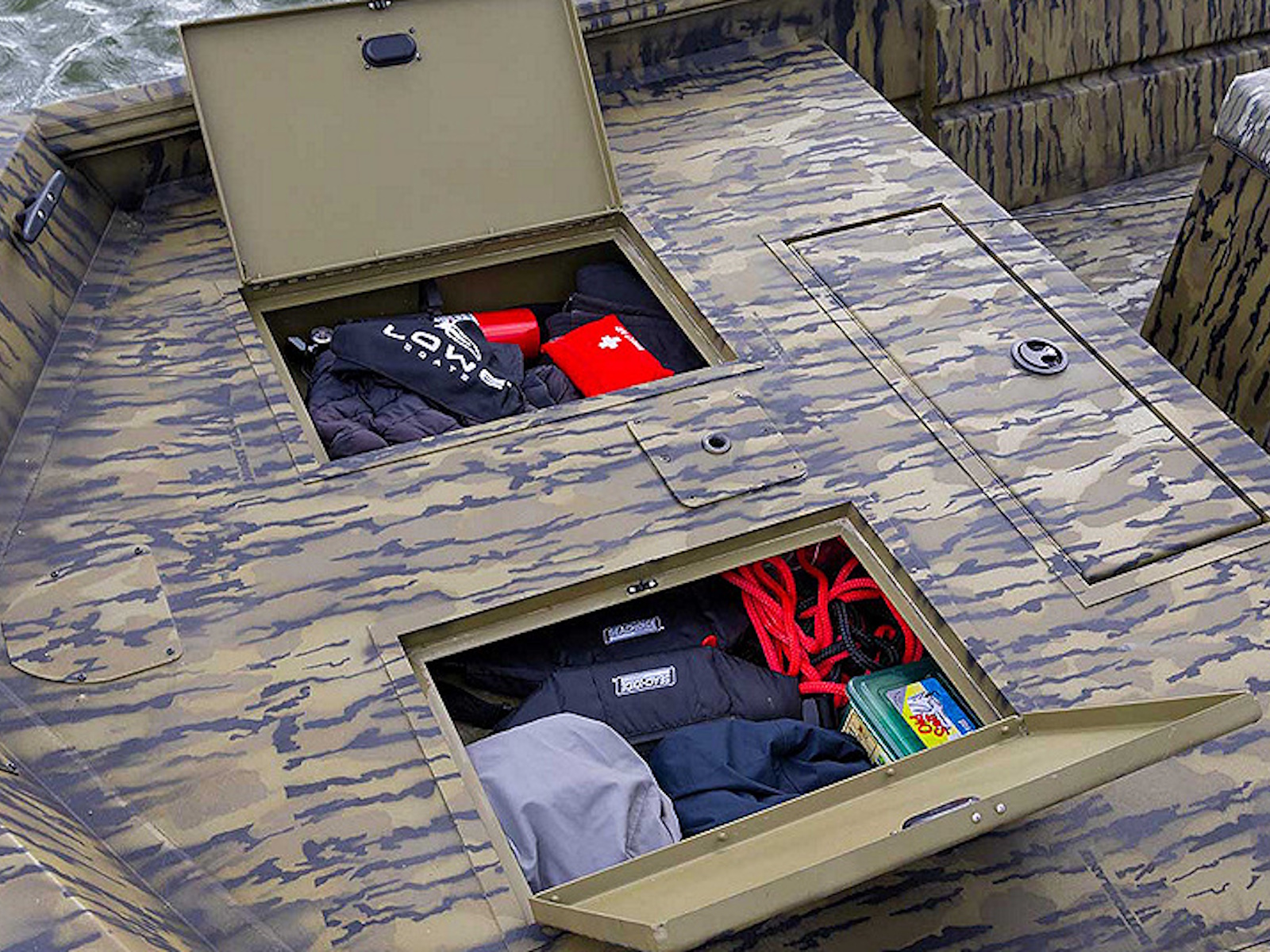 Dual bow storage compartments with door seals and snap latches, and an aerated livewell.
