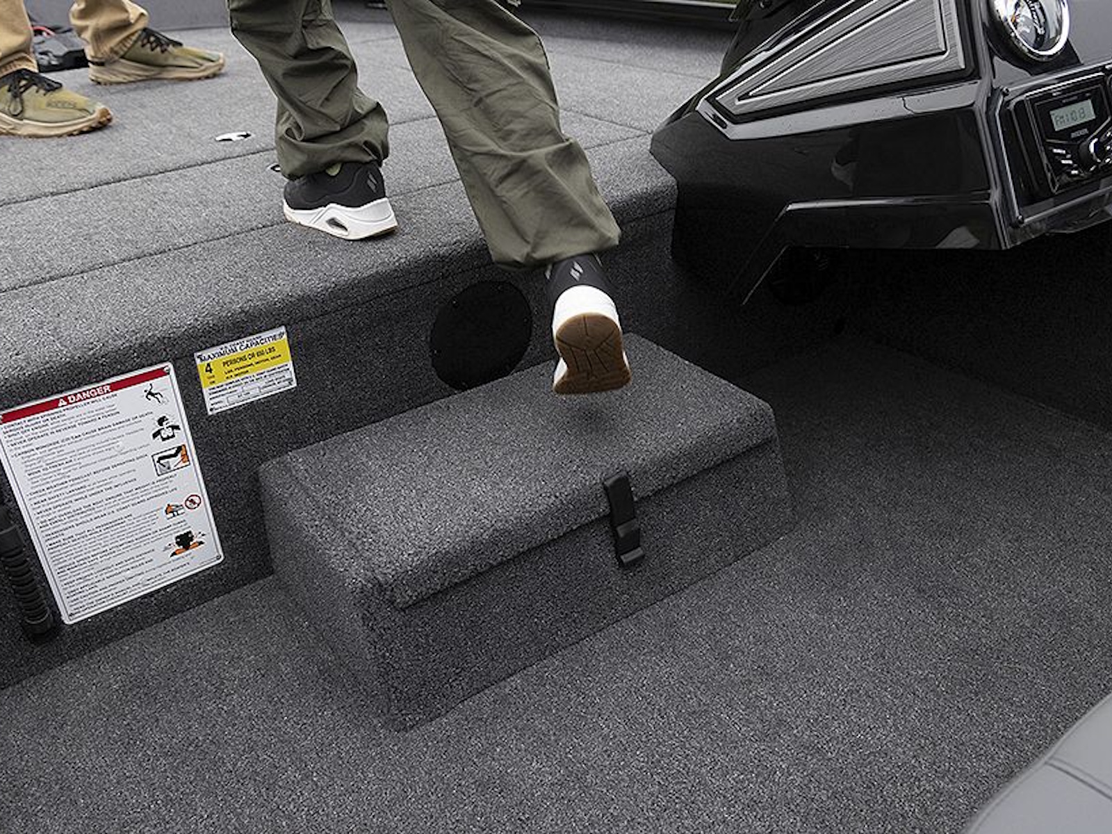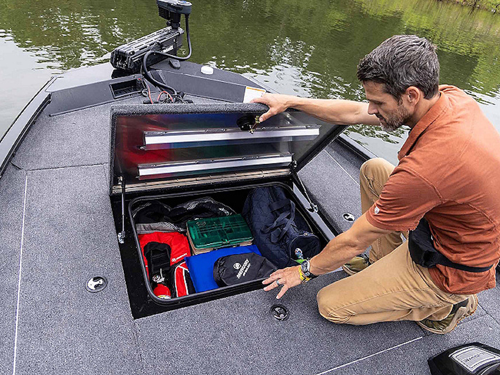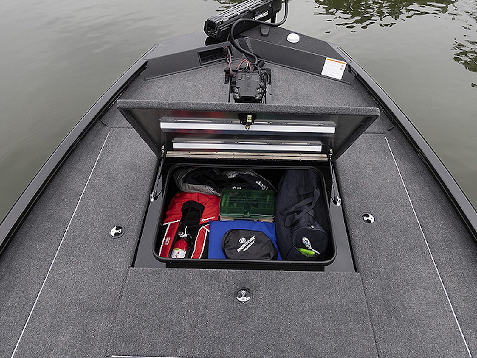 Huge 45.8 sq. ft. self draining bow deck with sealed storage and recessed trolling motor pedal.