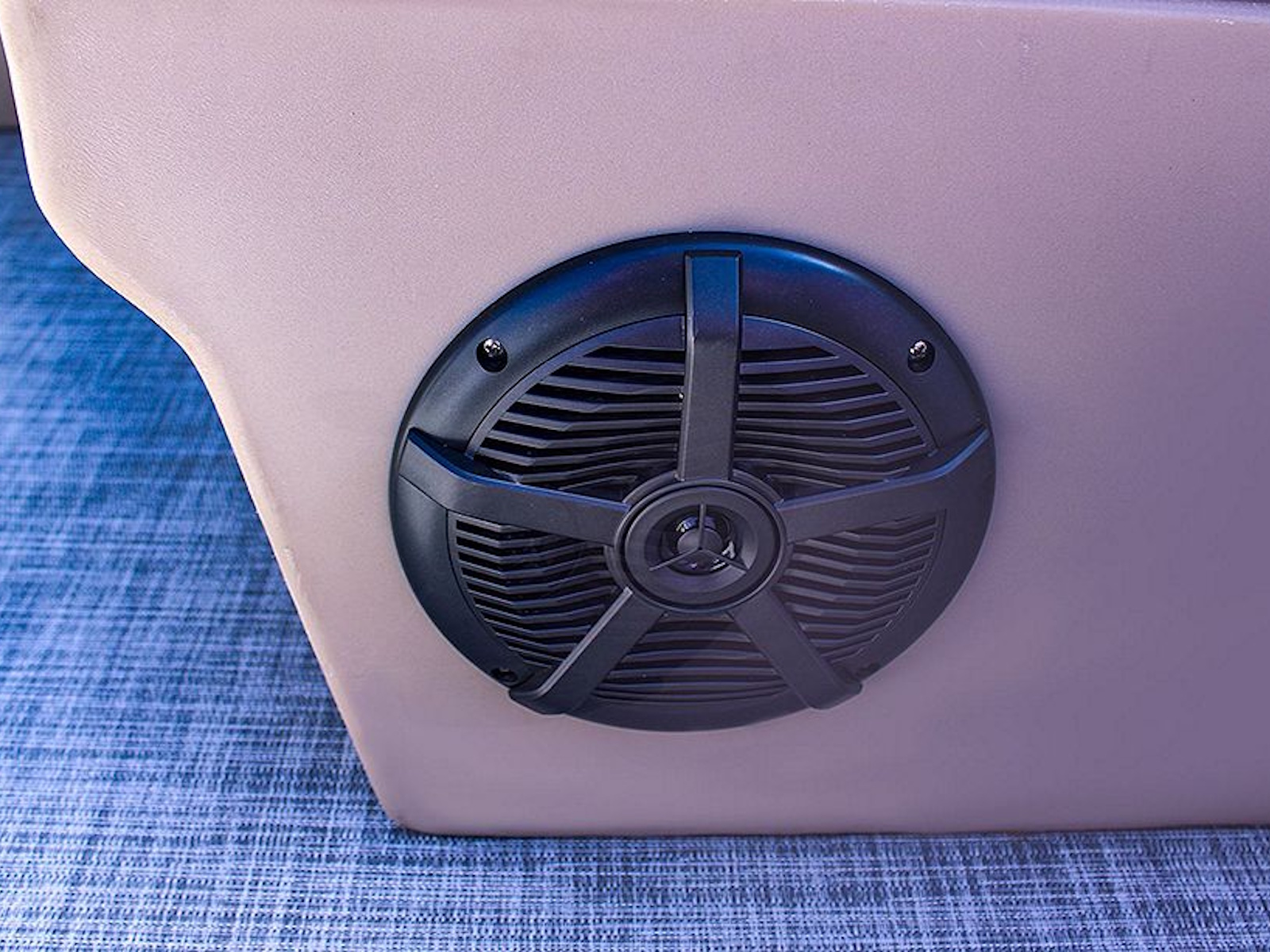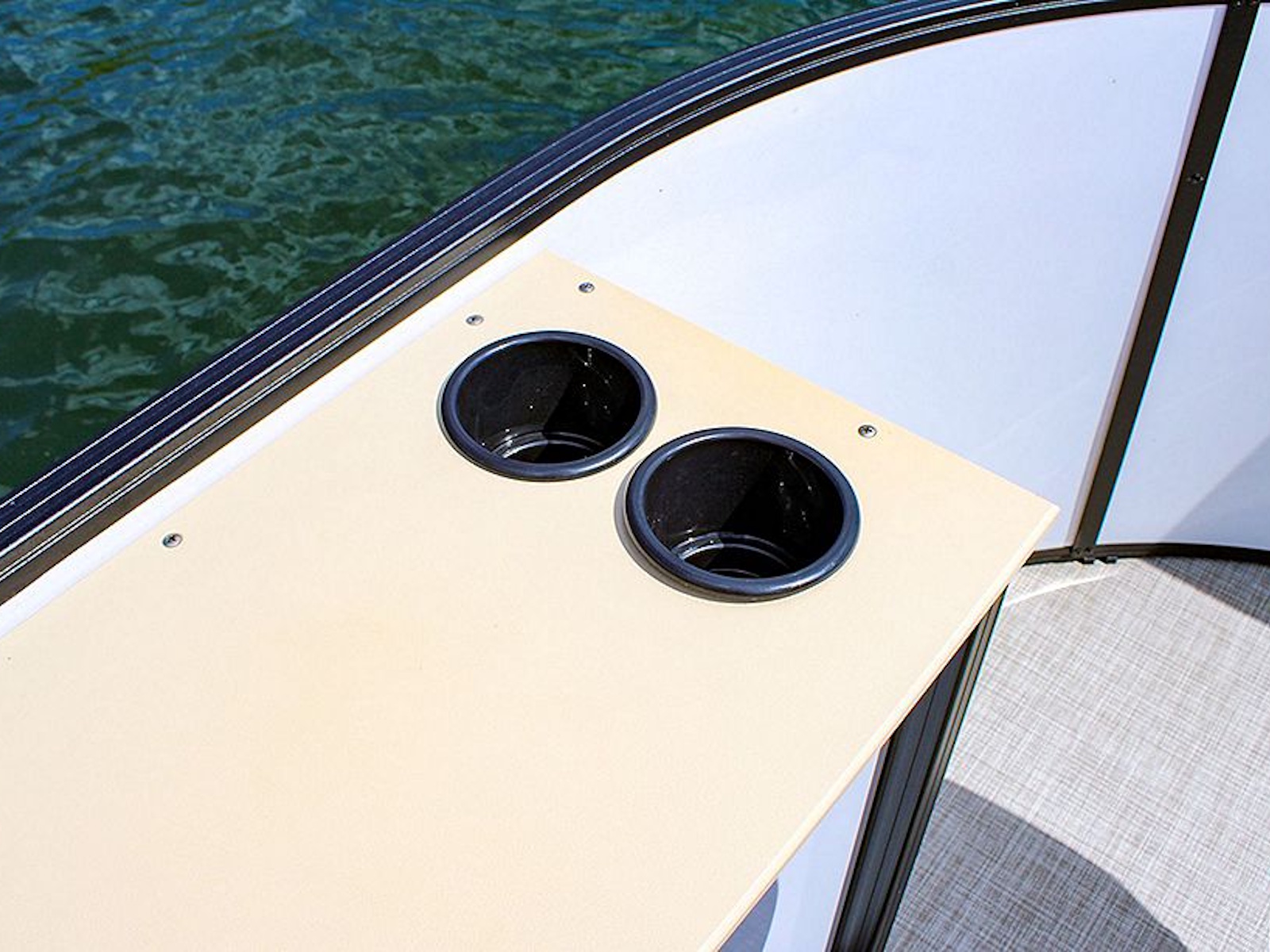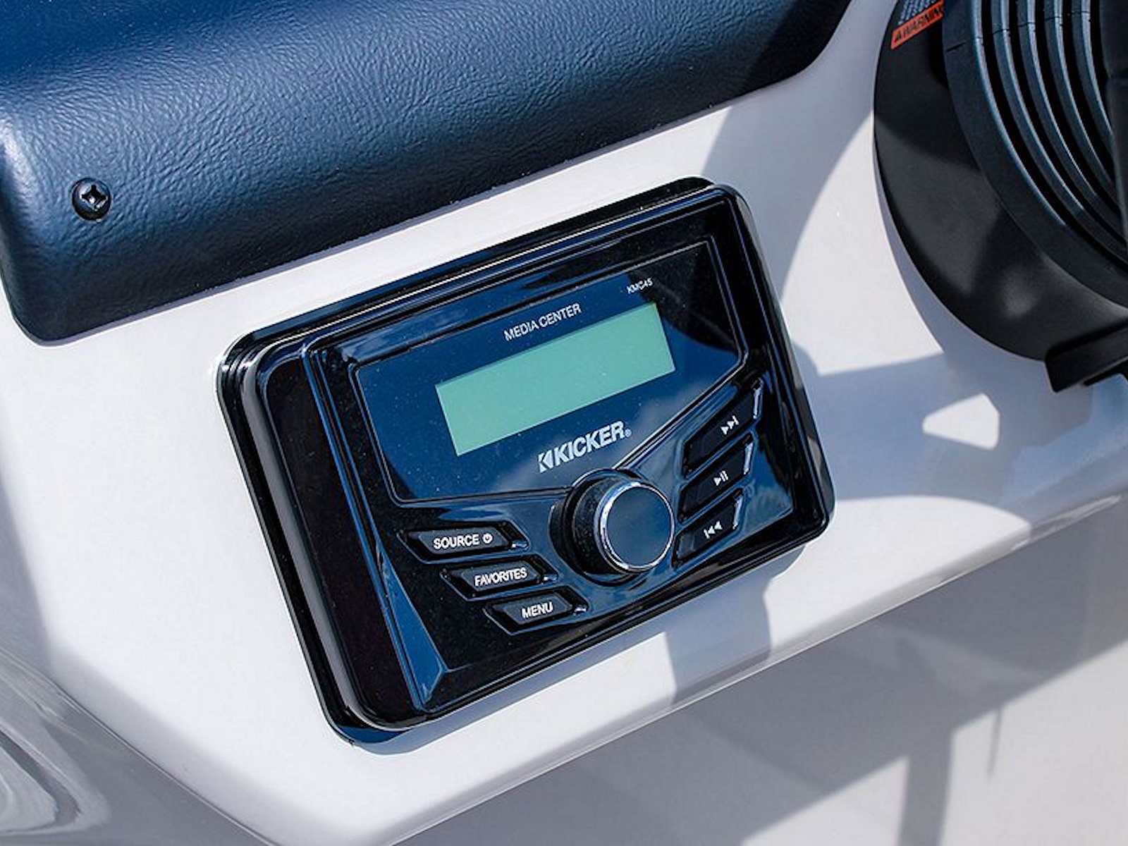 The ergonomically designed fiberglass console boasts a Kicker® KMC45 stereo system, adjustable phone mount, USB port, and a padded chuck tray with two cupholders. Two built-in storage areas offer additional space to stow it all away.