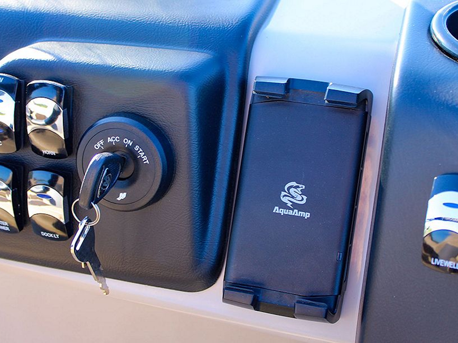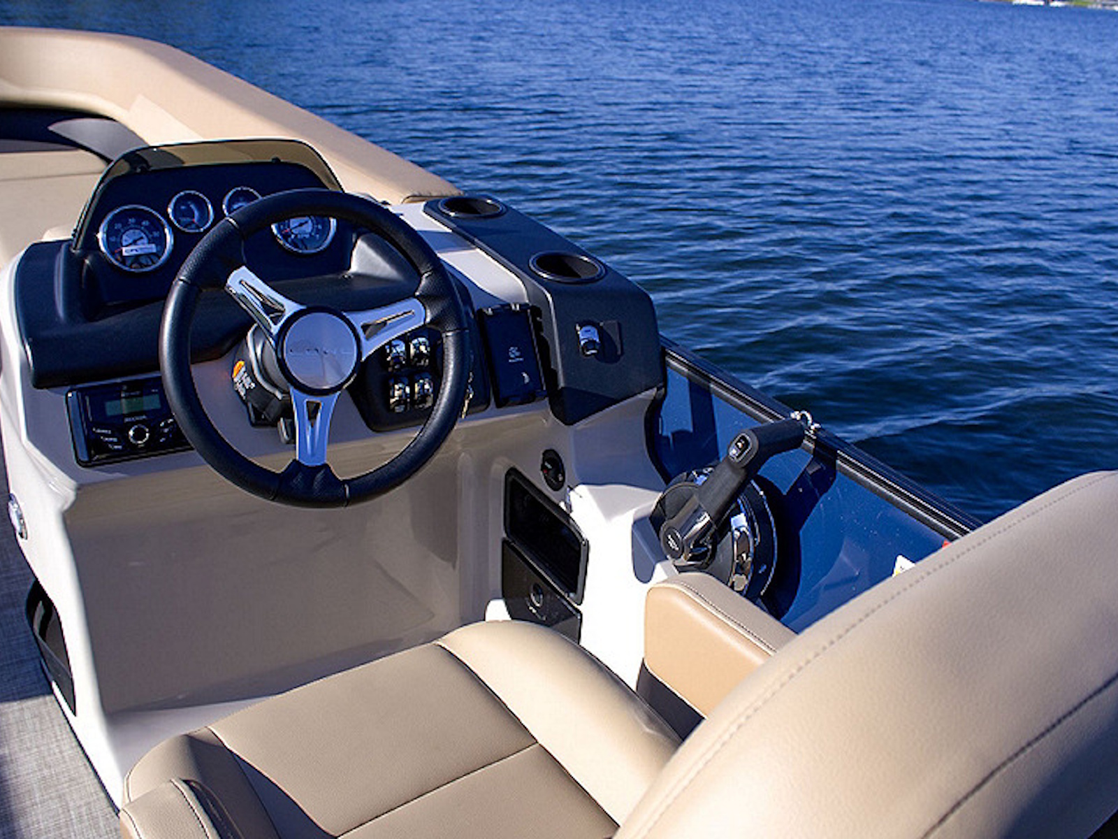 The ergonomically designed fiberglass console boasts a Kicker® KMC45 stereo system, adjustable phone mount, USB port, and a padded chuck tray with two cupholders. Two built-in storage areas offer additional space to stow it all away.