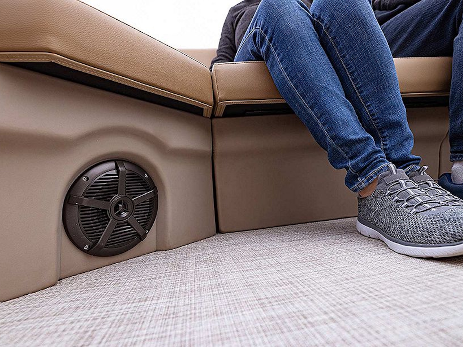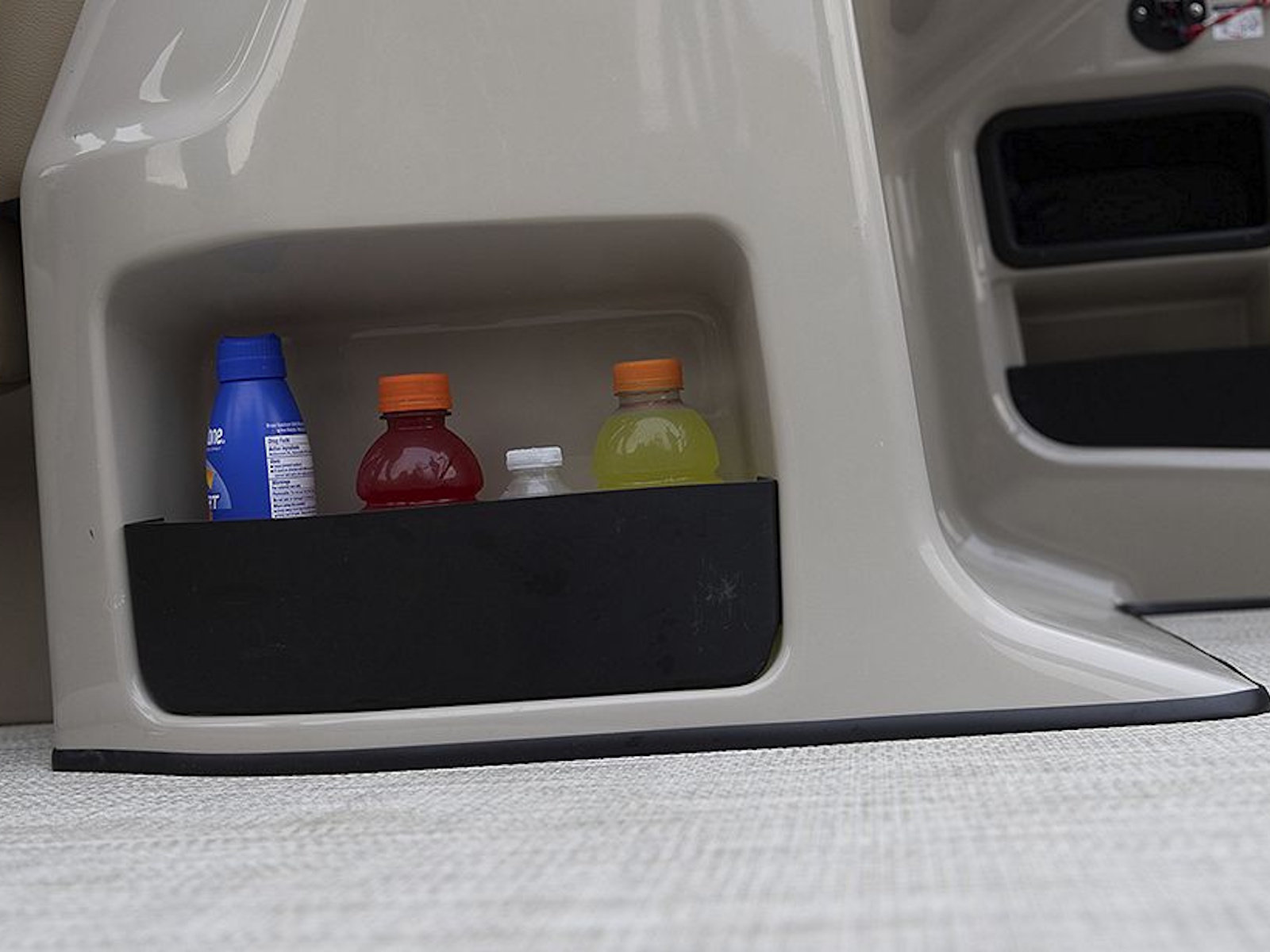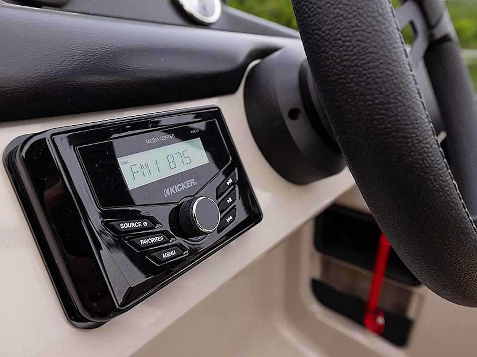 The ergonomically designed fiberglass console boasts a Kicker® audio system, adjustable phone mount, USB port, and a padded chuck tray with two cupholders. Two built-in storage areas offer additional convenience.