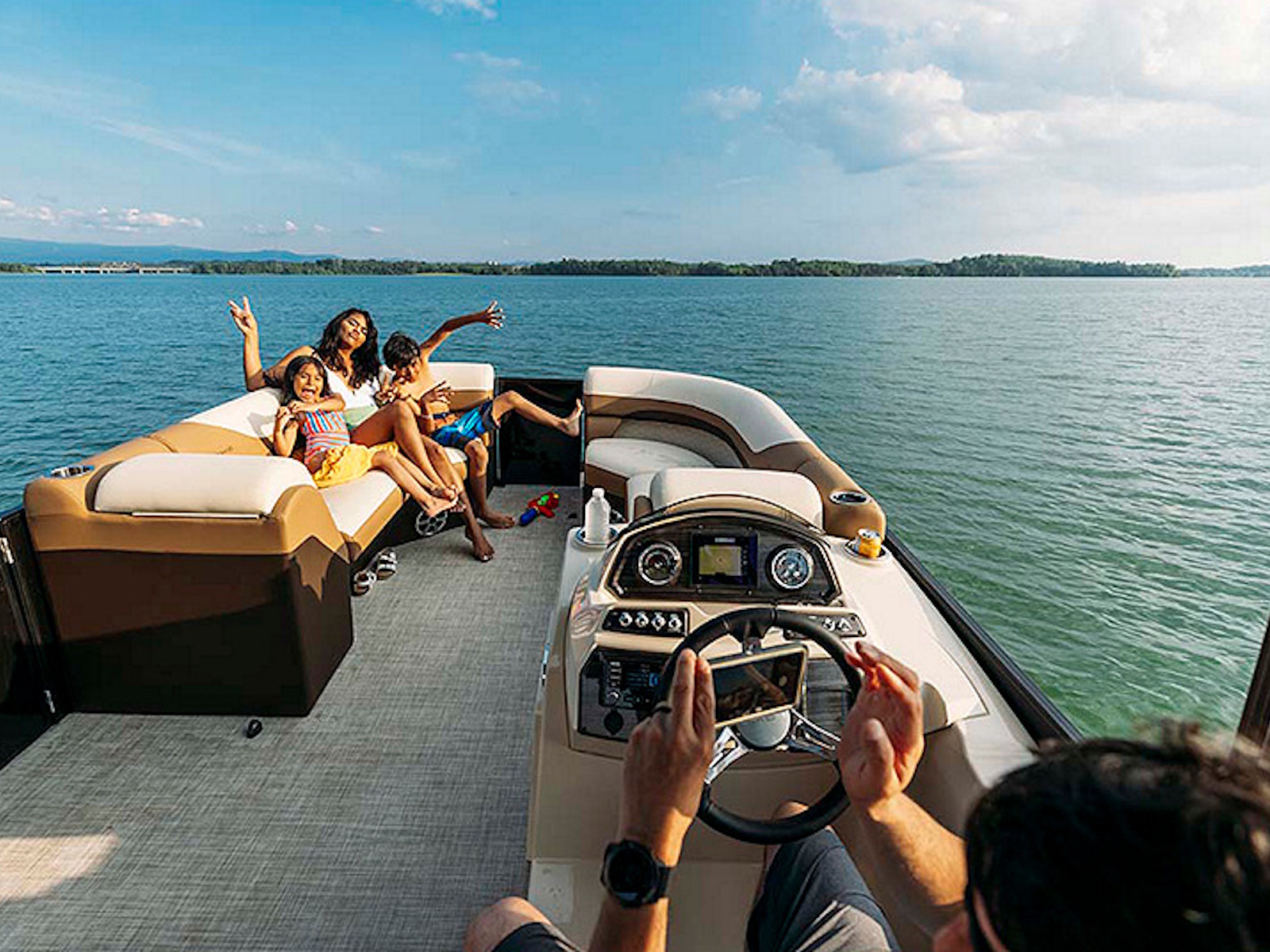 Our pontoon boats enjoy handsome consoles with automobile grade gauges, comfort-grip steering, and ready access to all of the captain's electronics.
