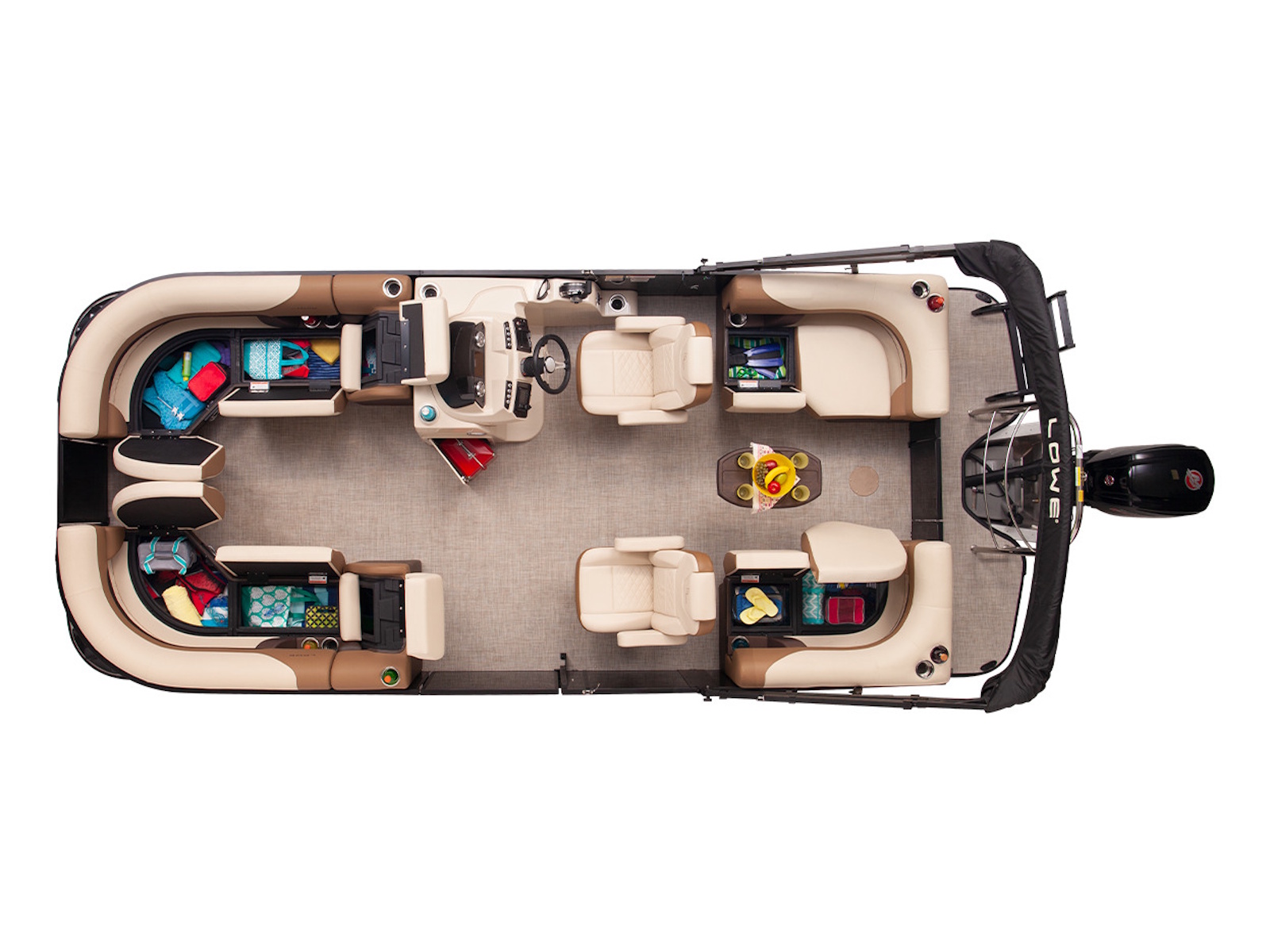 The SS pontoon features a stylish fence with optional two-tone graphics. The interior has premium fabrics with 4 complimentary vinyl colors and a debossed quilted pattern in the storage alcoves. Capped off by comfortable helm chairs for the captain and first mate.