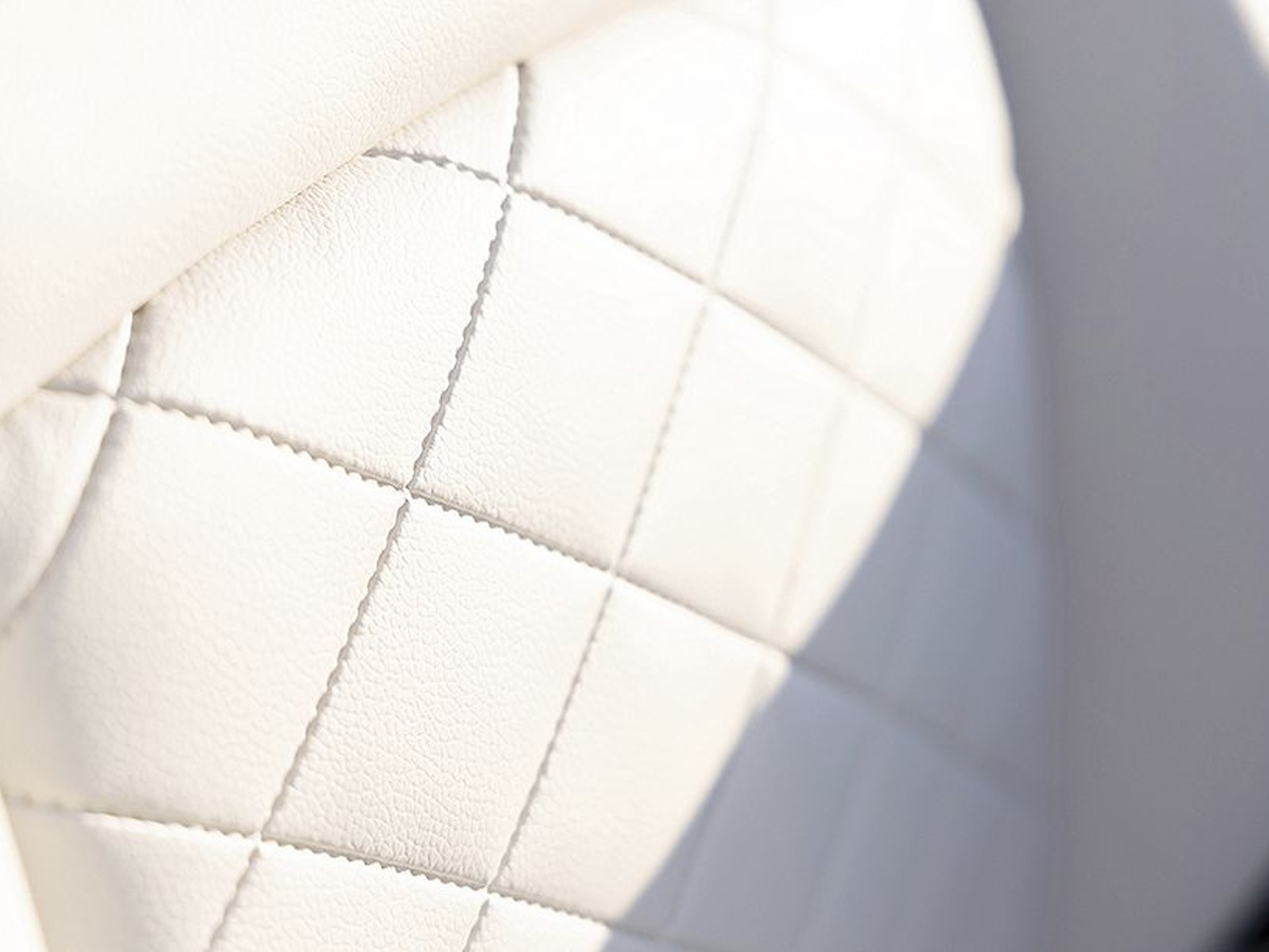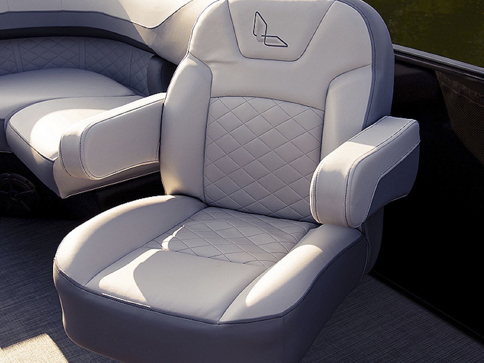 The SS 230 Walk Thru Special features a stylish fence and premium vinyl, embellished with debossed quilted patterns on the furniture. Capped off by comfortable helm chairs for the captain and first mate.