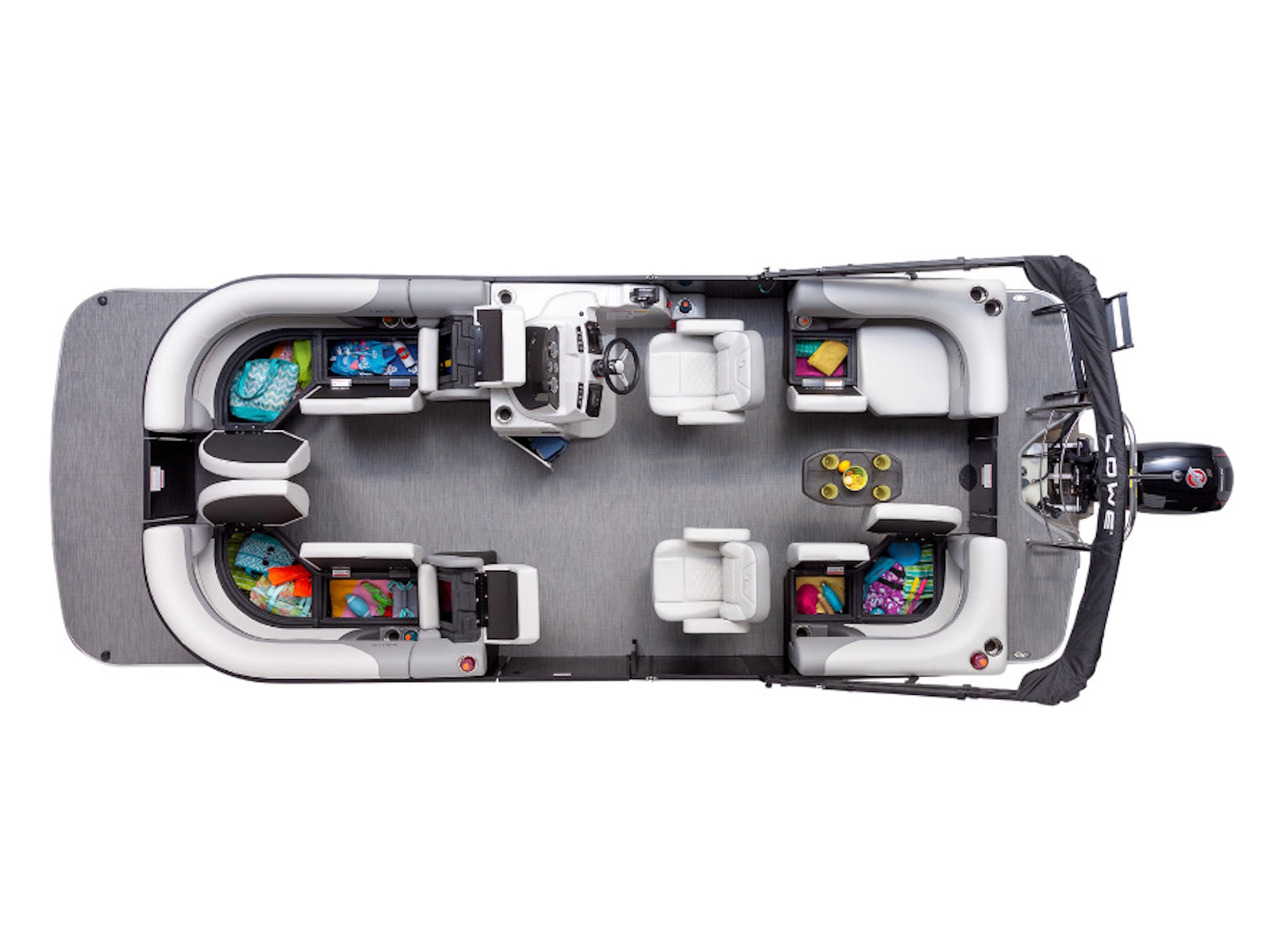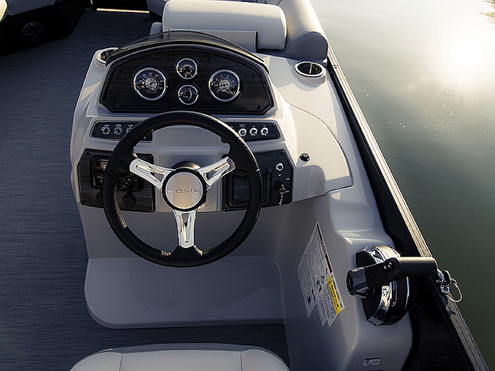 Our SS pontoons feature handsome fiberglass consoles with GPS gauges, a premium chrome steering wheel with a comfortable and confident rubber wheel, and ready access to all the captain's electronics.