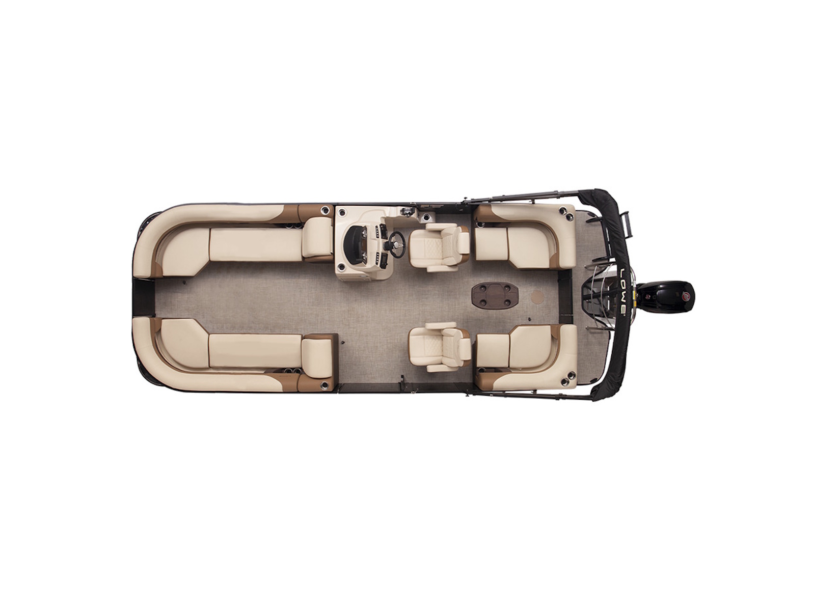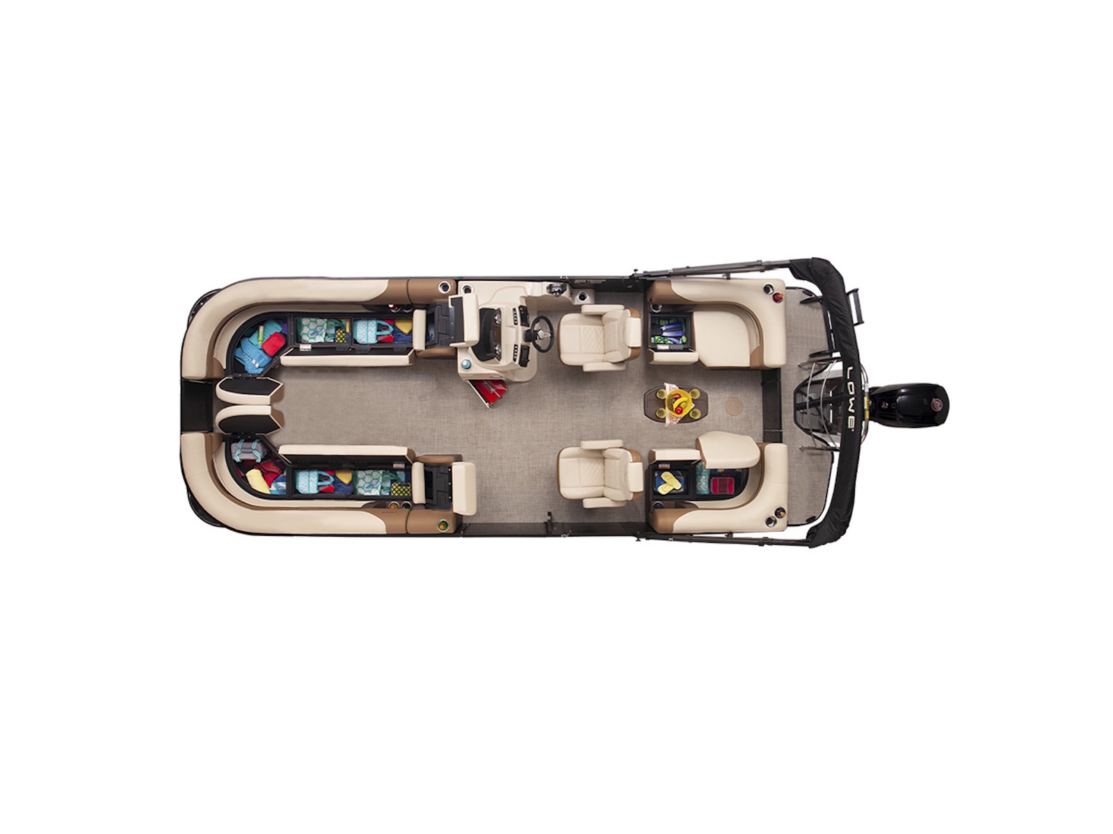 The SS pontoon features a stylish fence with optional two-tone graphics. The interior has premium fabrics with 4 complimentary vinyl colors and a debossed quilted pattern in the storage alcoves. Capped off by comfortable helm chairs for the captain and first mate.