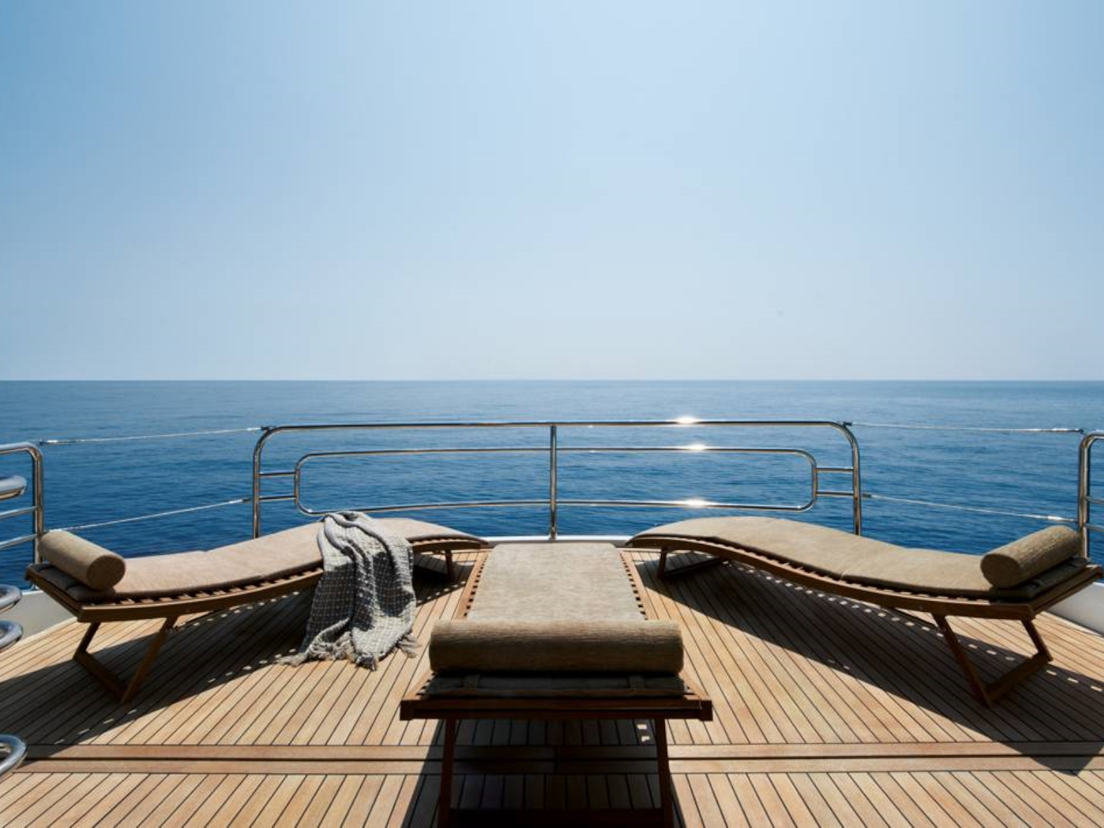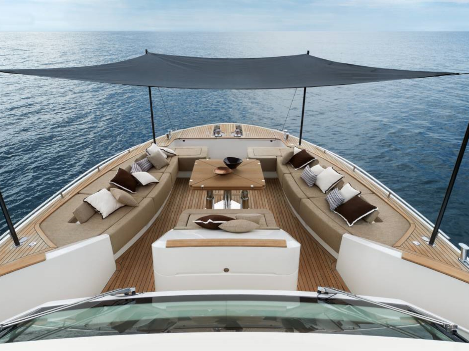 The MCY 86’s exterior spaces are an exemplary expression of Monte Carlo Yachts' style and vision. The range’s Portuguese deck leads to a luxurious, reserved living room on the sea; a true lounge that adapts to the different uses during a day spent onboard. The roomy surface area is ideal for large sun-loungers, comfy sofas and a table for taking meals even in the shade, enjoying the view of the sea with family and guests in a space that is both open and private