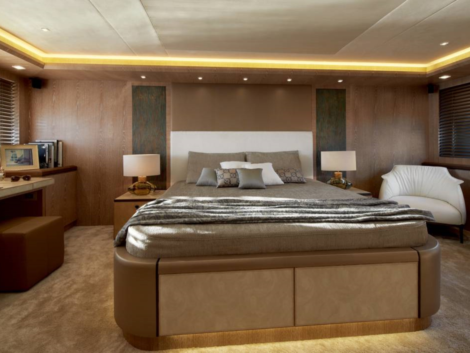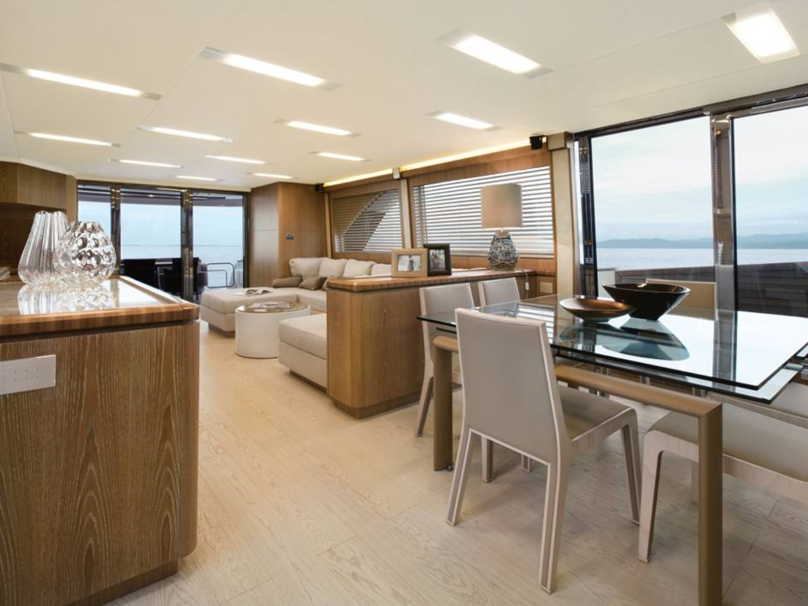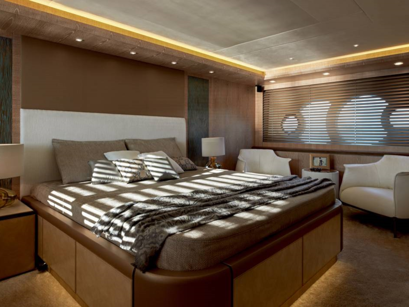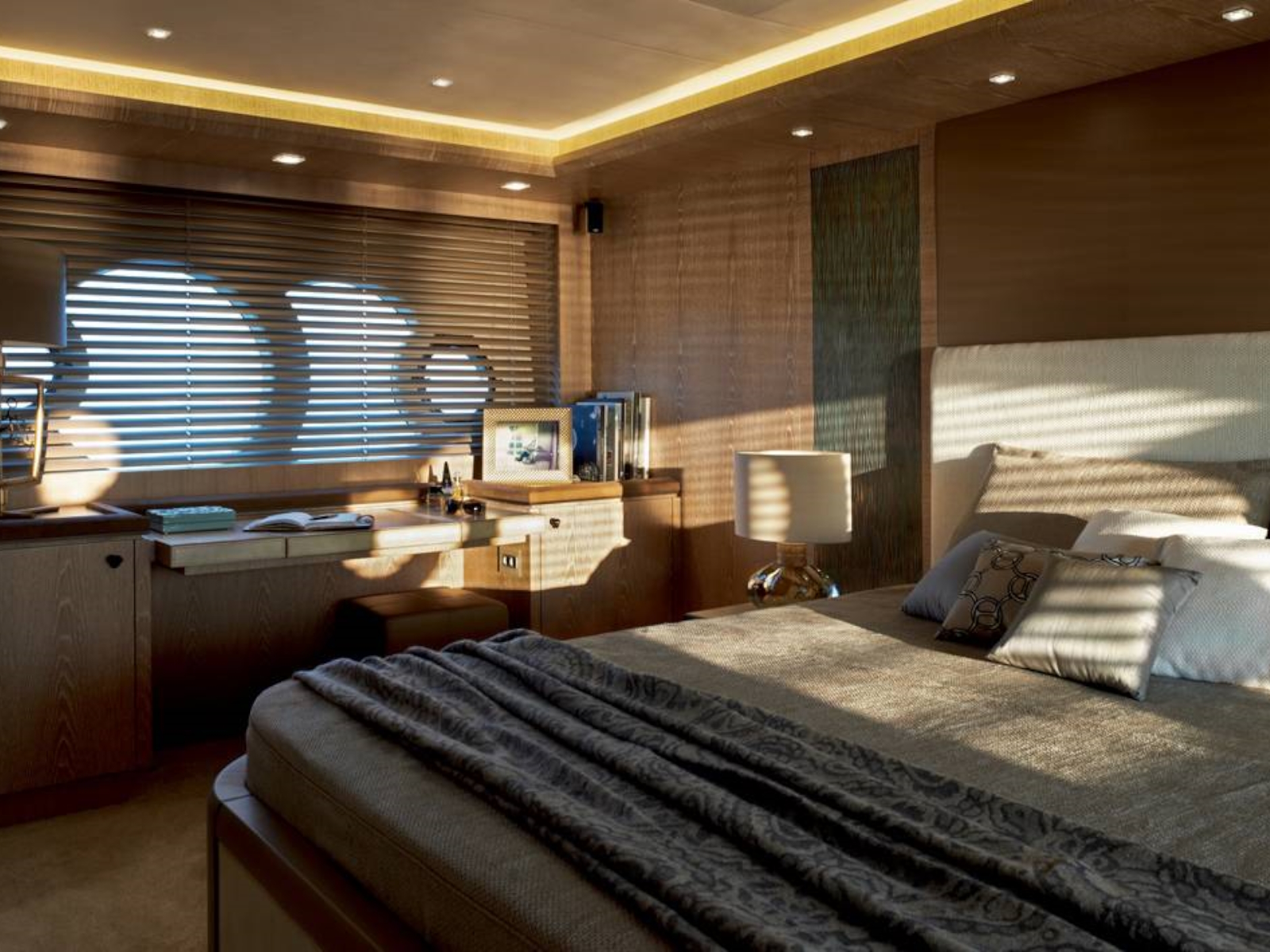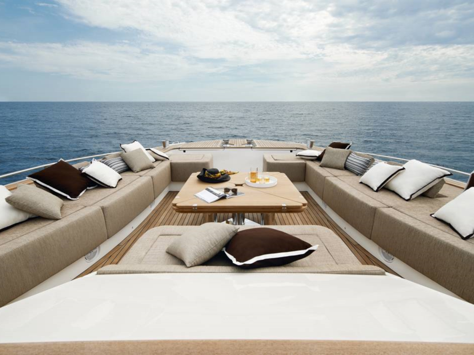 Monte Carlo Yachts such as the MCY 86 are known for their spacious interiors decorated in precious woods and materials such as white alabaster from Volterra, cedarstone marbles, moka cream limestone and hand-made Venetian Murano glass mosaics, and only the very best materials, fabrics and accessories available from the world’s preeminent fashion and design houses such as Hermès, Armani, Poltrona Frau and Pierre Frey.