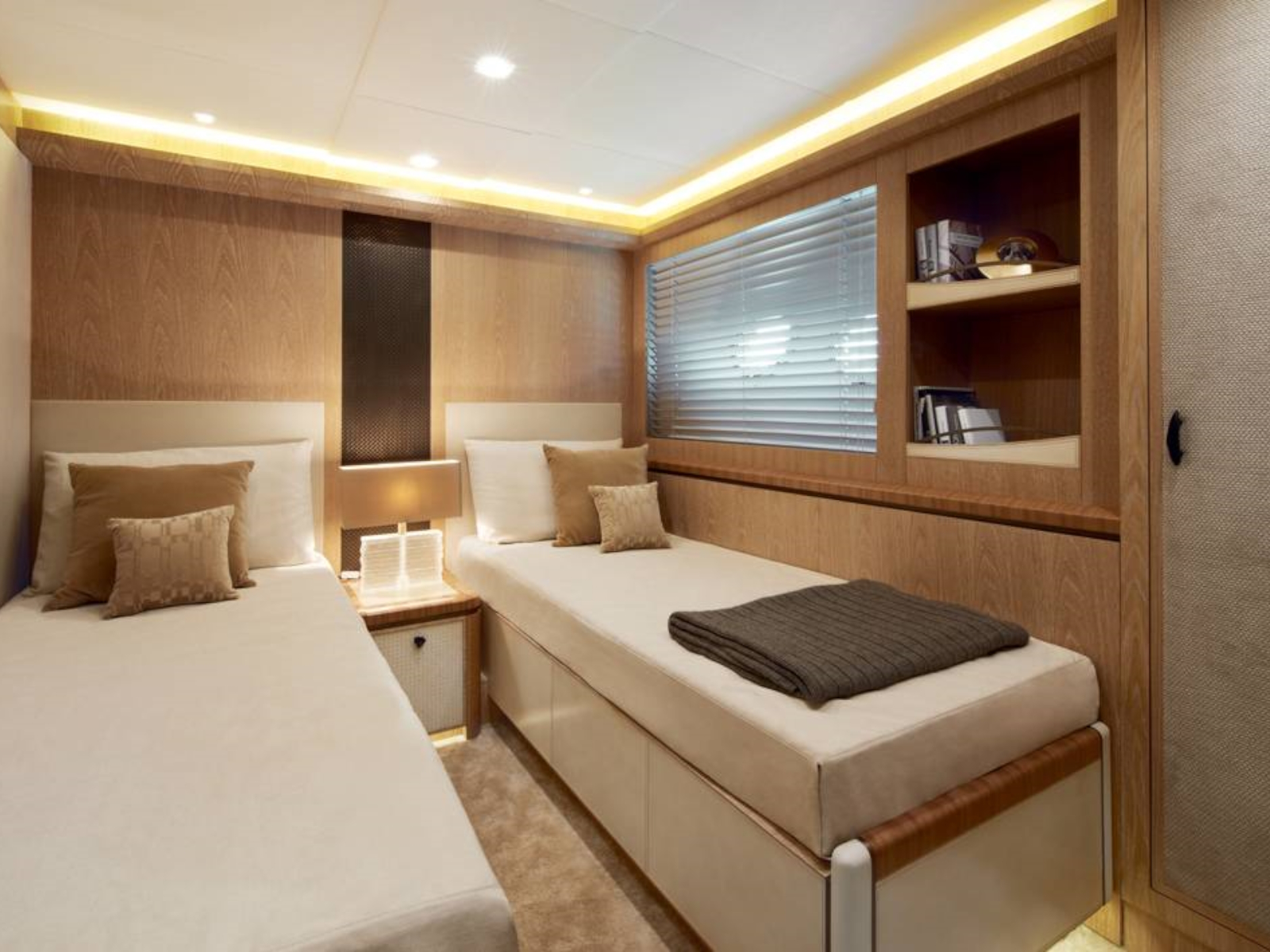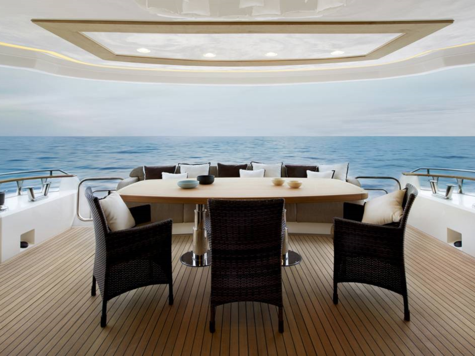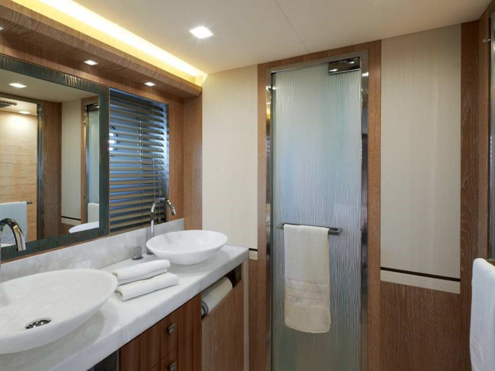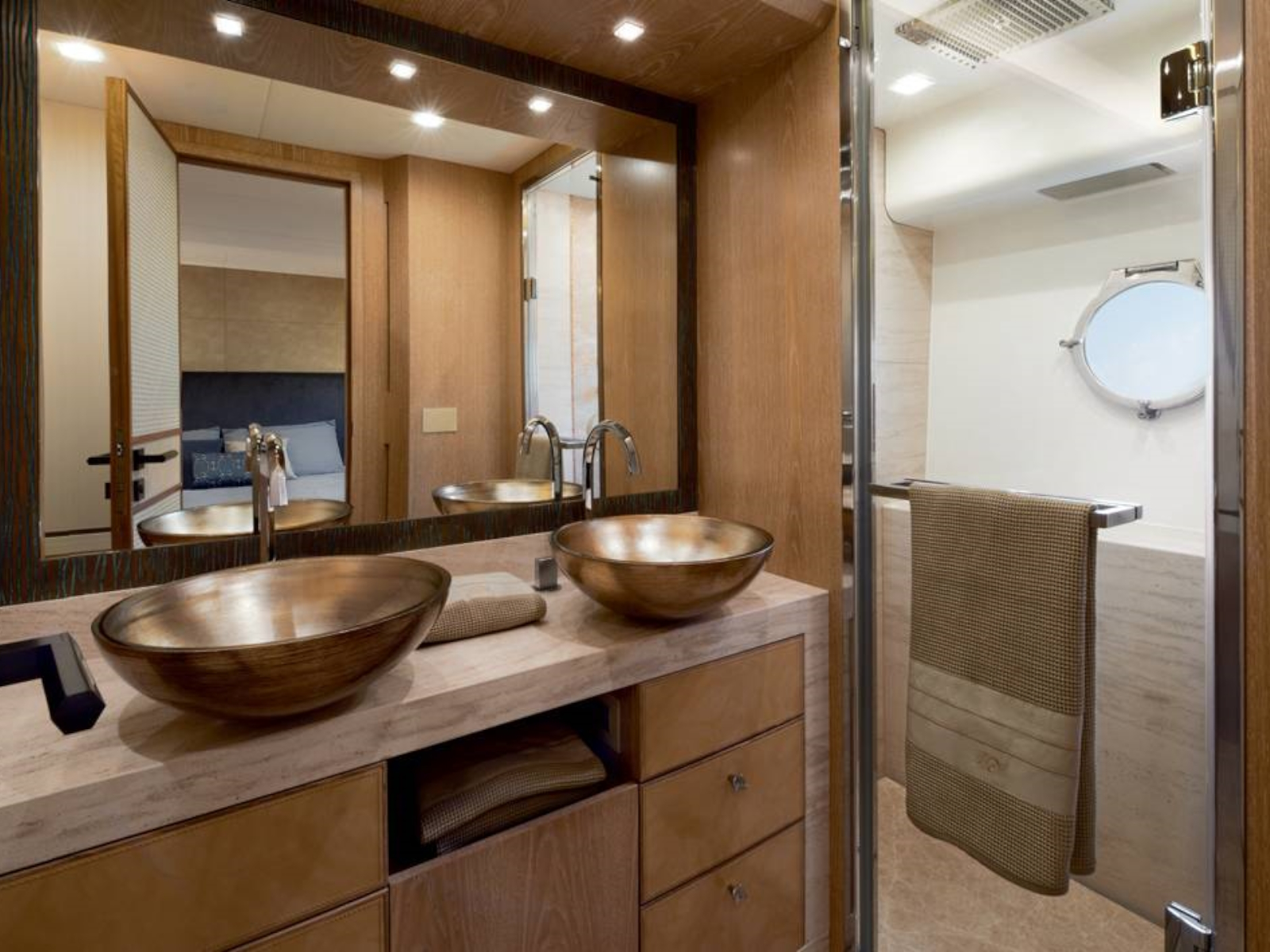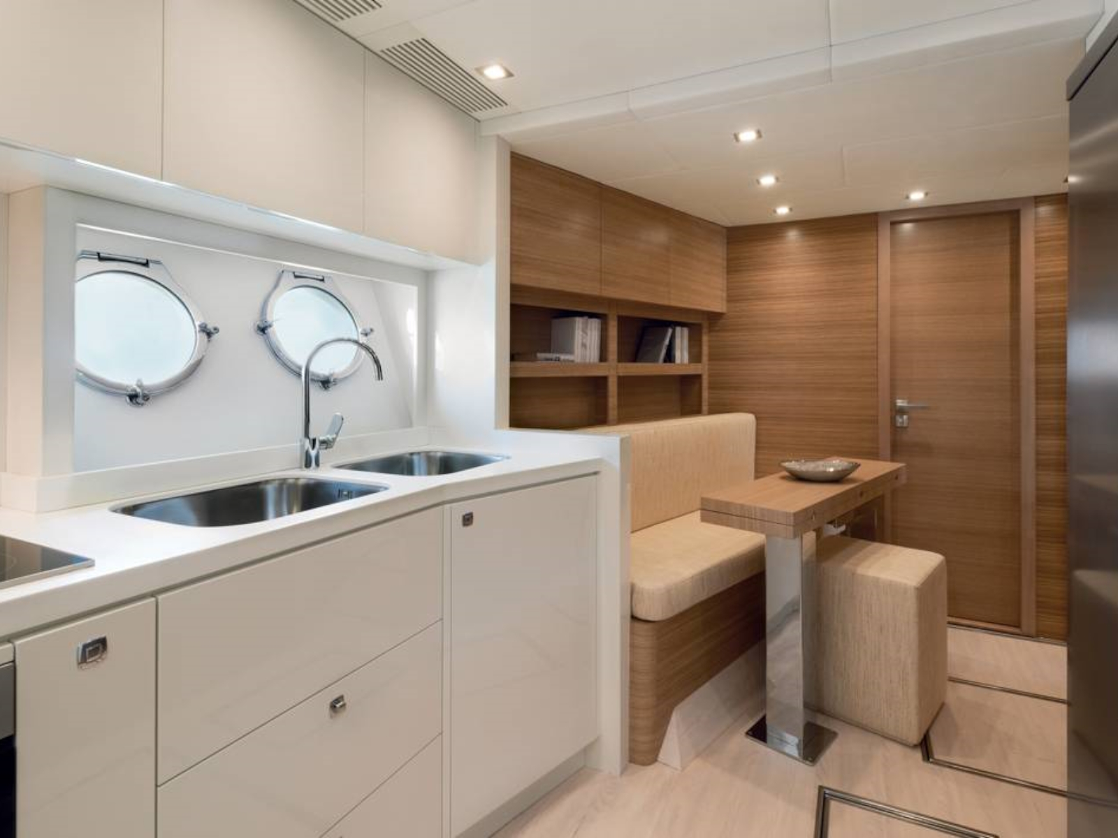 Monte Carlo Yachts such as the MCY 86 are known for their spacious interiors decorated in precious woods and materials such as white alabaster from Volterra, cedarstone marbles, moka cream limestone and hand-made Venetian Murano glass mosaics, and only the very best materials, fabrics and accessories available from the world’s preeminent fashion and design houses such as Hermès, Armani, Poltrona Frau and Pierre Frey.