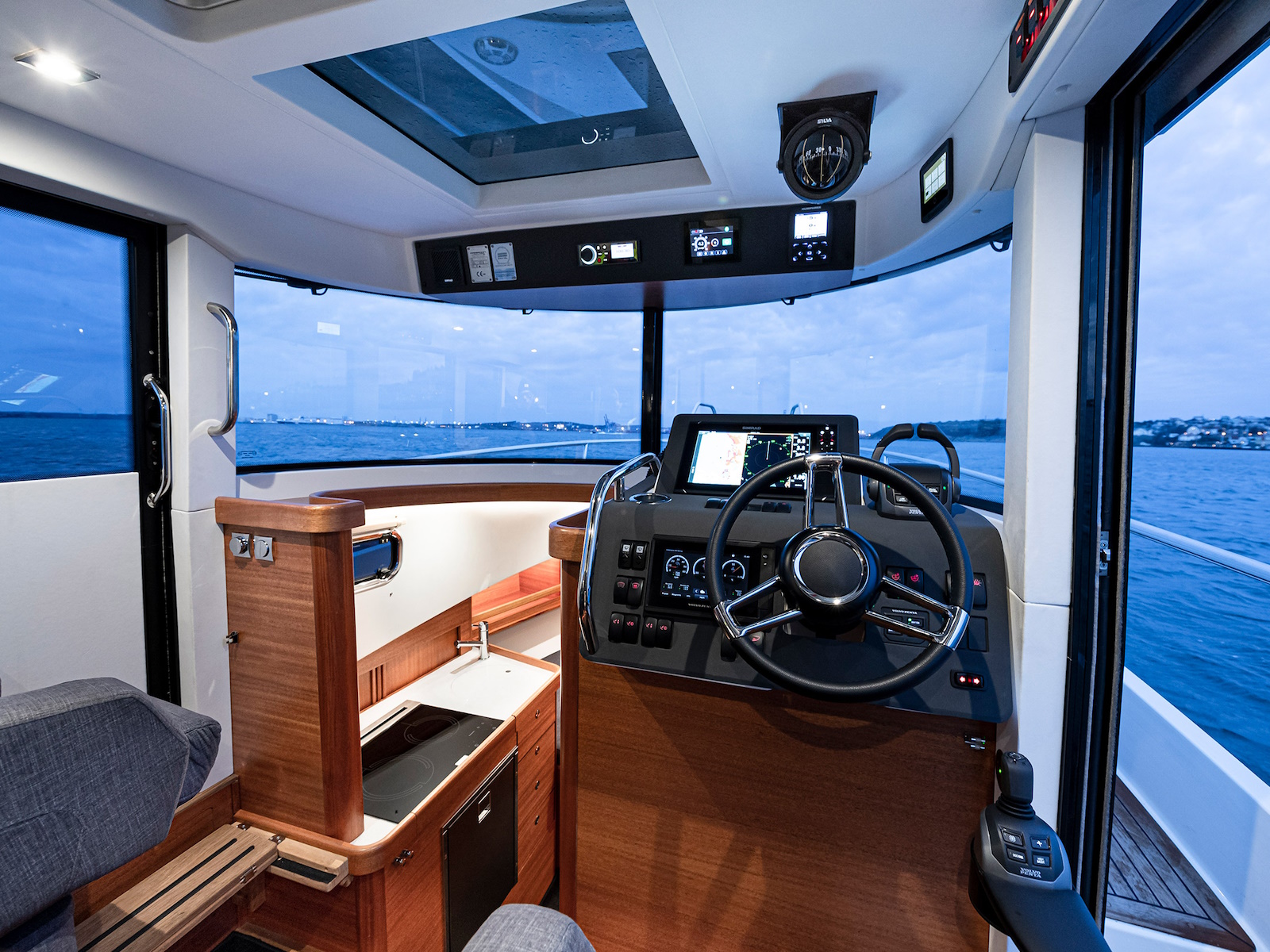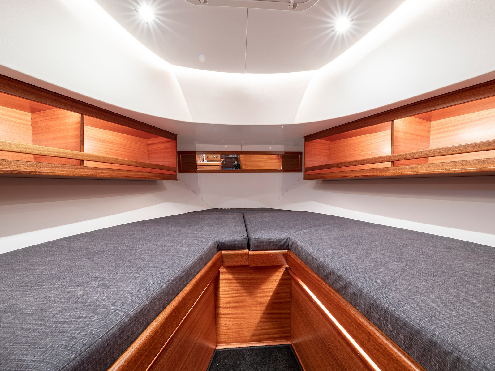 Compared to the previous P31 Flybridge model the hull of the is 40 cm longer and also 10 cm higher. The extra length improve already excellent seagoing properties and reduce planning threshold. The increased hull height allows the P31 Fly to be fitted with dual Volvo Penta D4-320 DPI engines. The aft deck is completely flush, with effective drainage, to provide maximum surface area and has plenty of stowage both above and below deck. The aft deck has an optional seating arrangement with cushions and a table which makes it a perfect socialising area for 6-8 people. The aft gate comprises two sections that enable opening up the entire after deck.