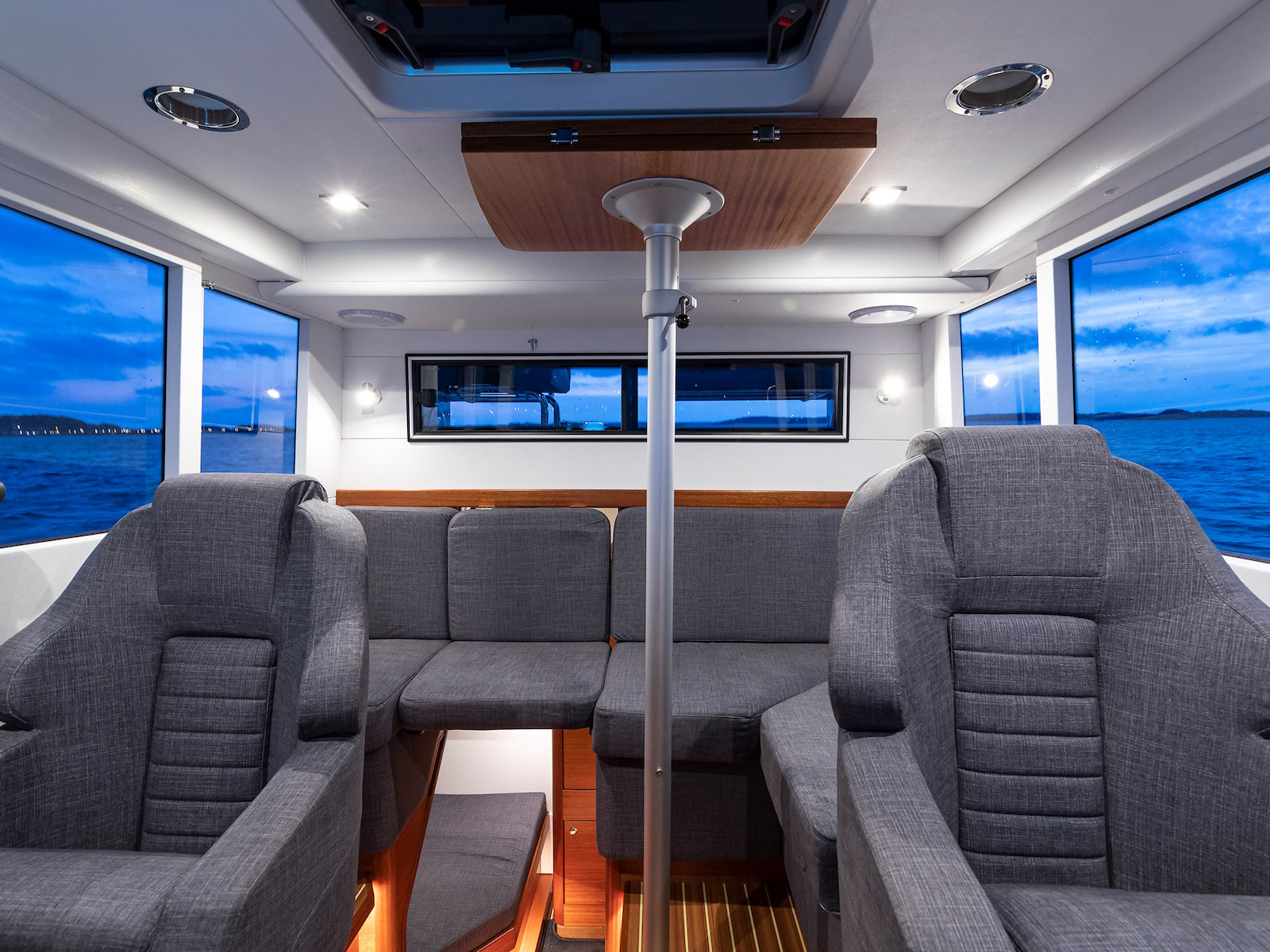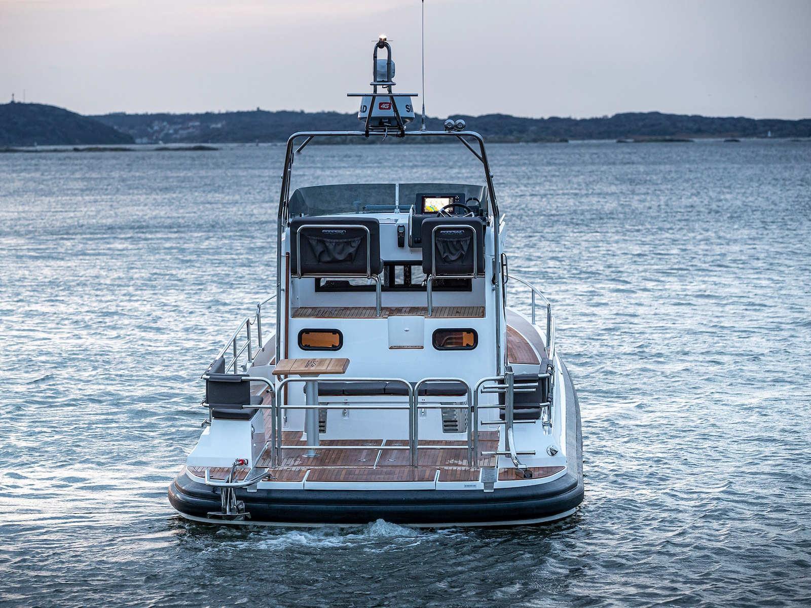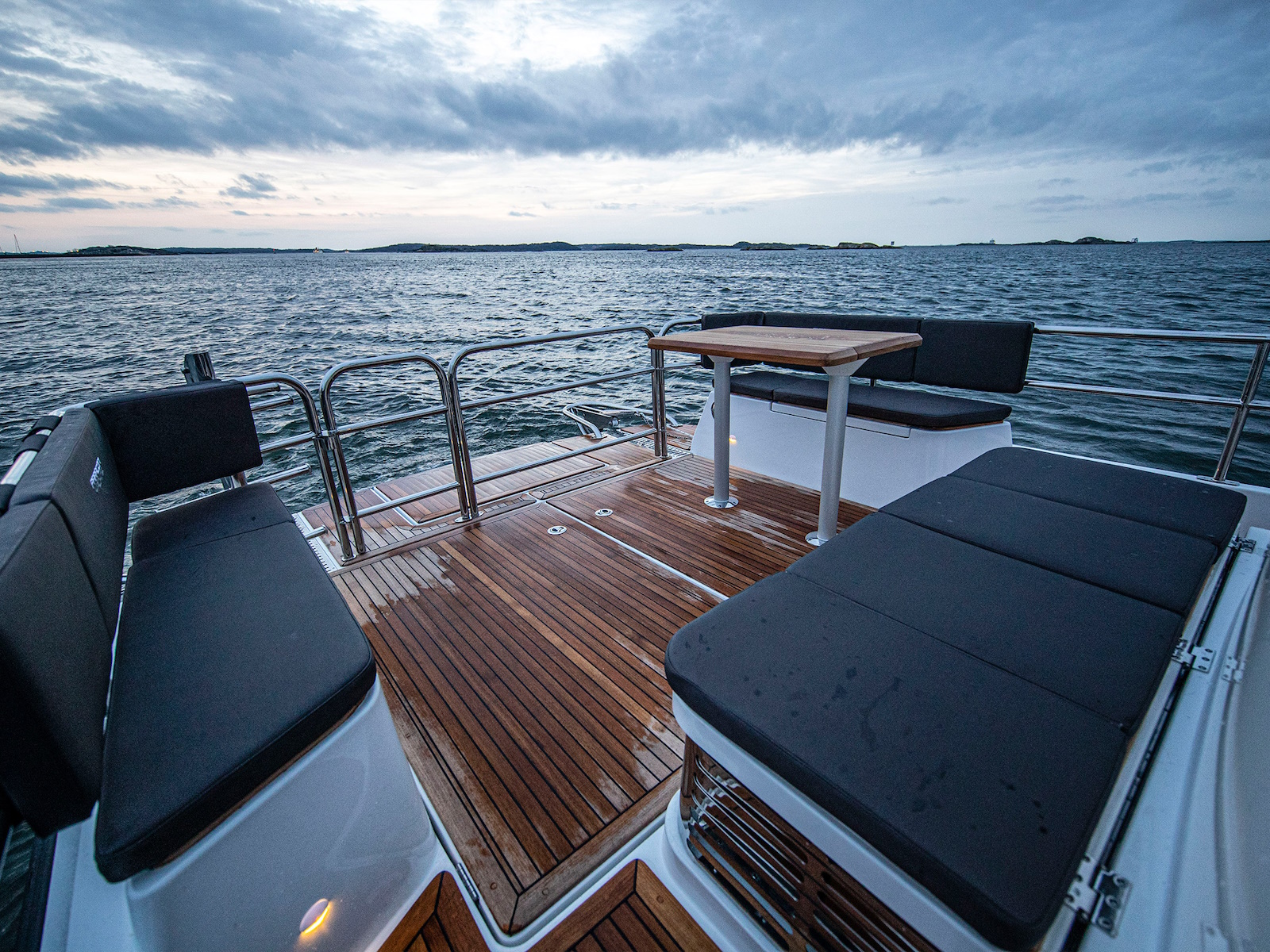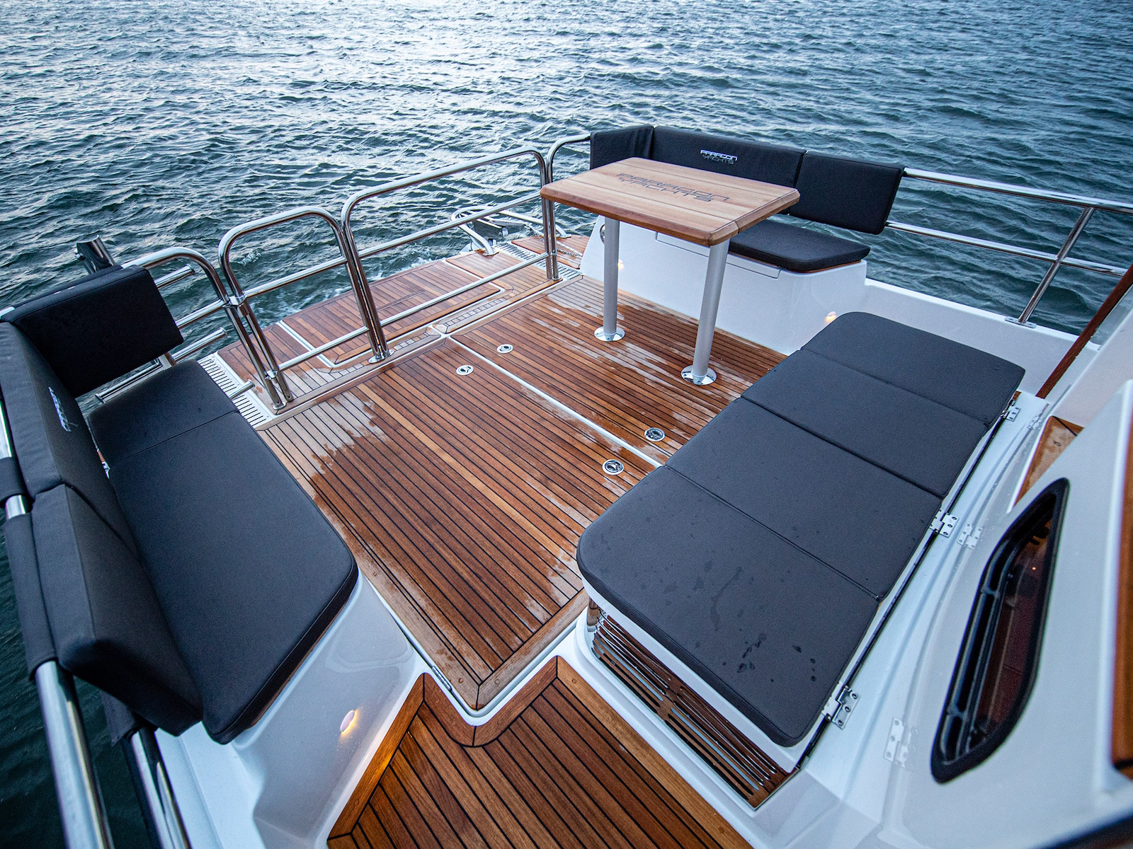 Compared to the previous P31 Flybridge model the hull of the is 40 cm longer and also 10 cm higher. The extra length improve already excellent seagoing properties and reduce planning threshold. The increased hull height allows the P31 Fly to be fitted with dual Volvo Penta D4-320 DPI engines. The aft deck is completely flush, with effective drainage, to provide maximum surface area and has plenty of stowage both above and below deck. The aft deck has an optional seating arrangement with cushions and a table which makes it a perfect socialising area for 6-8 people. The aft gate comprises two sections that enable opening up the entire after deck.