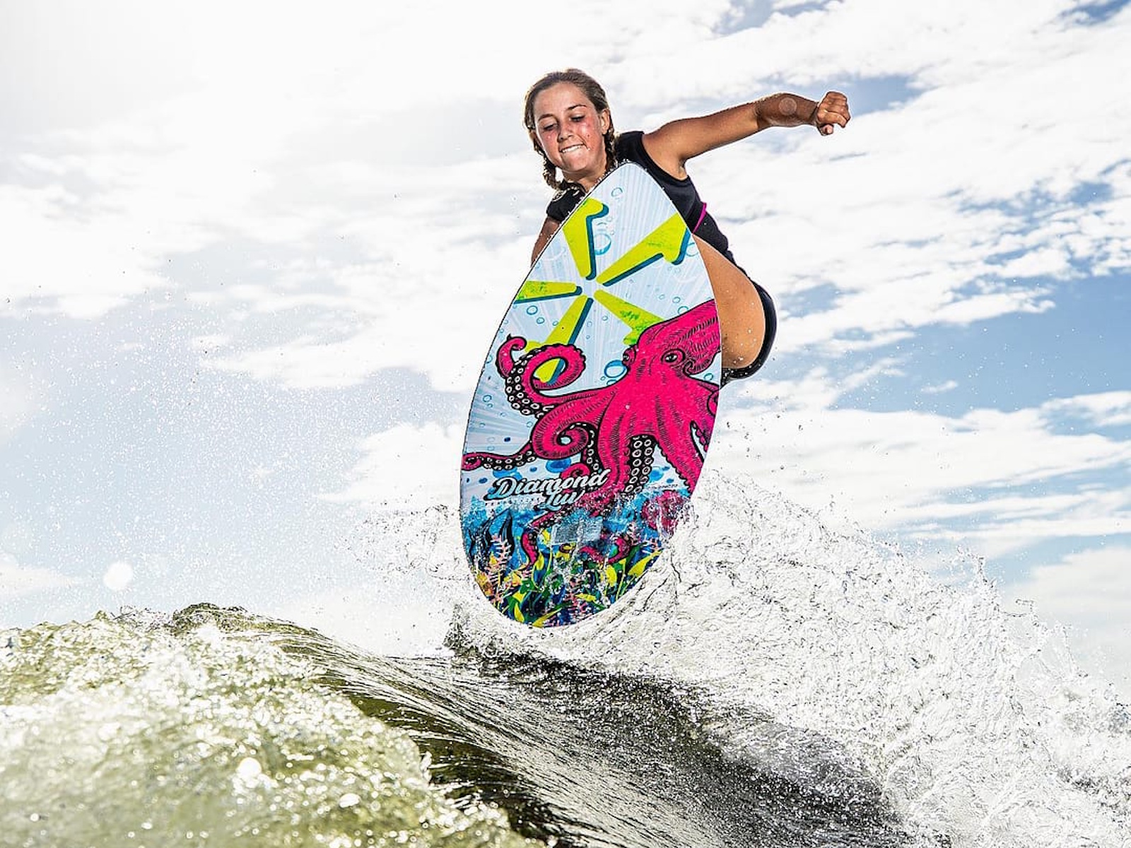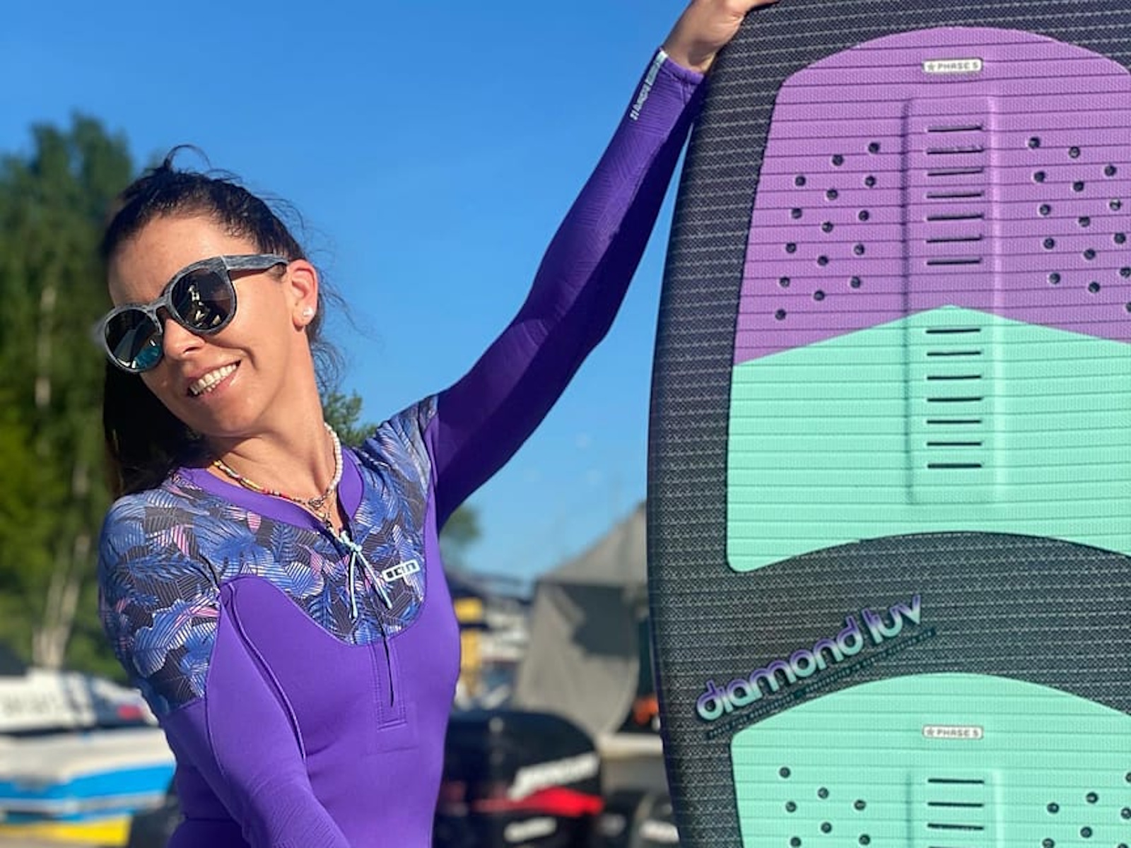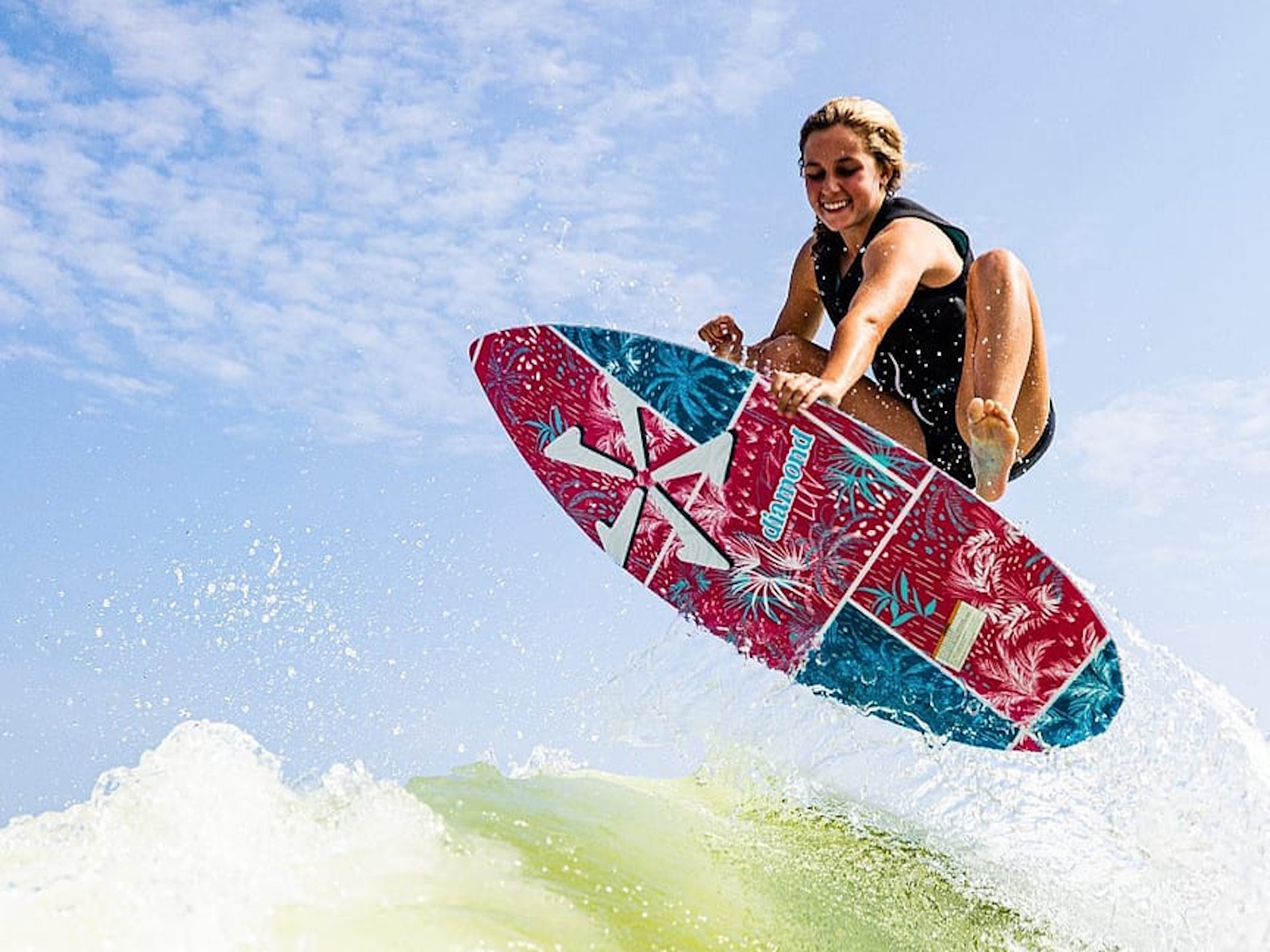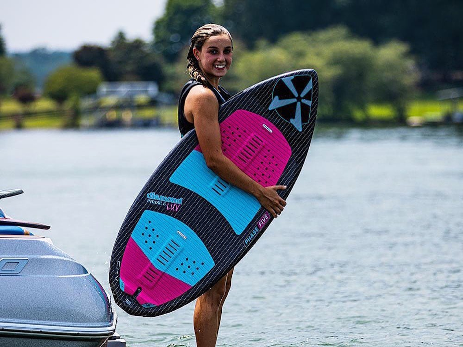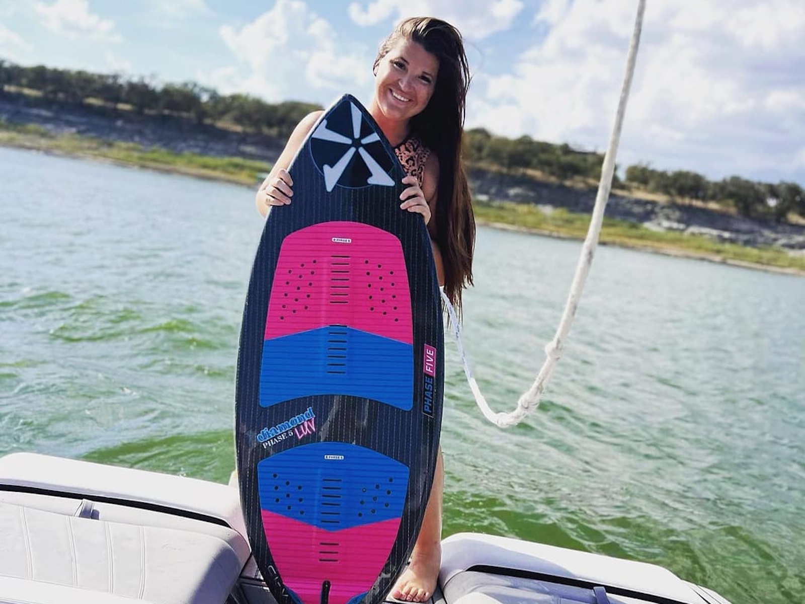 The Phase Five Diamond Luv Wakesurfer is the high-end answer to the ladies pushing their limits. The Luv is the same shape as the Diamond CL in a scaled down version made with the best materials. The diamond shaped tail maintains speed and generates tons of pop for boosting airs. The pulled in nose is forgiving and won't sink under water easily while carving or landing tricks. The Luv is built with our eye-catching CI-V™ (Carbon/Innegra Vertical Weave) material, and a single fin setup loaded with our 1” Skim Fin. This is tough LUV.