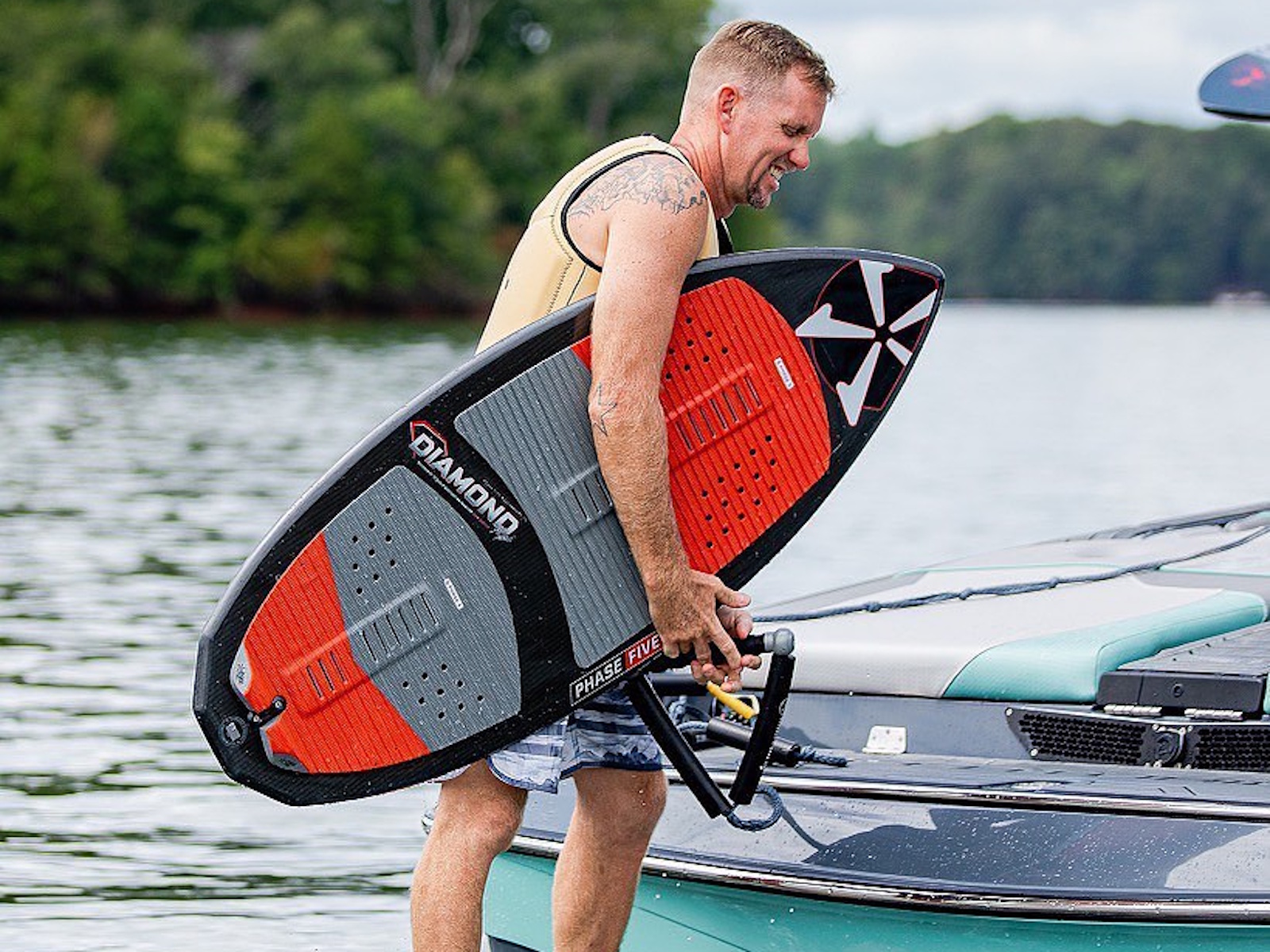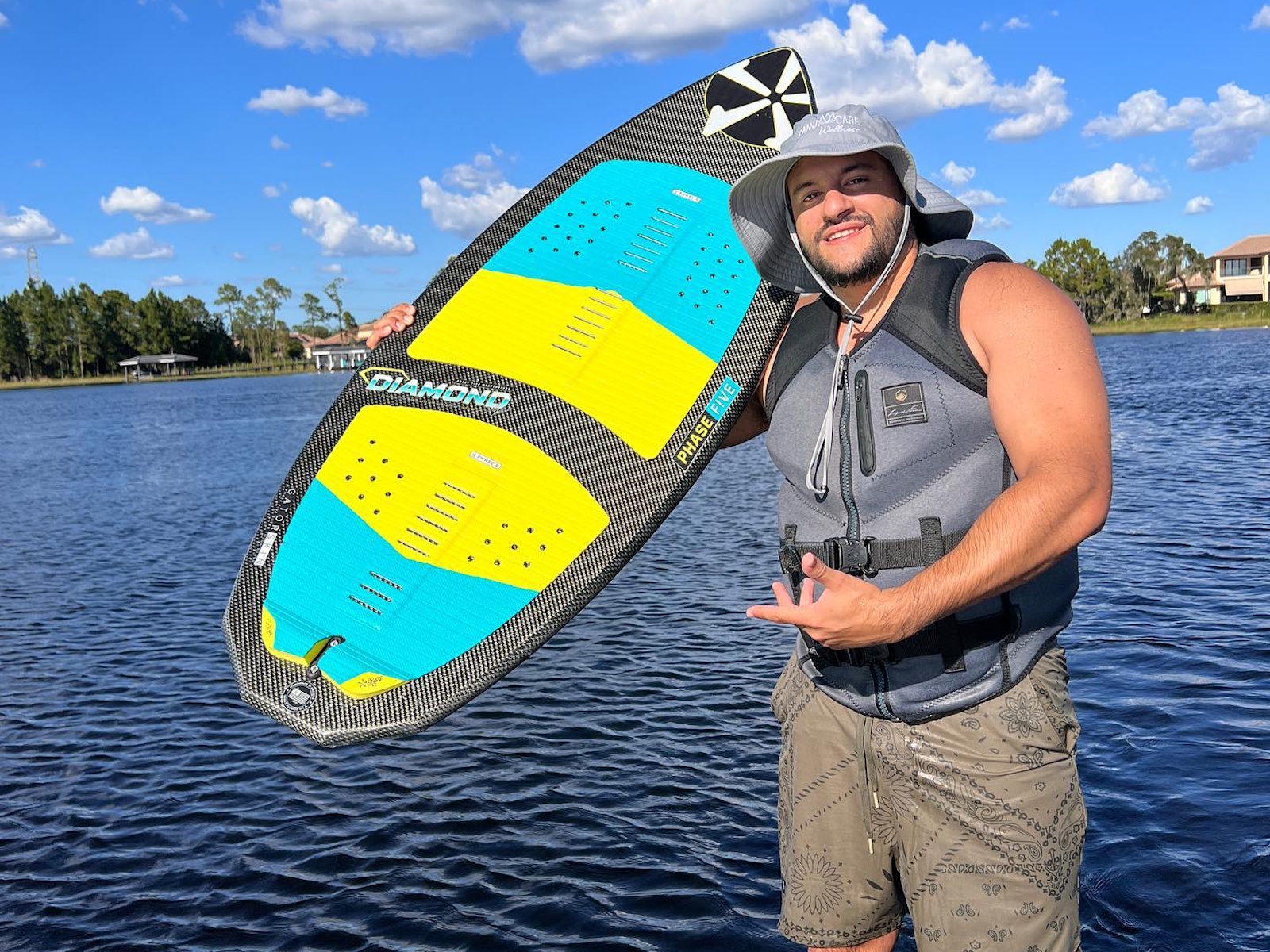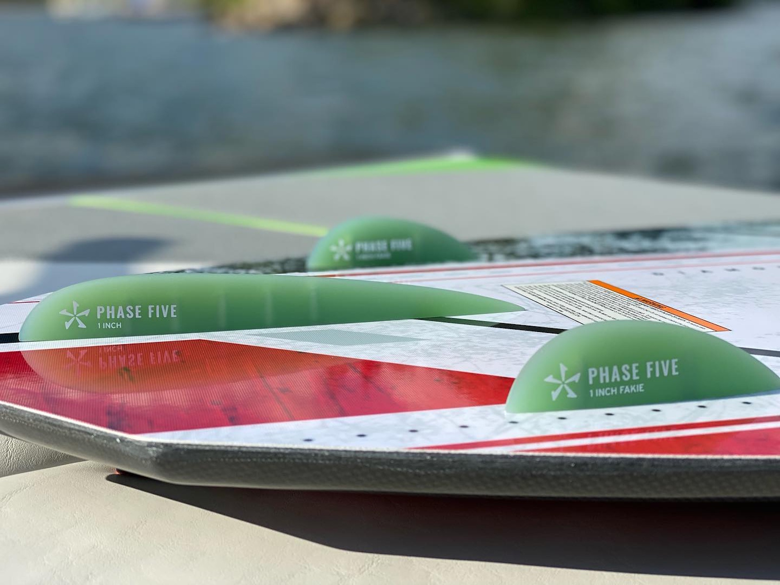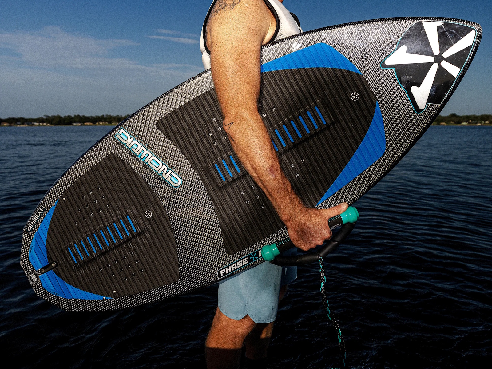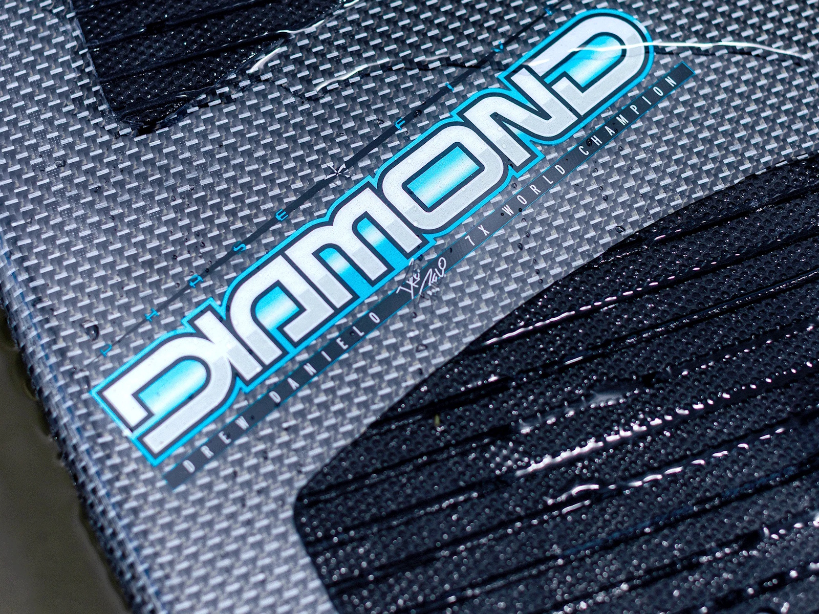 Drew Danielo wanted more pop and speed, and that is exactly what we created with the Phase Five Diamond Turbo Wakesurfer. We enhanced the original Diamond tail shape with a wider, more boxed out design. This upgraded design feature delivers experienced riders the opportunity to go big. The Turbo tail design is also the solution for large riders who need more push and surfers using smaller, less powerful waves. The Diamond Turbo is built using our unique Hybrid Carbon™ material for ultimate strength. We configured the Diamond Turbo with a three fin setup installed with our 1” Skim Fin (2” on the 57”) in the center accompanied by 1” Fakie Skim fins on the outside.