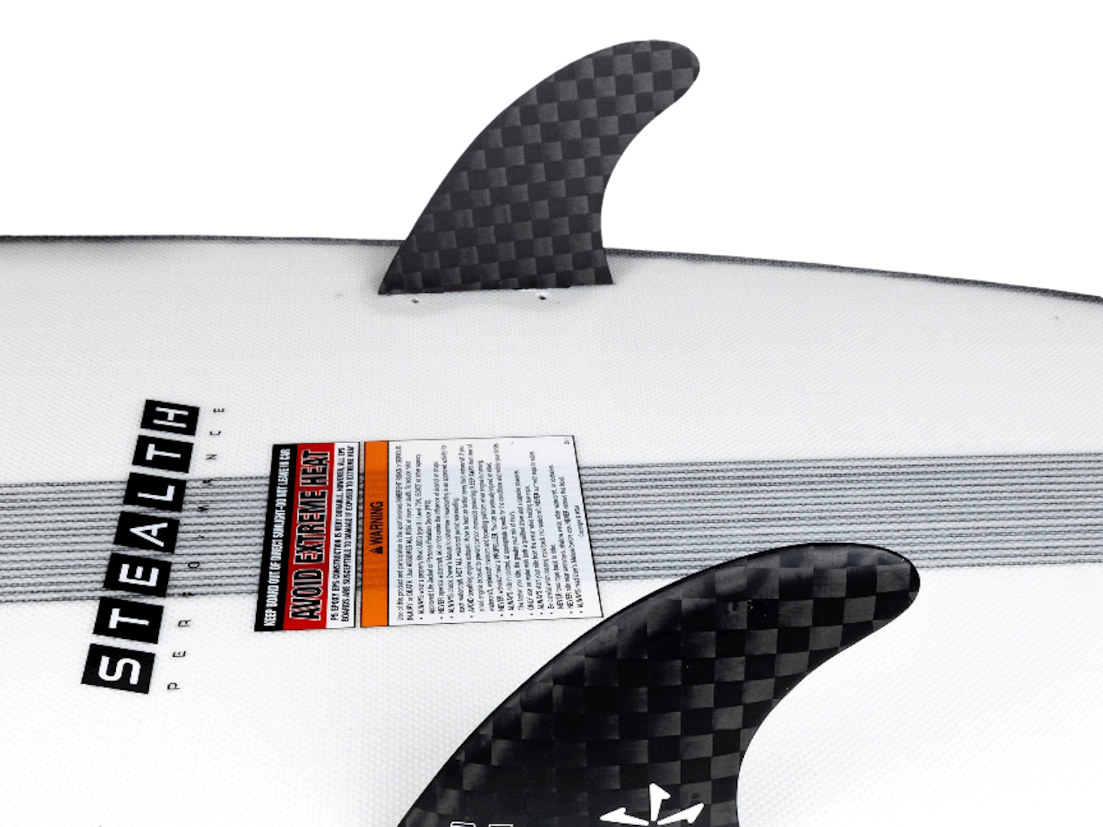 The Stealth construction is our newest surf style build that introduces basalt into our lineup. This layup schedule includes a full basalt/innegra top weave reinforced with a carbon stringer and tail patches. The bottom is a full Innegra sheet reinforced with a carbon stringer. It is the strongest layup schedule that we have to date in the lineup and it doesn’t sacrifice any performance. The Stealth build provides great pop and a lively feel under the rider’s feet. This build is only offered on our top “Performance” shapes.