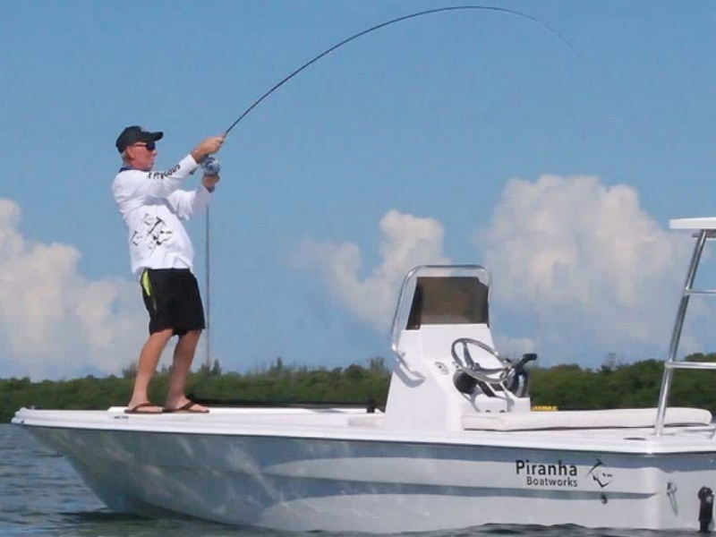The New F2000 is a 19’ 6″ Flats/Bay boat that provides a smooth, dry ride. It has a V hull that flattens out to a 7 degree deadrise at the transom, making it an extremely stable fishing platform. Walk the gunnels or stand on the edge and this fishing platform barely moves. It has four storage compartments: one large dry storage well forward and three insulated wells in the stern. Two of the rear wells are plumbed as a bait well and a release well. The third can either be dry storage or a cooler. The F2000 offers a larger platform to fish and have fun with the family. Take a bite out of a Piranha today!