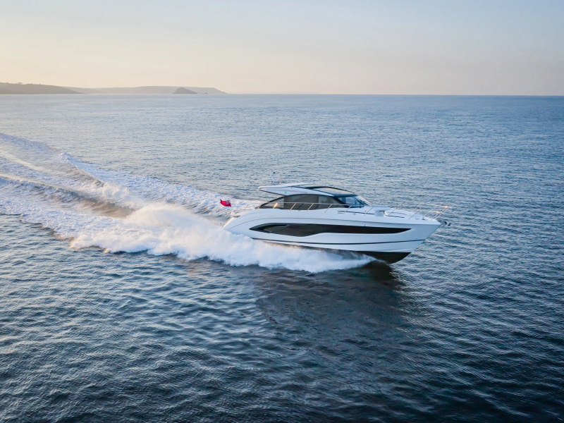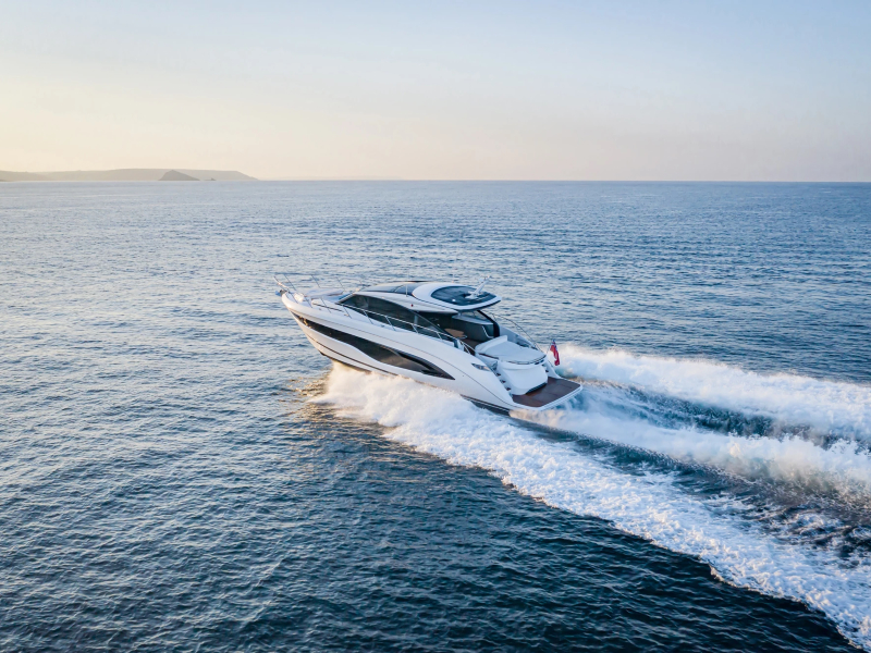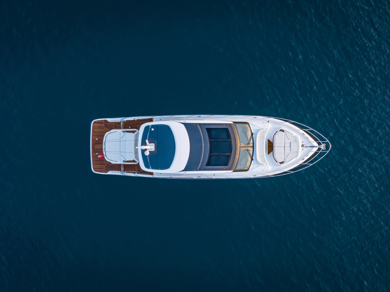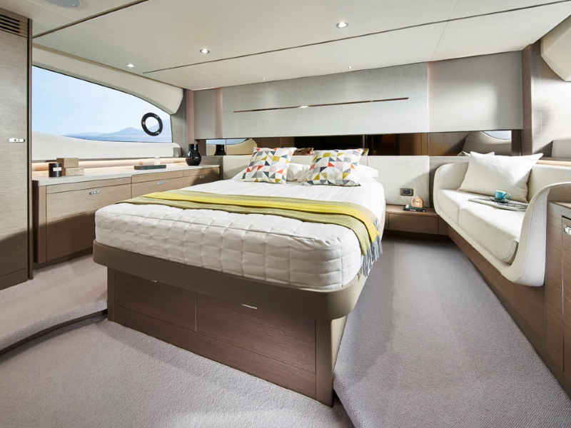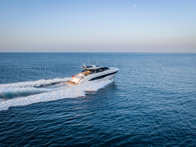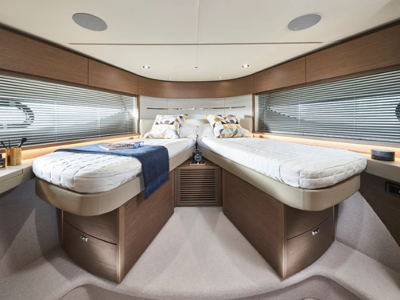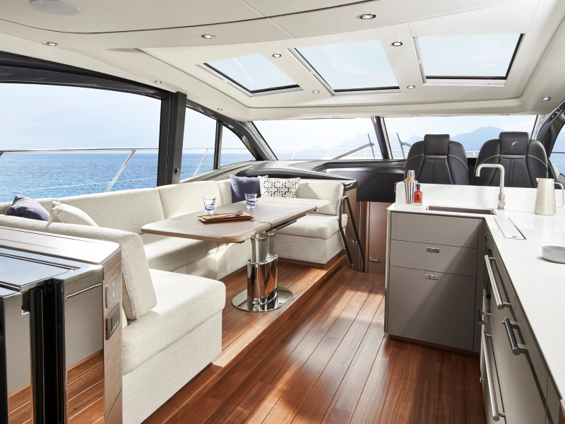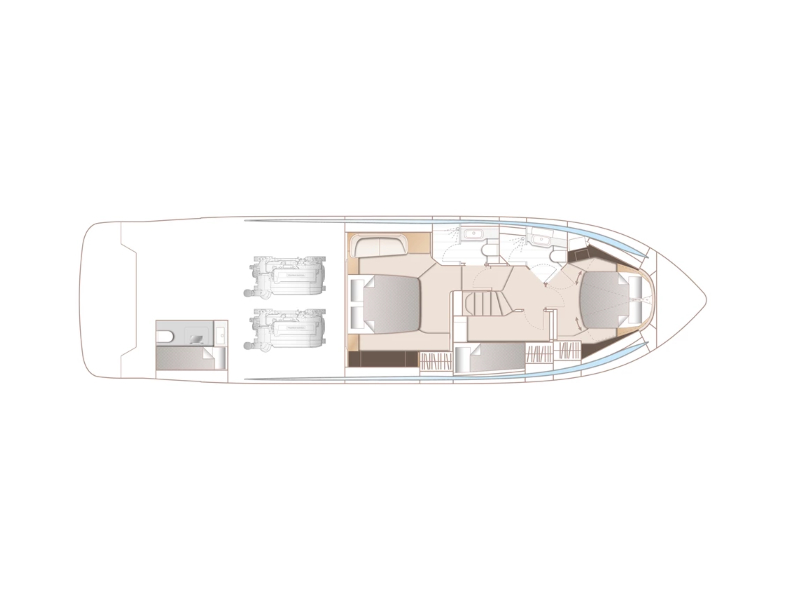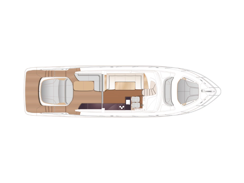 Her main deck has been purposely designed for those who enjoy true open-boating. The expansive cockpit features a large L-shaped seating area with additional seating aft around a substantial folding teak table served by a wetbar opposite with electric barbecue. This area connects to the saloon via a drop down sliding door and opening window aft of the galley, seamlessly integrating the two living areas as required. Her main deck also boasts a large sunpad located aft of the cockpit and a further foredeck seating and sunbathing area. With a top speed of 37 knots, she promises to deliver a powerful V Class sports yacht experience.