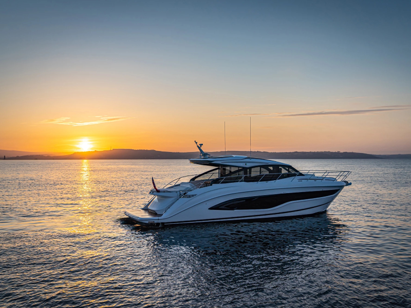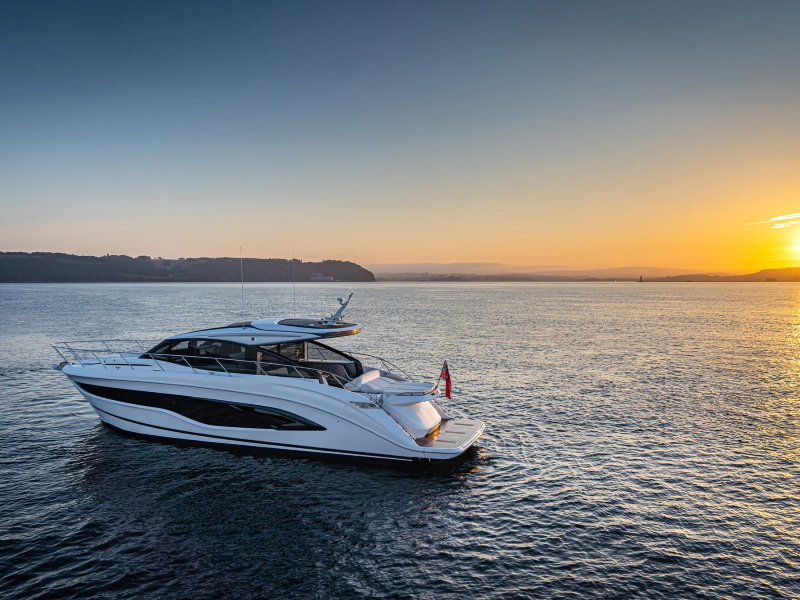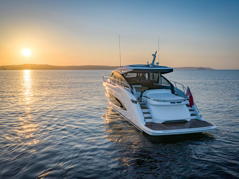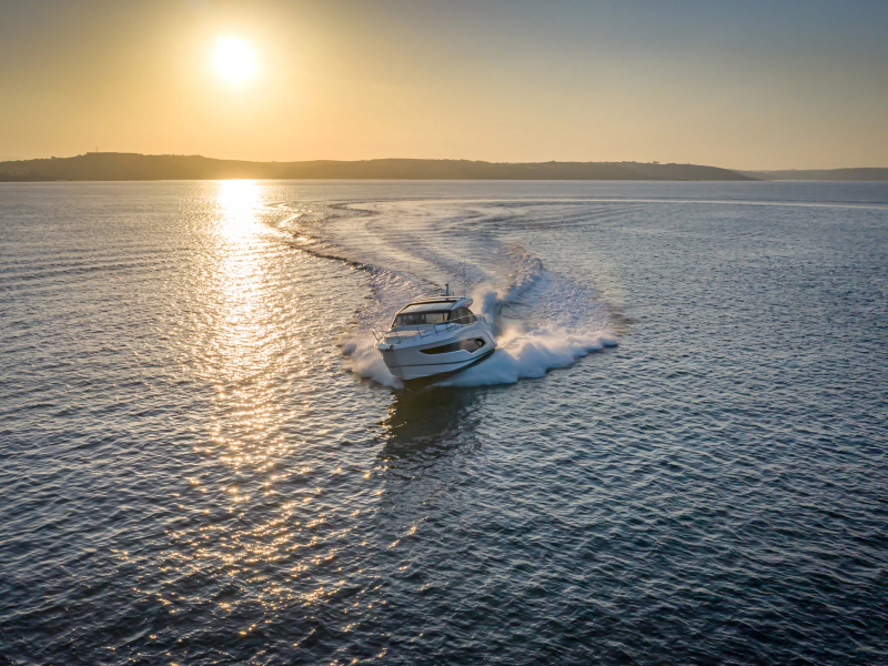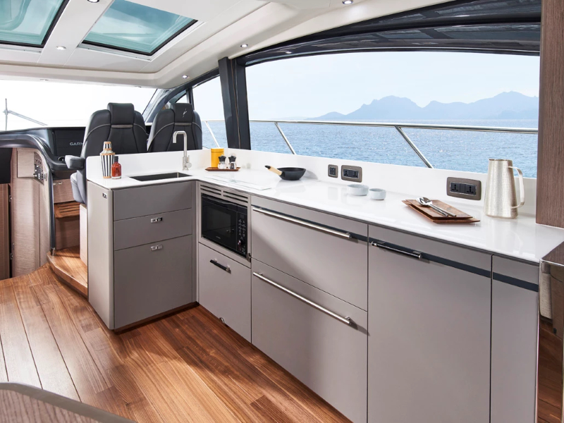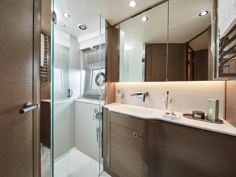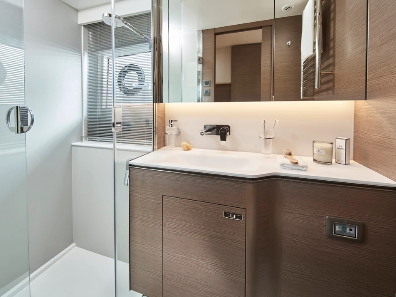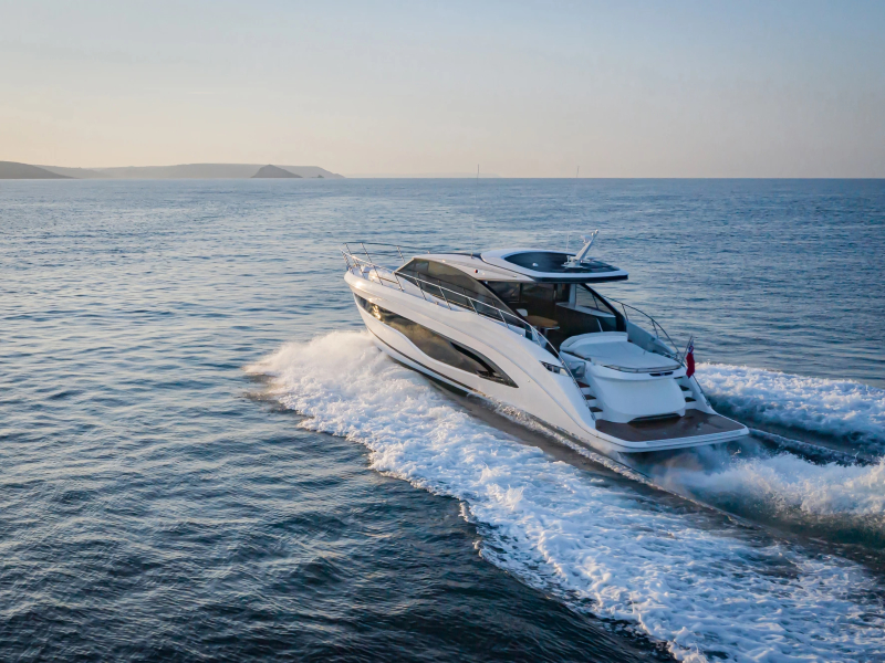 Her main deck has been purposely designed for those who enjoy true open-boating. The expansive cockpit features a large L-shaped seating area with additional seating aft around a substantial folding teak table served by a wetbar opposite with electric barbecue. This area connects to the saloon via a drop down sliding door and opening window aft of the galley, seamlessly integrating the two living areas as required. Her main deck also boasts a large sunpad located aft of the cockpit and a further foredeck seating and sunbathing area. With a top speed of 37 knots, she promises to deliver a powerful V Class sports yacht experience.
