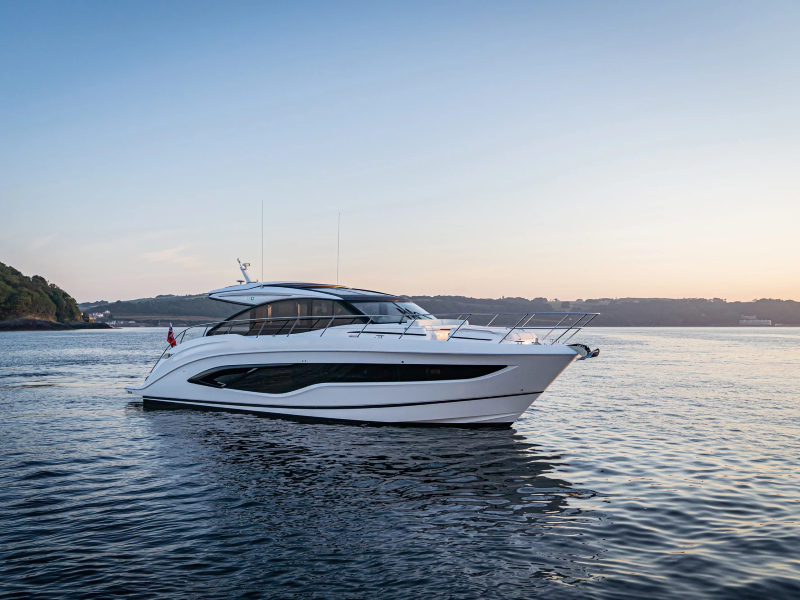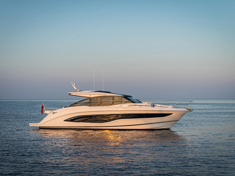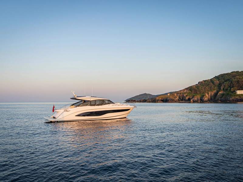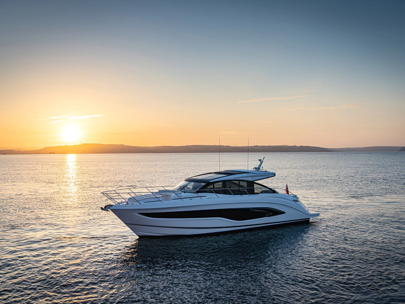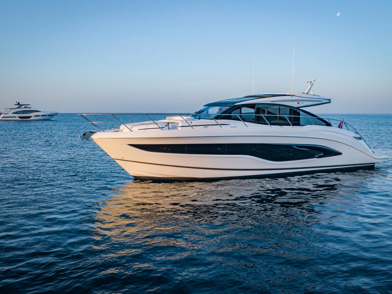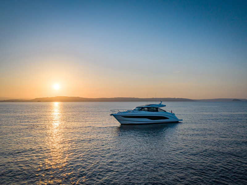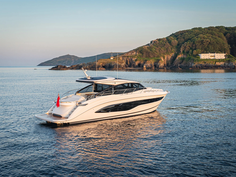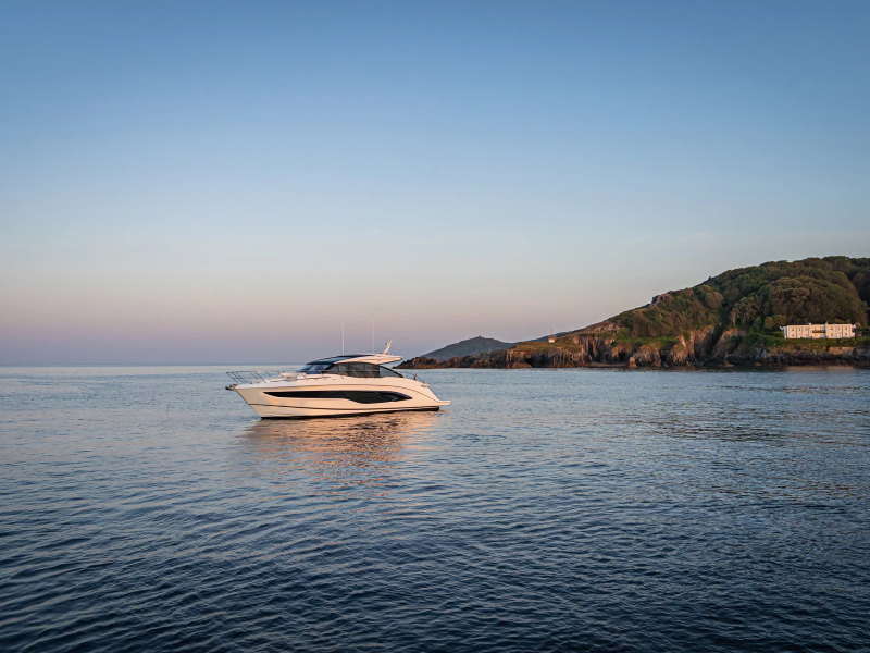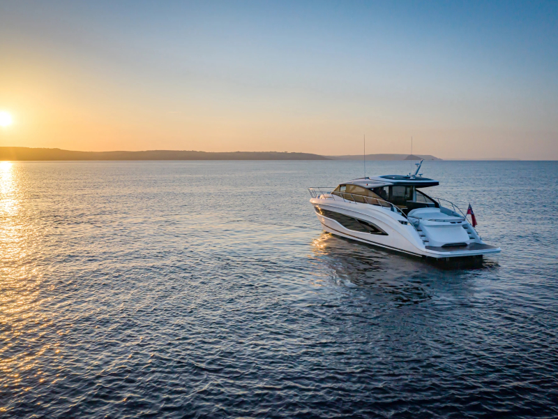 Her main deck has been purposely designed for those who enjoy true open-boating. The expansive cockpit features a large L-shaped seating area with additional seating aft around a substantial folding teak table served by a wetbar opposite with electric barbecue. This area connects to the saloon via a drop down sliding door and opening window aft of the galley, seamlessly integrating the two living areas as required. Her main deck also boasts a large sunpad located aft of the cockpit and a further foredeck seating and sunbathing area. With a top speed of 37 knots, she promises to deliver a powerful V Class sports yacht experience.