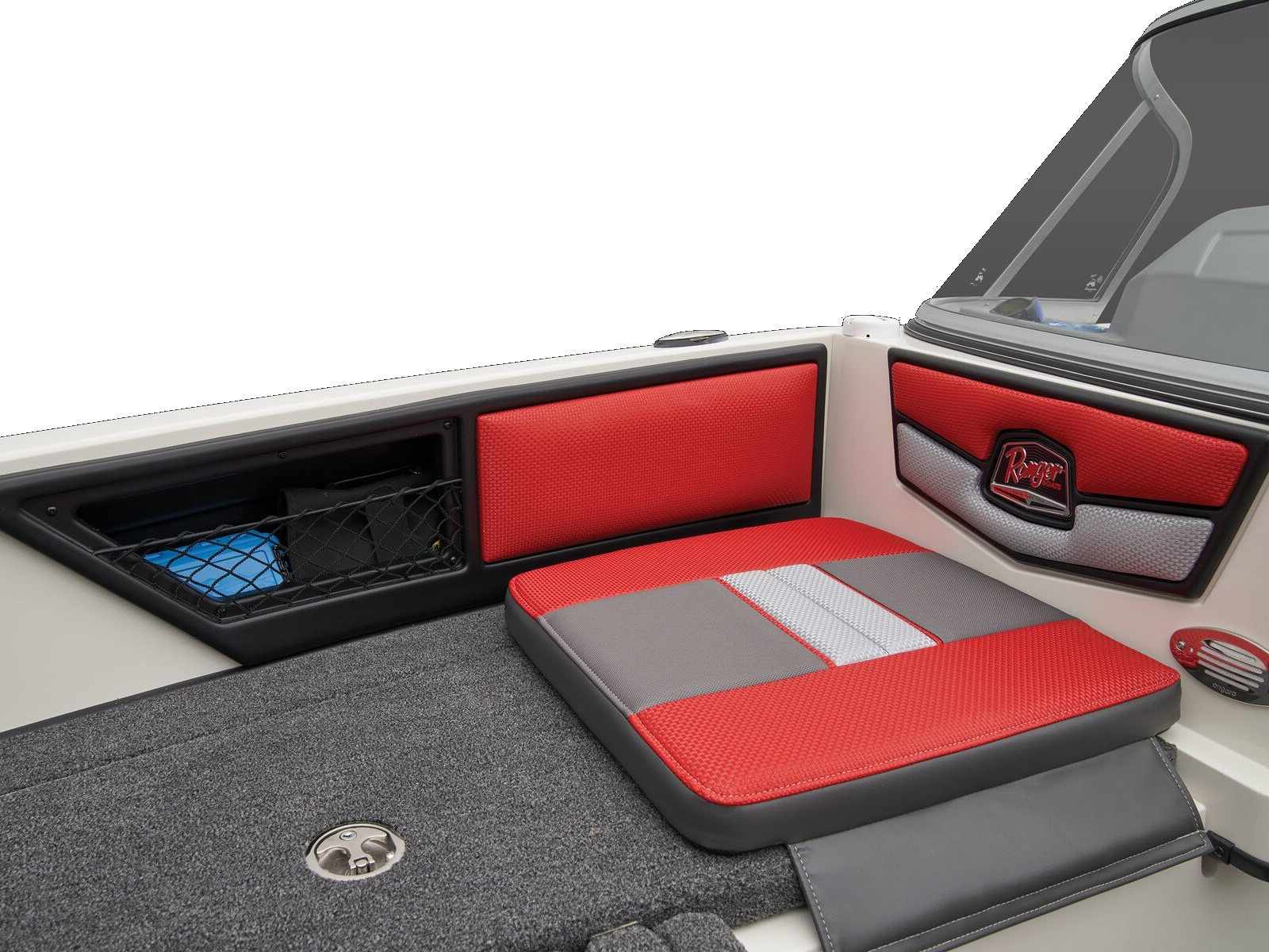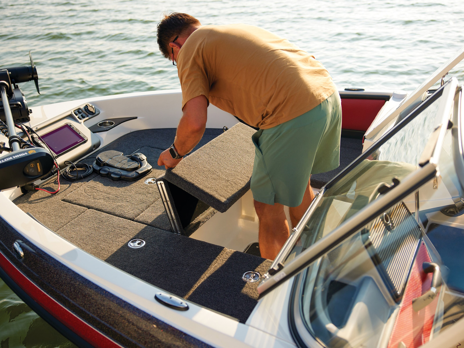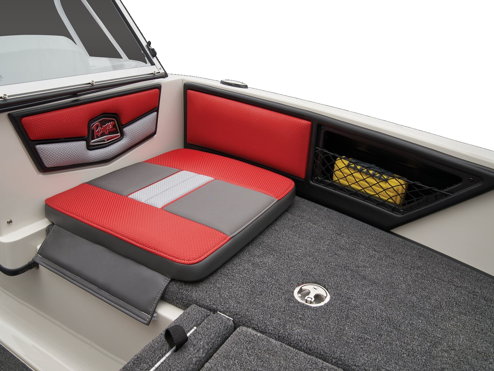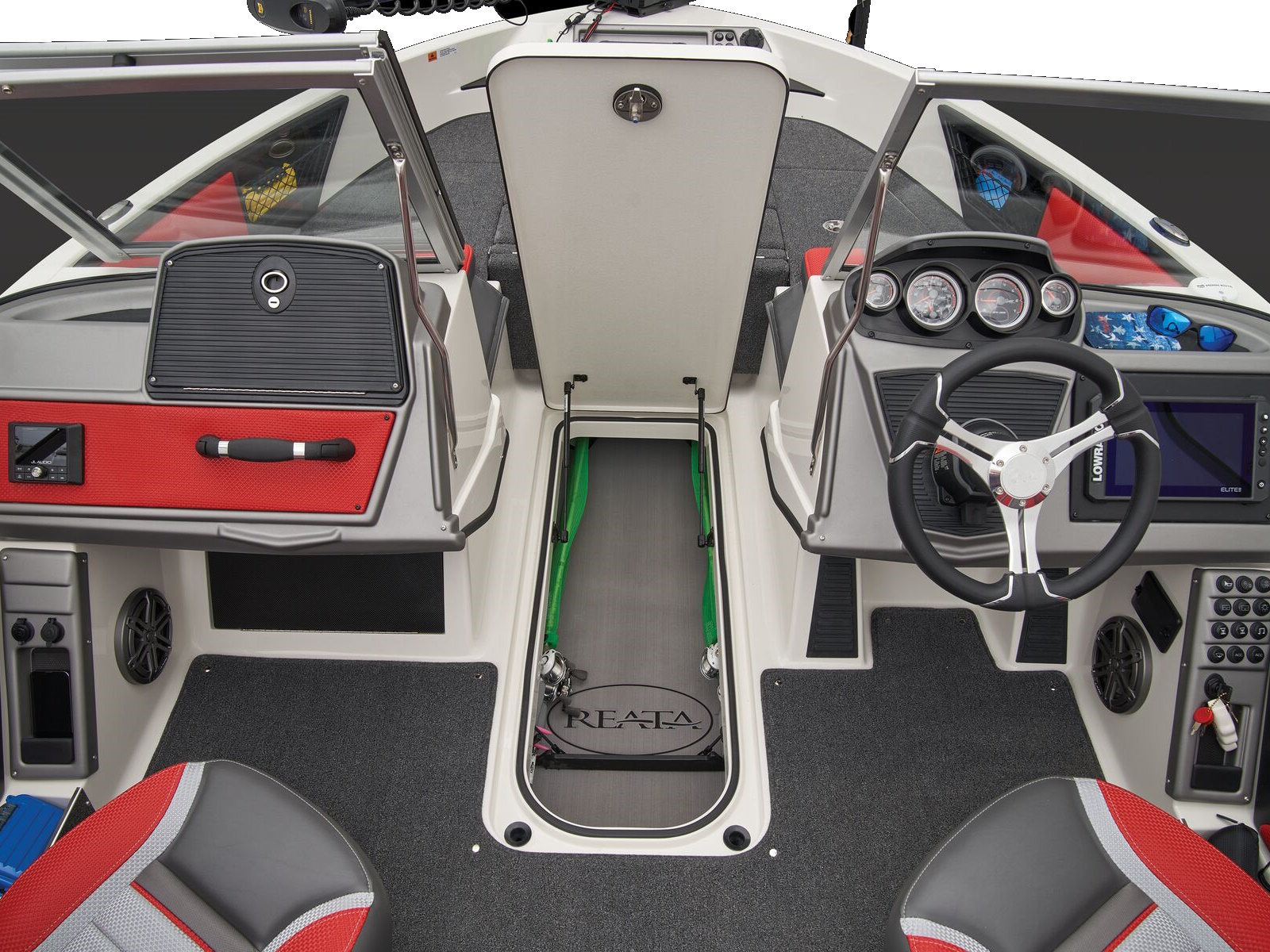 In the cockpit floor is a ski stow that doubles as a rod locker. Beneath the passenger console is a drop-down tackle tray, and the front deck hosts a wealth of dry storage with an insulated cooler and baitwell. The patented folding deck extension is a winner whether you’re cruising or casting and padded forward gunnels and deck cushions expand seating options. Concealed in the back deck are a pair of jump seats and a divided, timed, and aerated livewell for the utmost in capability. No matter where you look, every inch of the Ranger Reata 1850MS is cleverly crafted for maximum versatility.